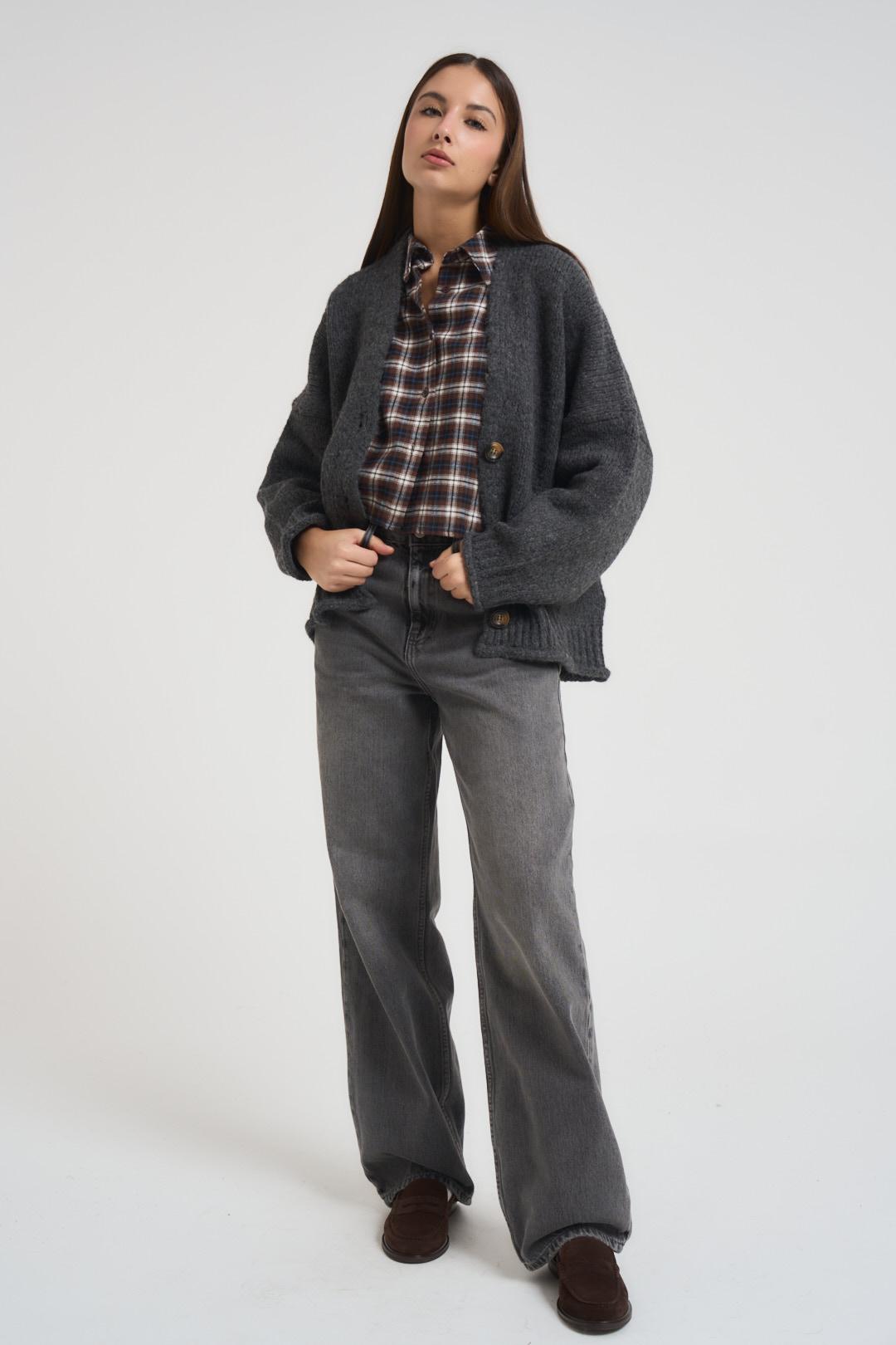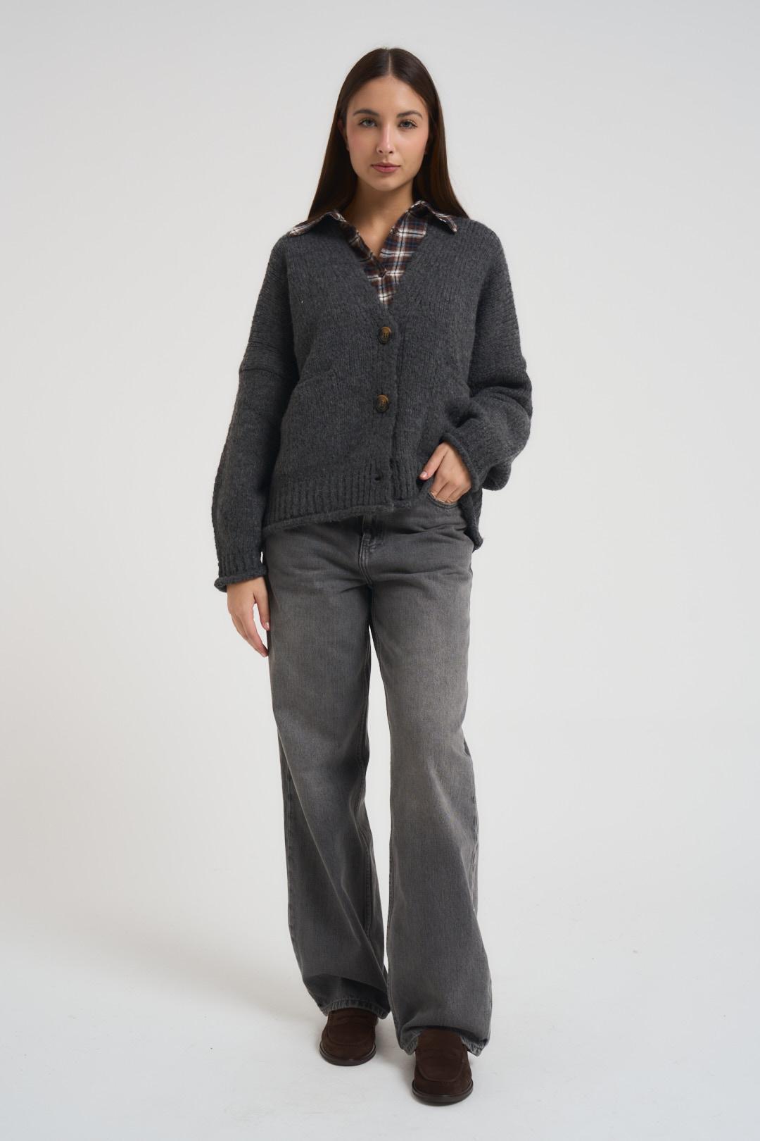 VICOLO Cardigan donna scollo a V grigio. Modello con 3 bottoni e doppia tasca a patta. Dettagli a costine. Composizione: 62% acrilica 18% poliestere 8% lana 8% viscosa 4% alpaca. La modella è alta 172 cm e indossa la taglia S.