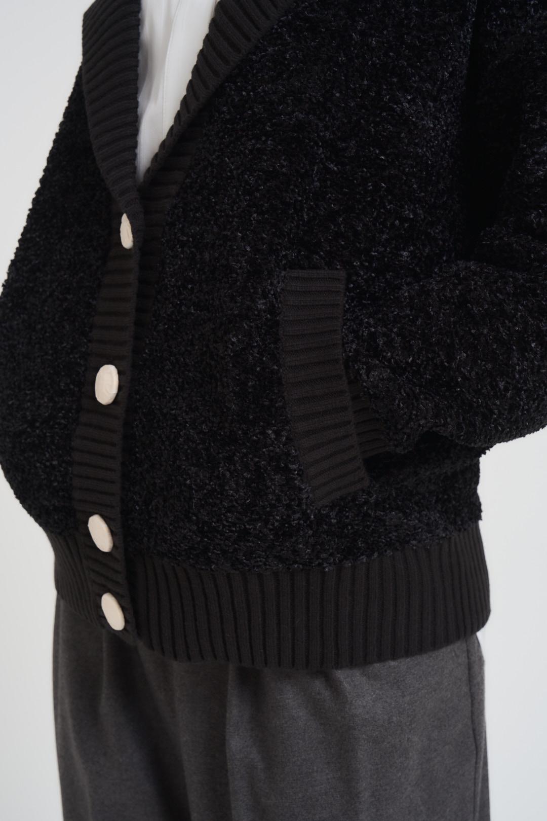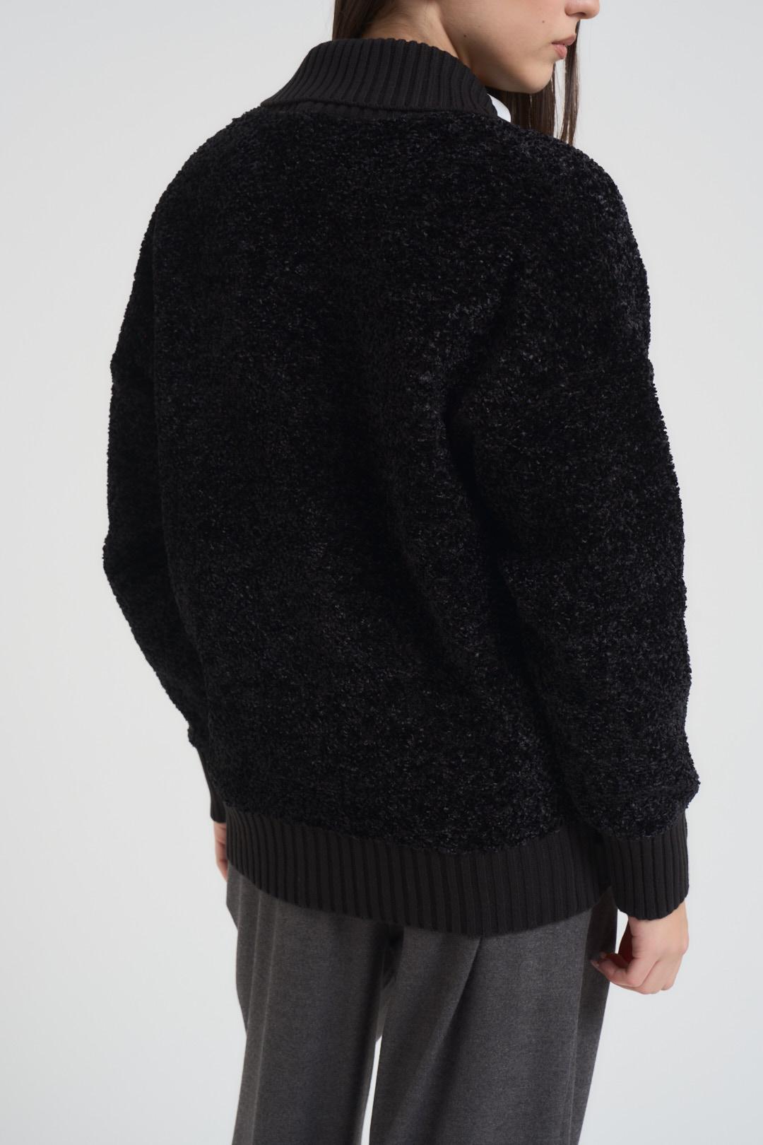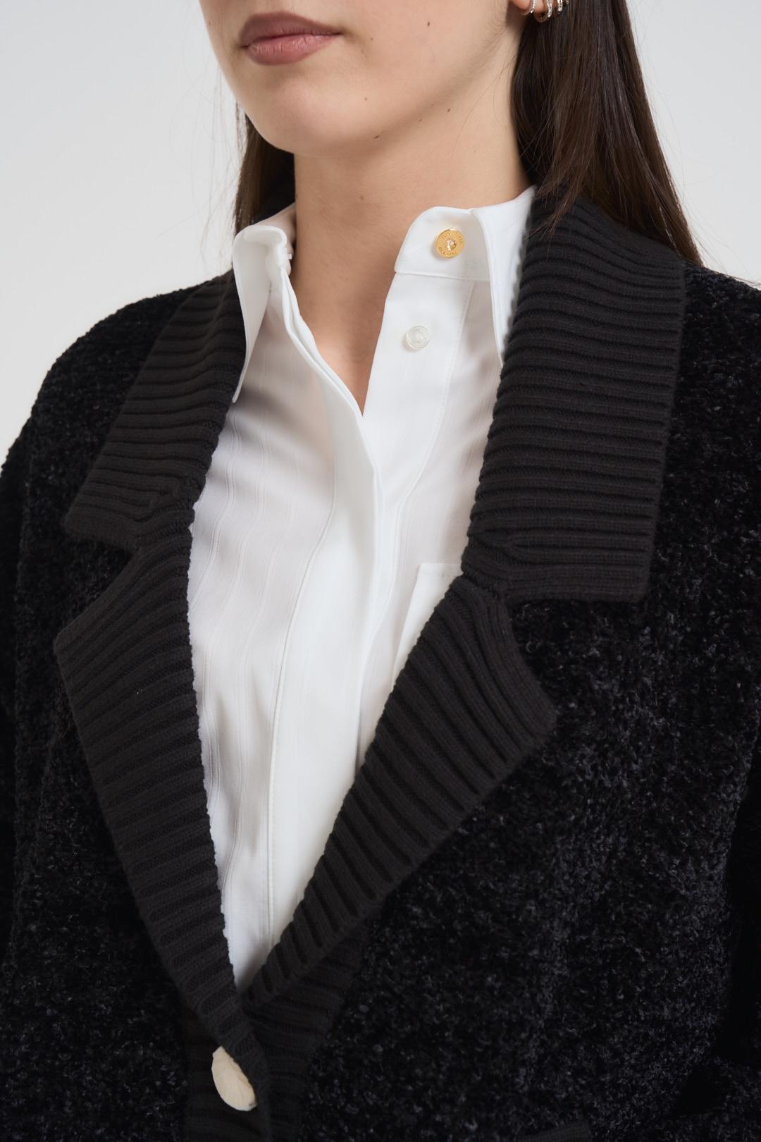 ELISABETTA FRANCHI Cardigan donna strutturato nero. Modello con bottoni in metallo dorato con logo, collo con rever e maniche lunghe rifinite a costine. Vestibilità over. Composizione:57% Poliestere 24% Cotone 16% Acrilico 3%Poliammide. La modella è alta 172cm e indossa la taglia 38.
