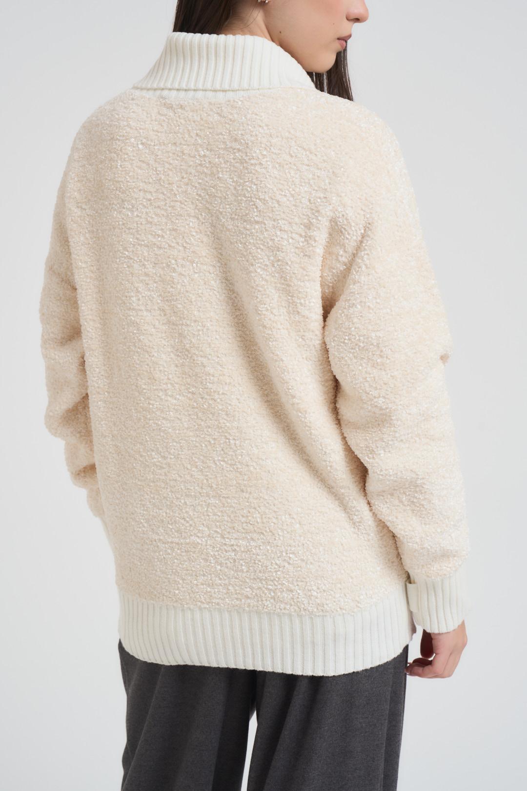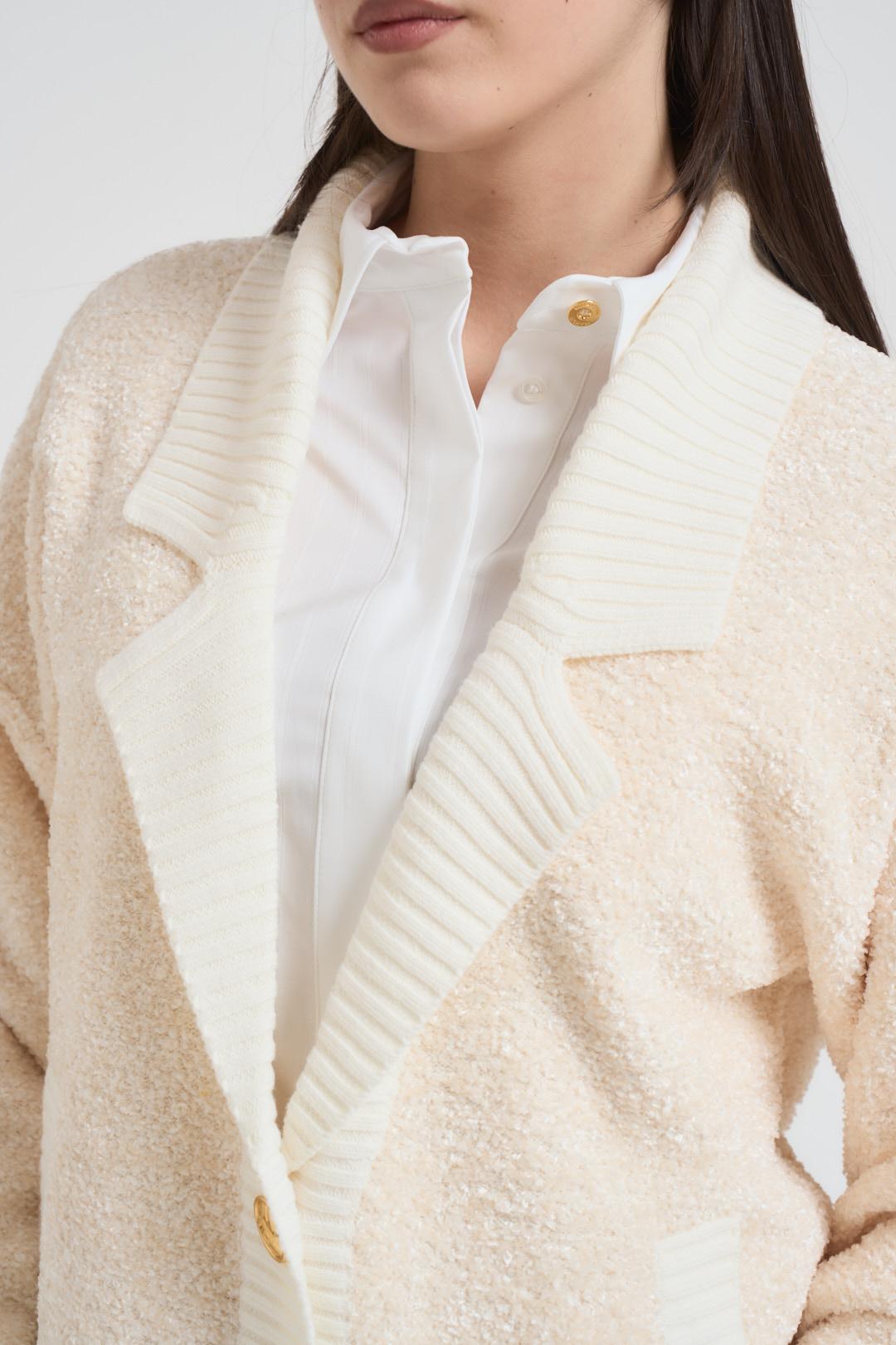 ELISABETTA FRANCHI Cardigan donna strutturato panna. Modello con bottoni in metallo dorato con logo, collo con rever e maniche lunghe rifinite a costine. Vestibilità over. Composizione:57% Poliestere 24% Cotone 16% Acrilico 3%Poliammide. La modella è alta 172cm e indossa la taglia 38.