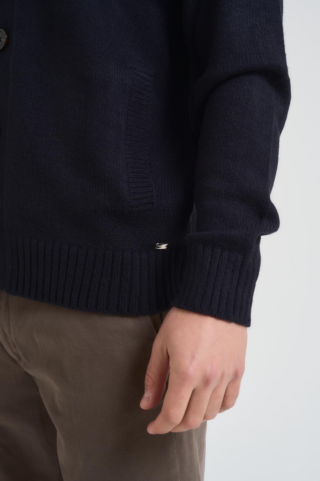 MARKUP Cardigan uomo con bottoni blu notte. Modello con chiusura frontale con bottoni, collo alto a coste e bordi elasticizzati su polsini e fondo. Vestibilità morbida. Due tasche laterali. Composizione: 70% acrilico, 30% lana. Il modello è alto 190 cm e indossa la taglia L.