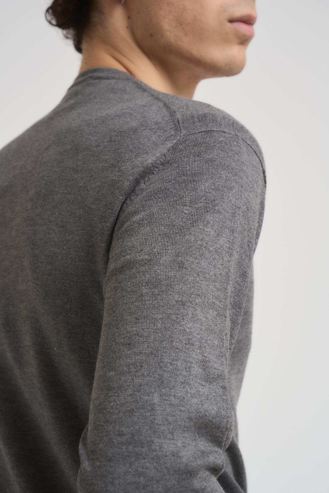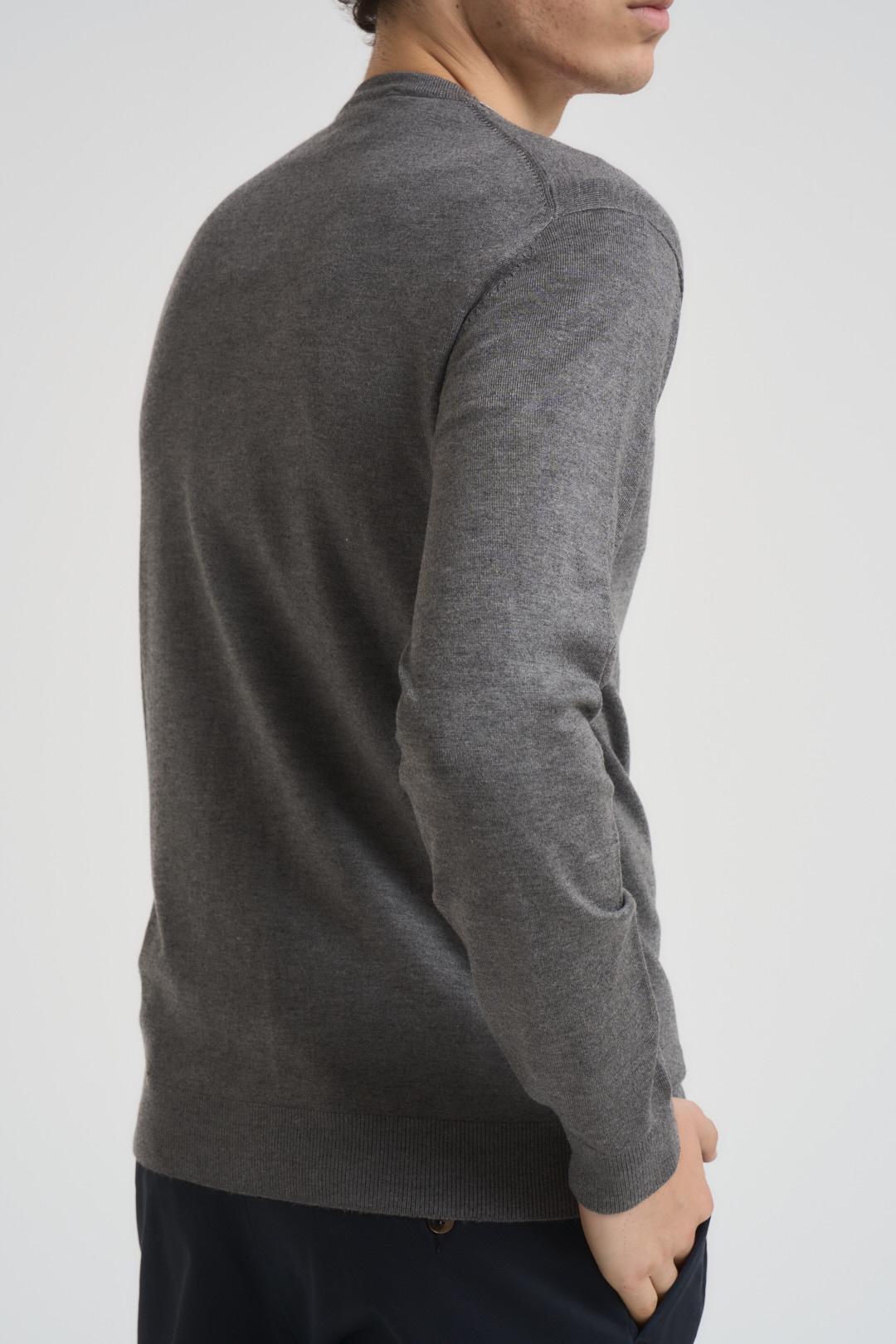 AGOEFILO Cardigan uomo grigio. Modello con scollo a V e chiusura con bottoncini neri. Composizione: misto lana e viscosa. Il modello è alto 190cm e indossa la taglia L.