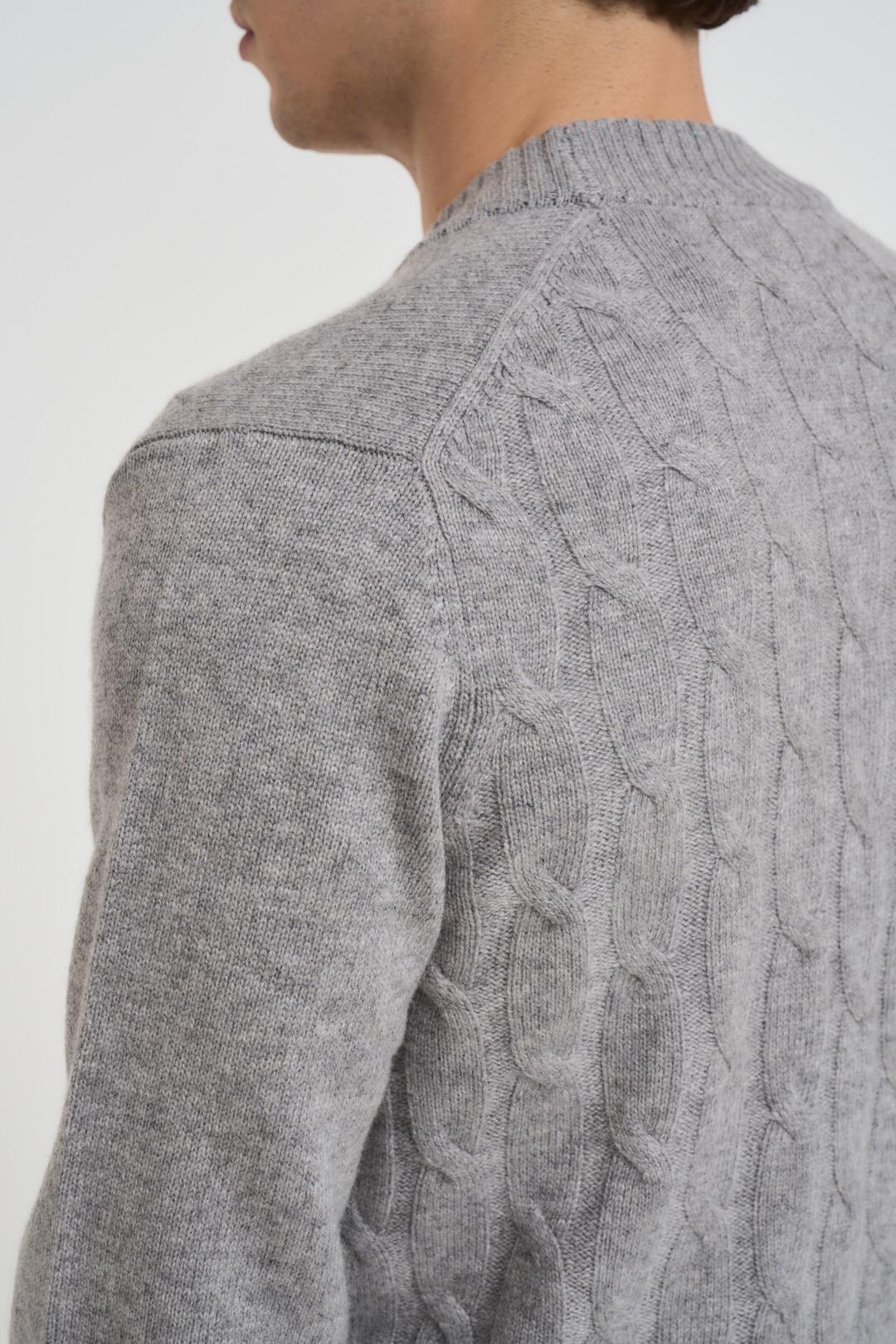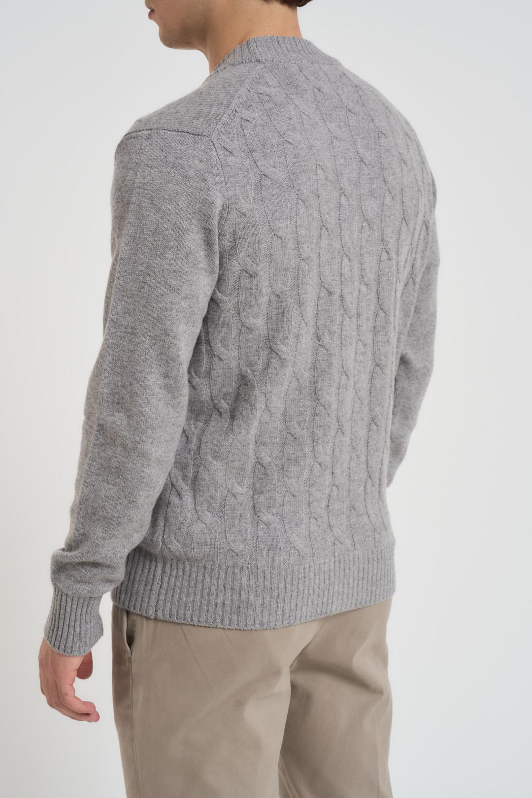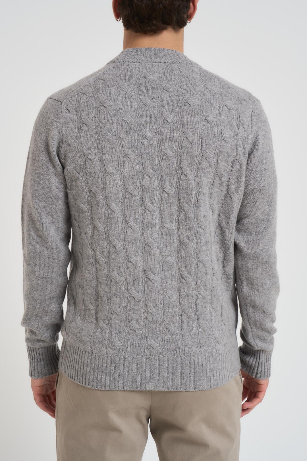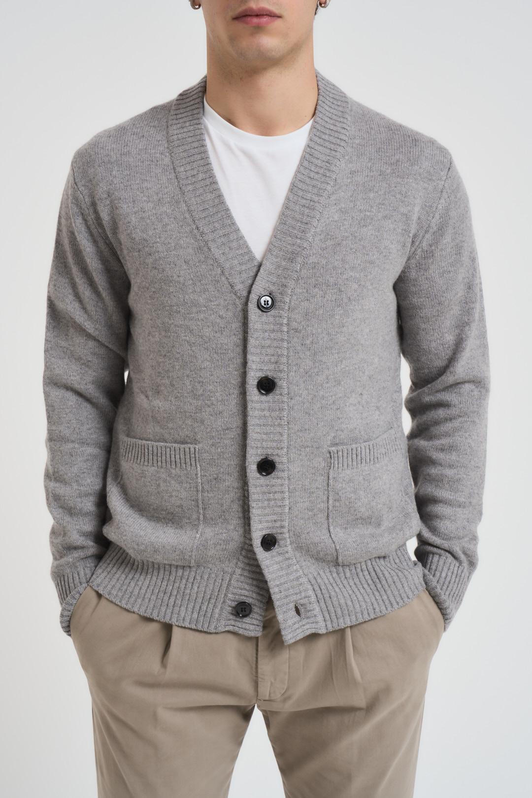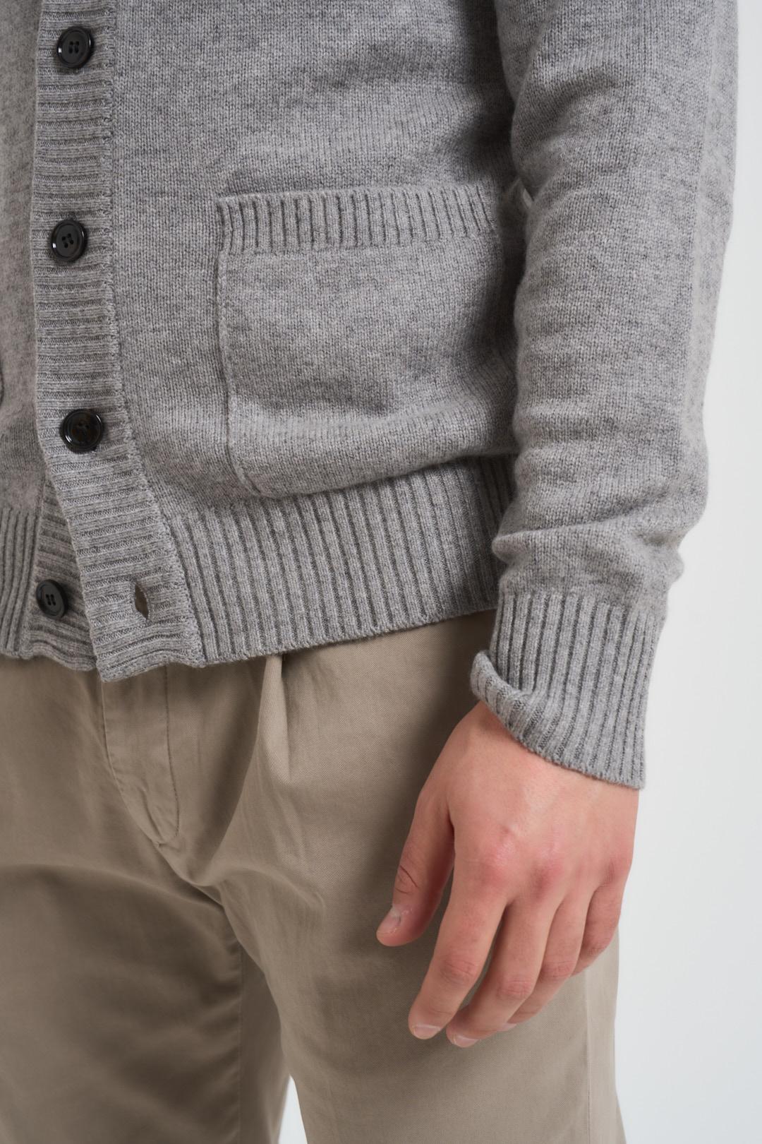 DIKTAT Cardigan uomo scollo a V grigio chiaro. Modello con retro a treccia e davanti in maglia liscia, chiusura con bottoni neri, due tasche a patta laterali, regular fit. Dettagli a costine. Composizione: 54% lana 29% viscosa 11%poliammide 6%cashmere. Il modello è alto 190cm e indossa la taglia L.