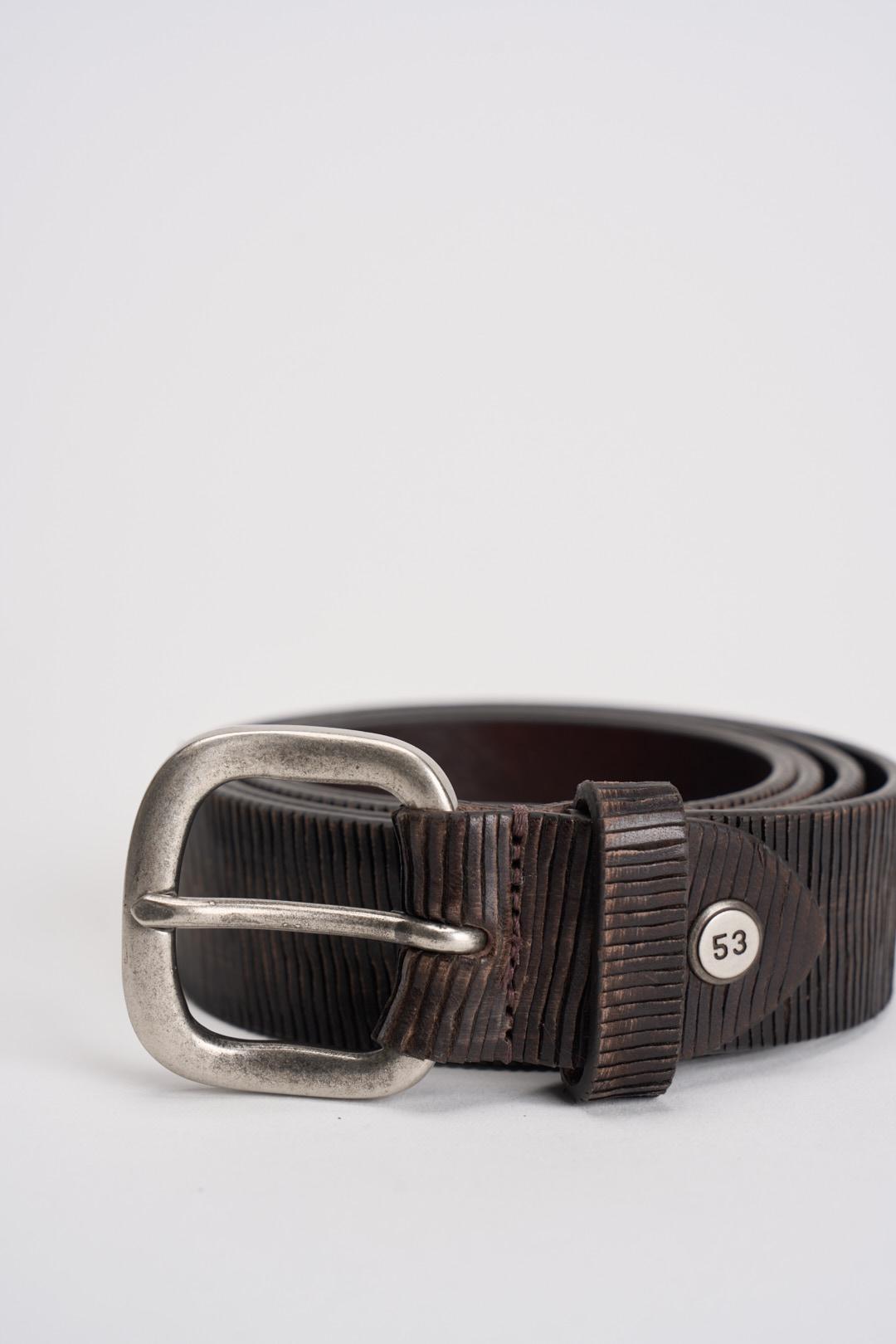 MINORONZONI Cintura uomo in pelle pitonata marrone. Modello con hardware argento.