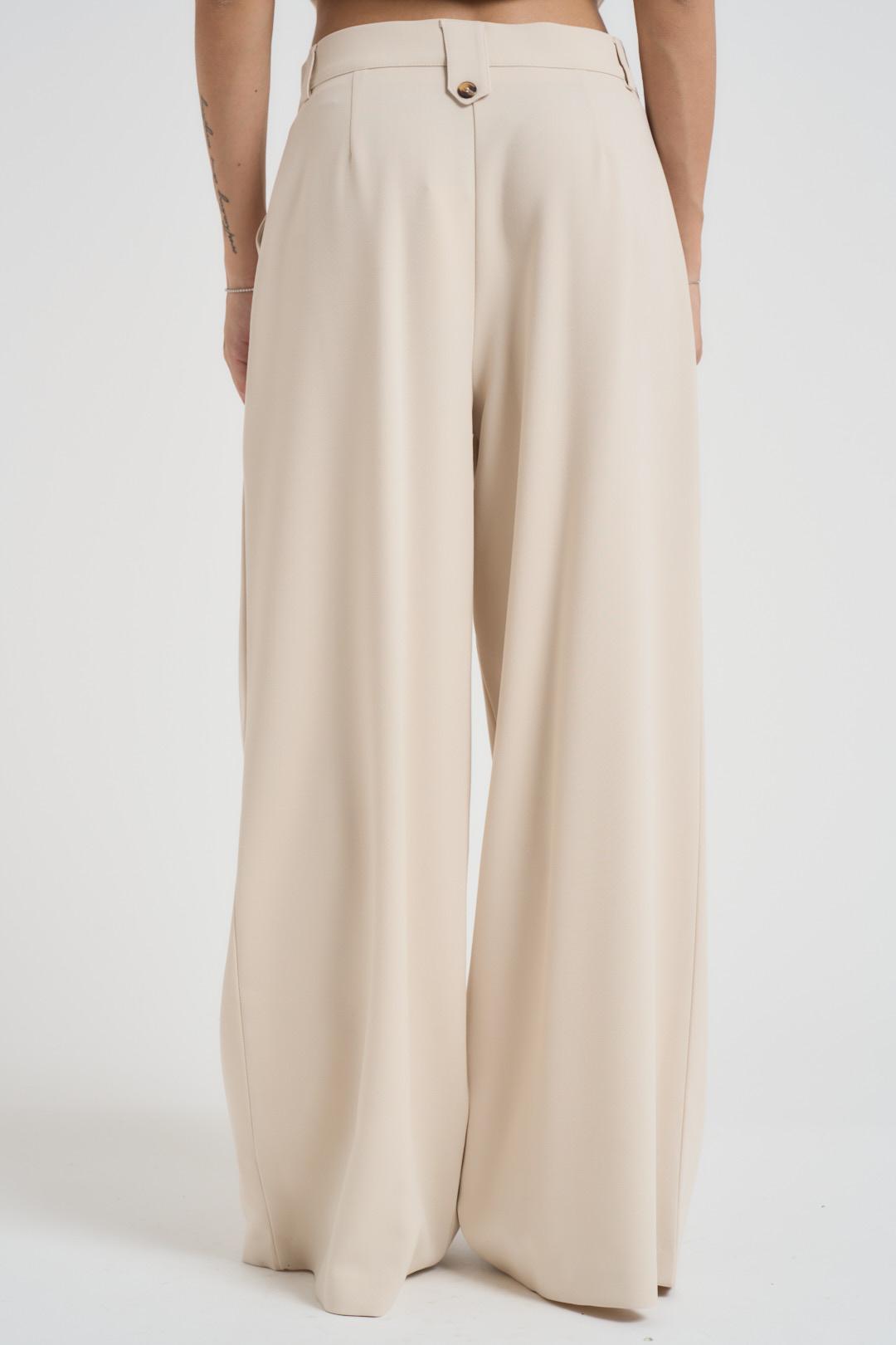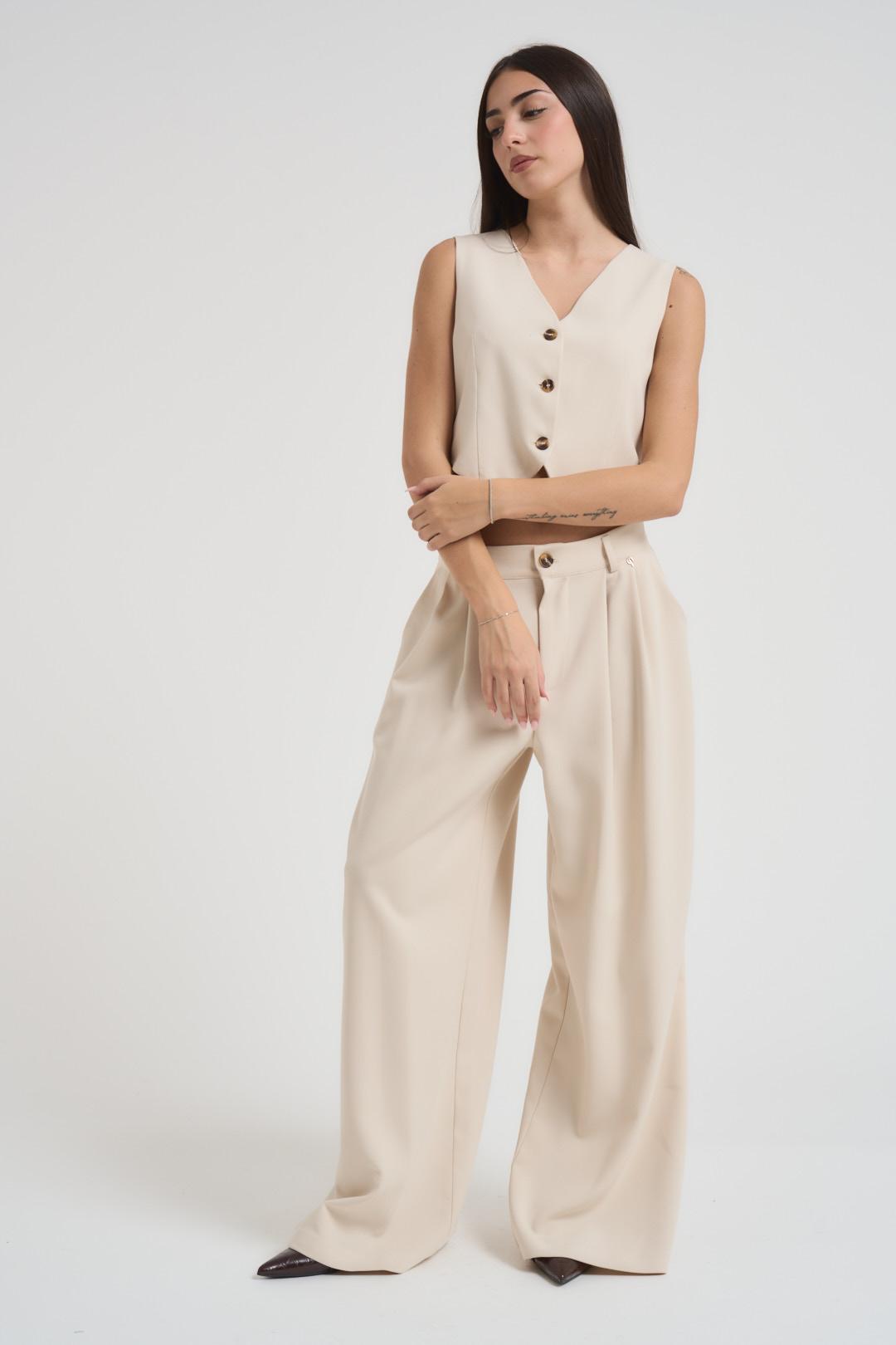 PHILIA Completo donna gilet e pantalone panna. Modello composto da gilet corto con scollo a V, chiusura a tre bottoni. Pantalone a palazzo over, due tasche a filetto, passanti in vita e chiusura con zip e bottone. Composizione: 58% viscosa, 35% poliestere, 7% elastan. La modella è alta 172 cm e indossa la taglia S.
