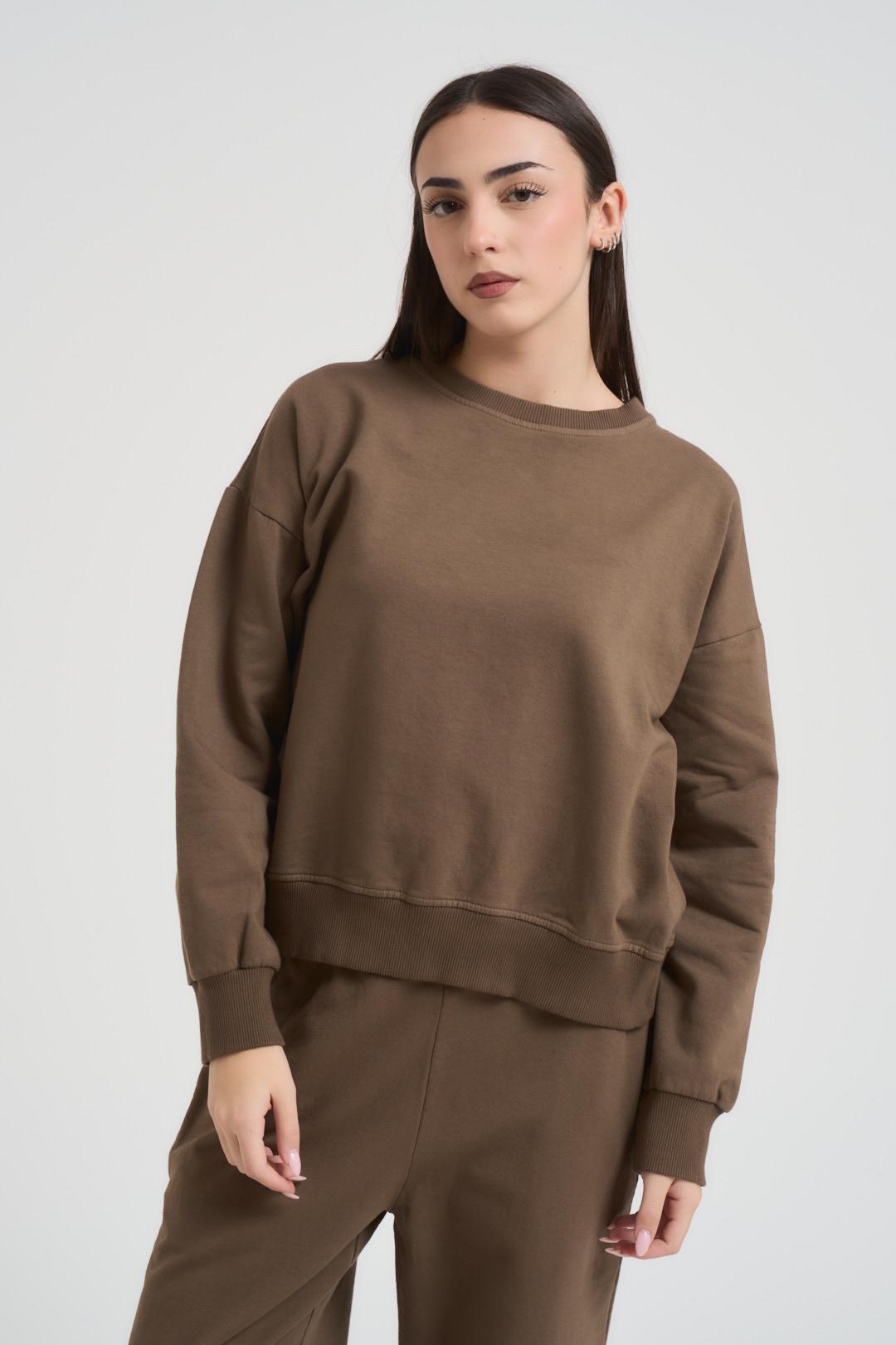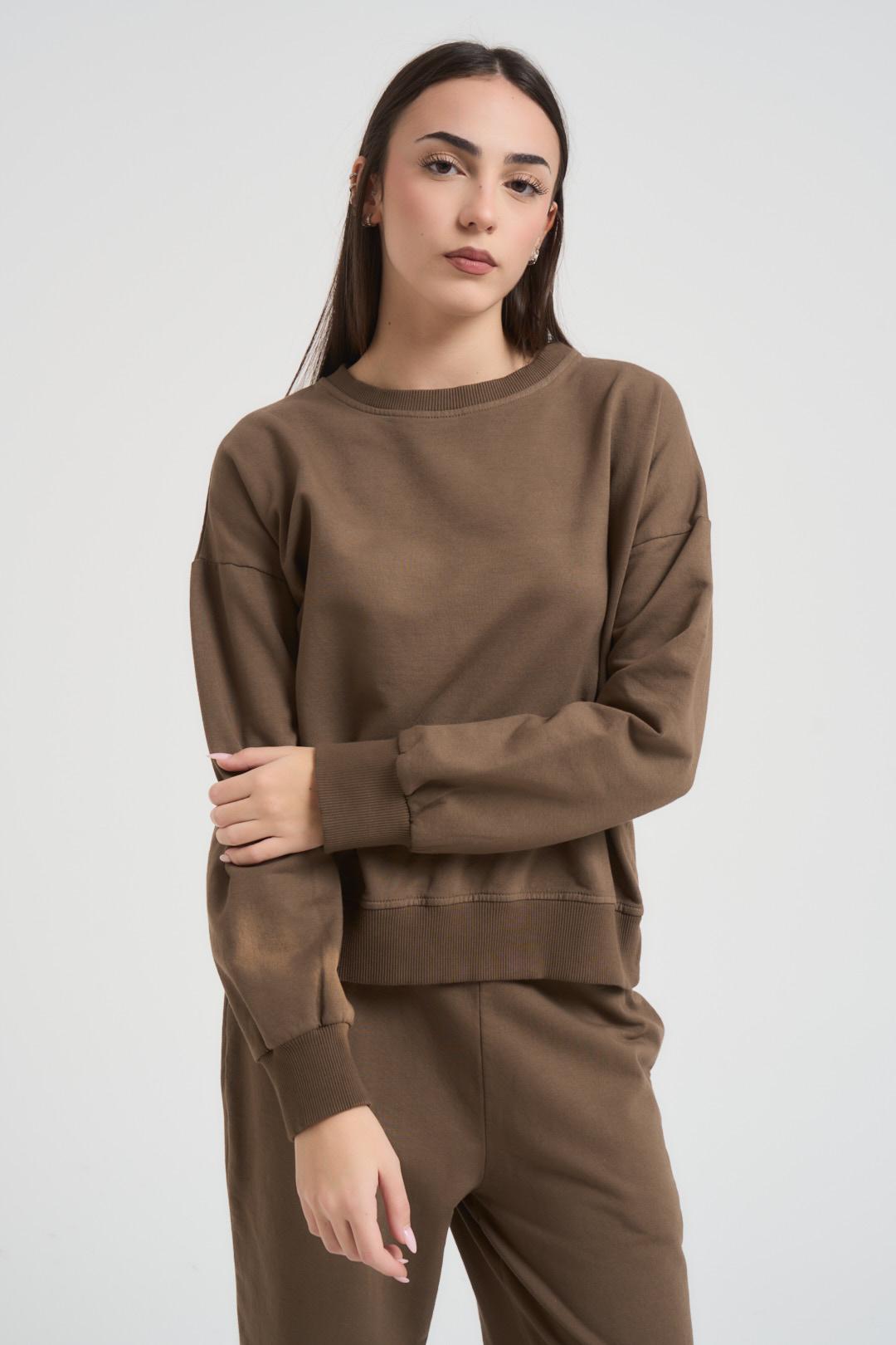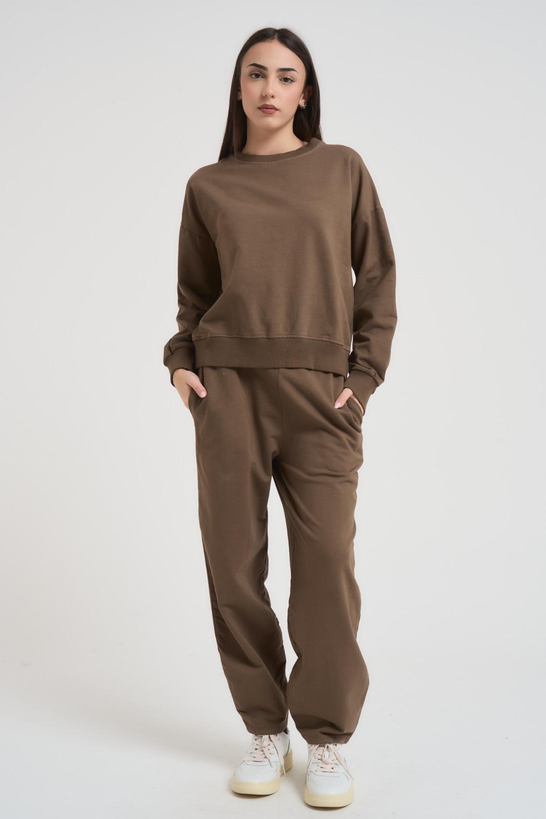 SUSY MIX Completo tuta donna marrone. Modello composta da felpa girocollo e pantalone a palazzo, regular fit. Composizione: 95%co 5%ea. La modella è alta 172 cm e indossa la taglia unica.