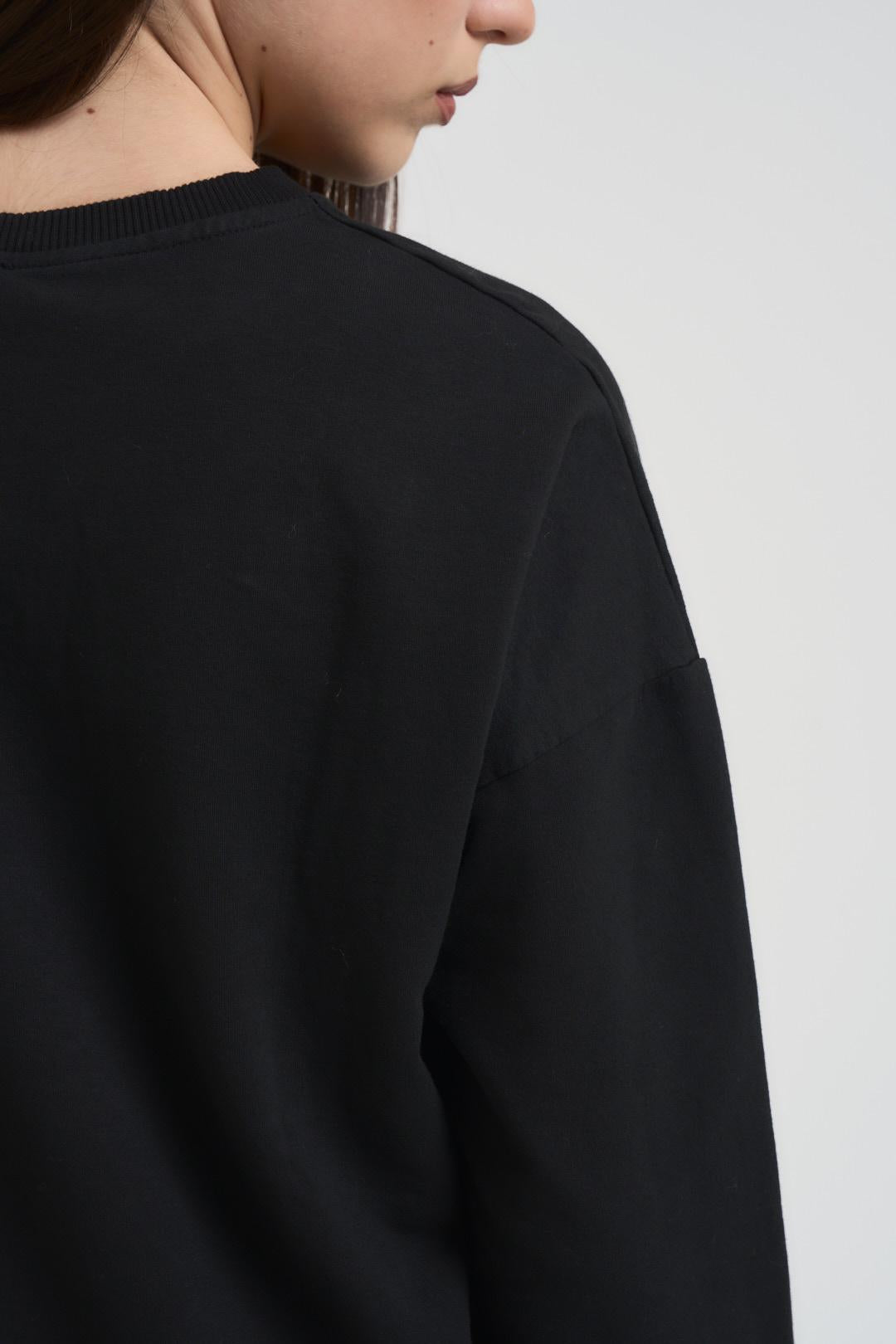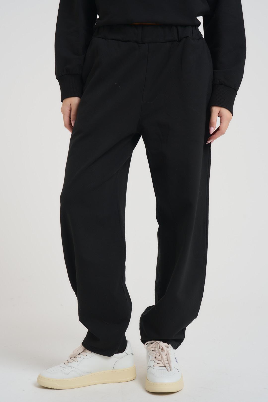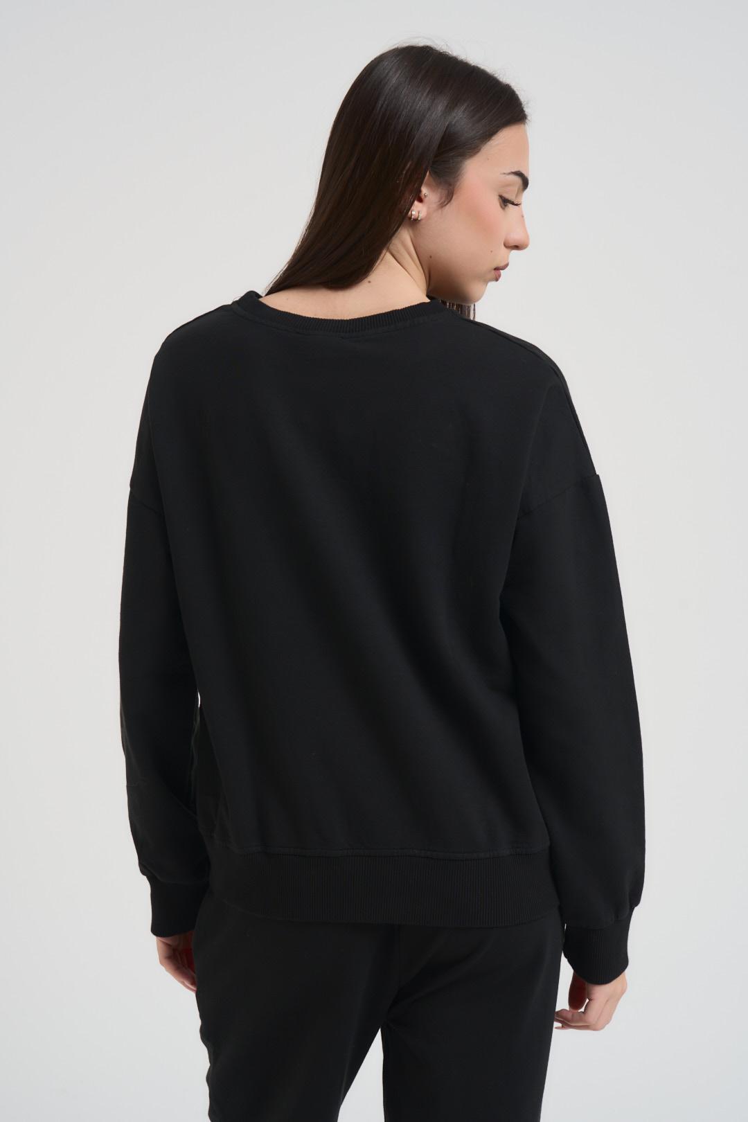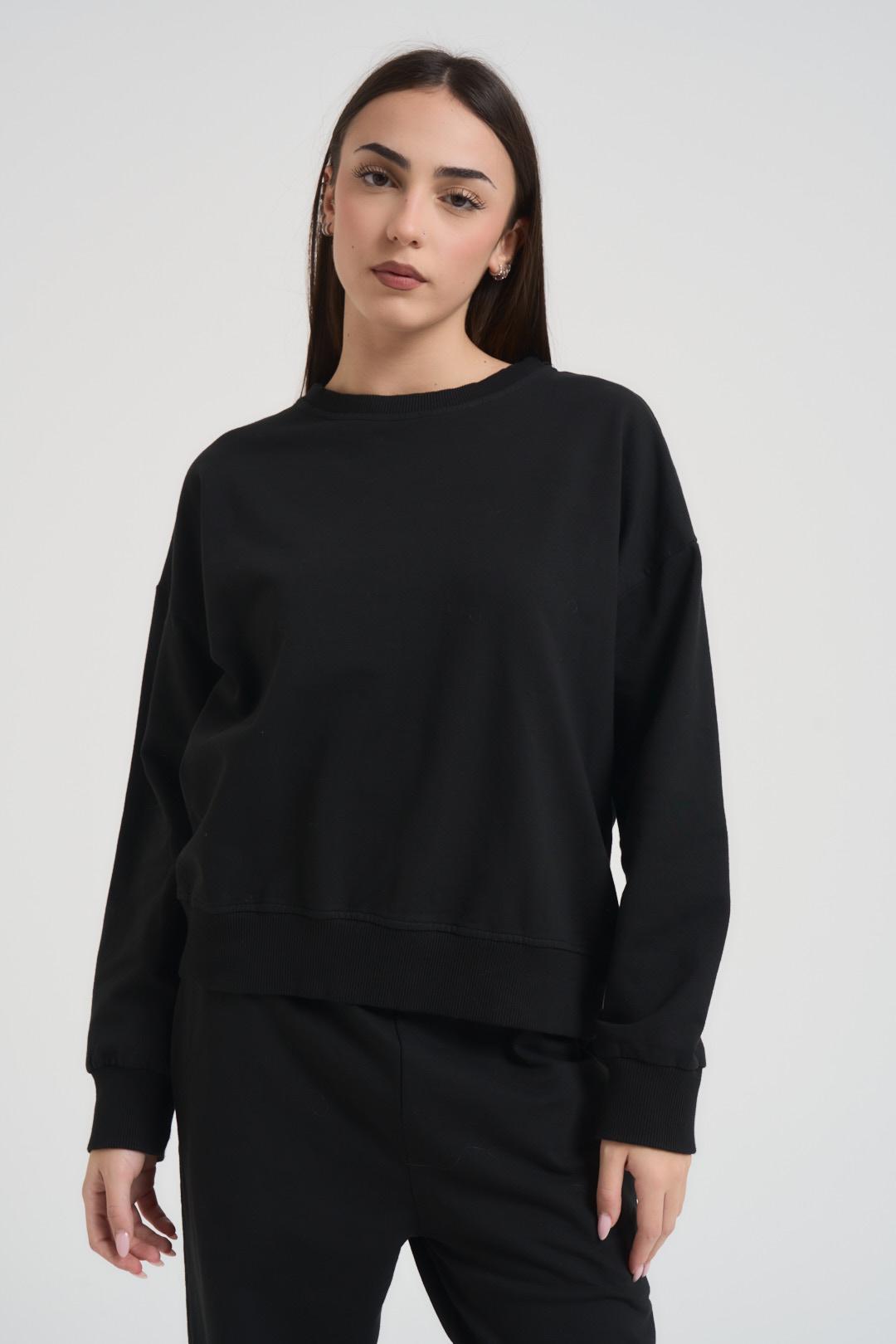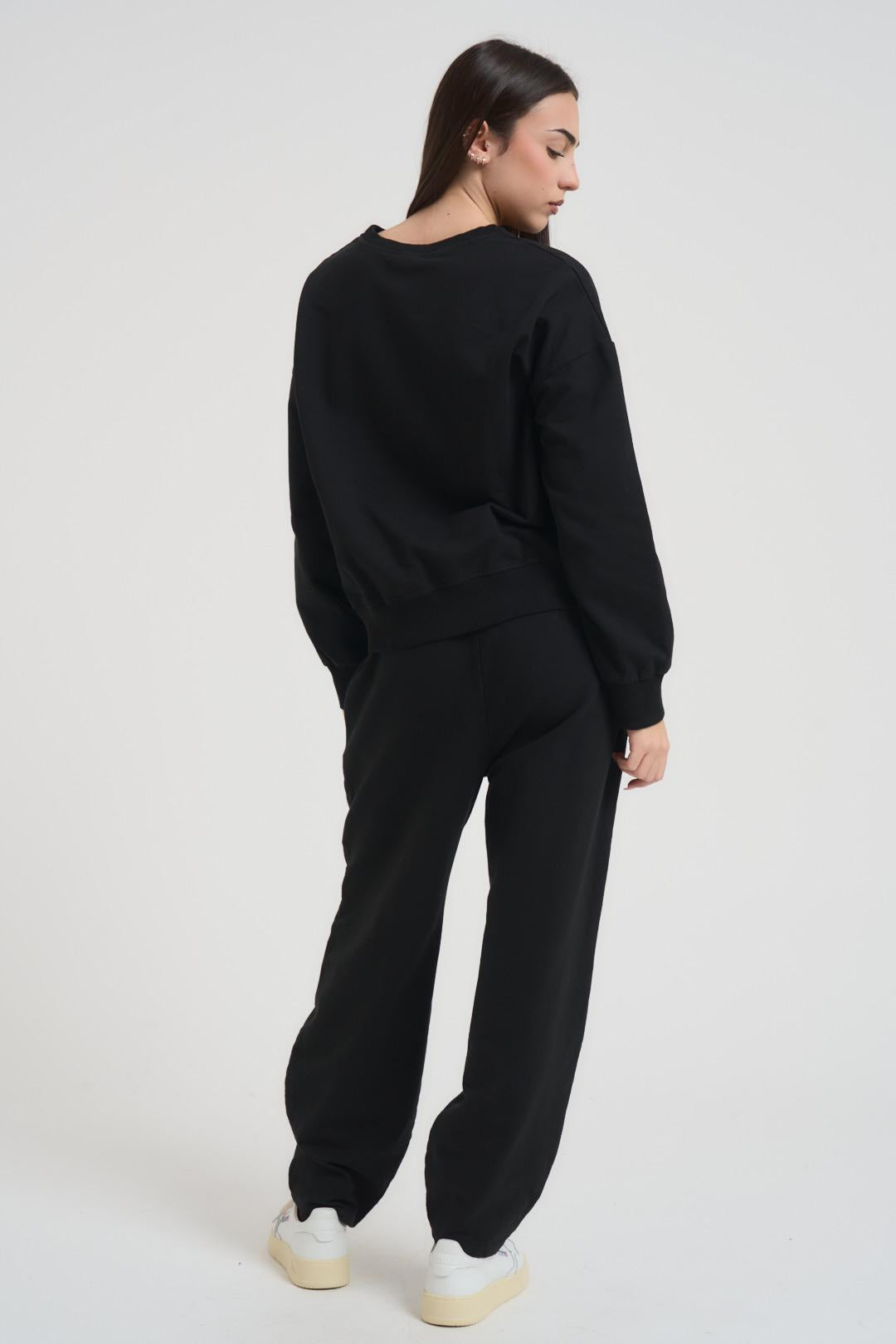 SUSY MIX Completo tuta donna nera. Modello composta da felpa girocollo e pantalone a palazzo, regular fit. Composizione: 95%co 5%ea. La modella è alta 172 cm e indossa la taglia unica.