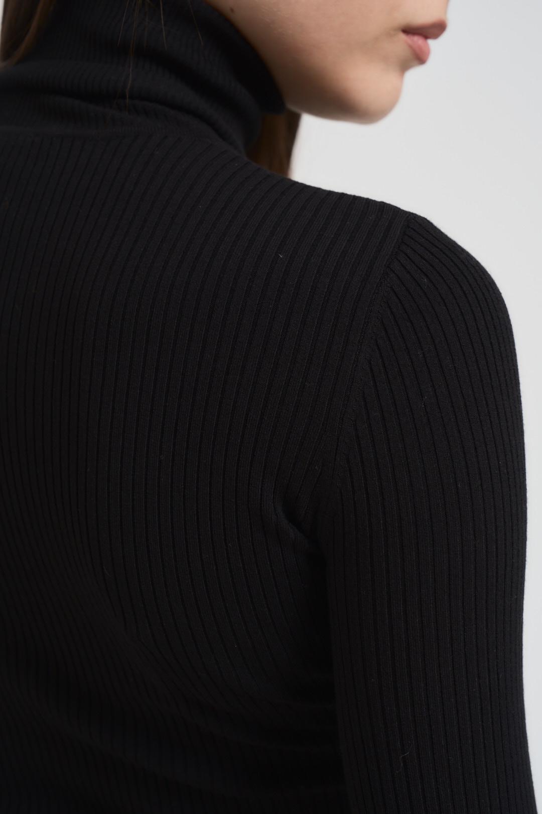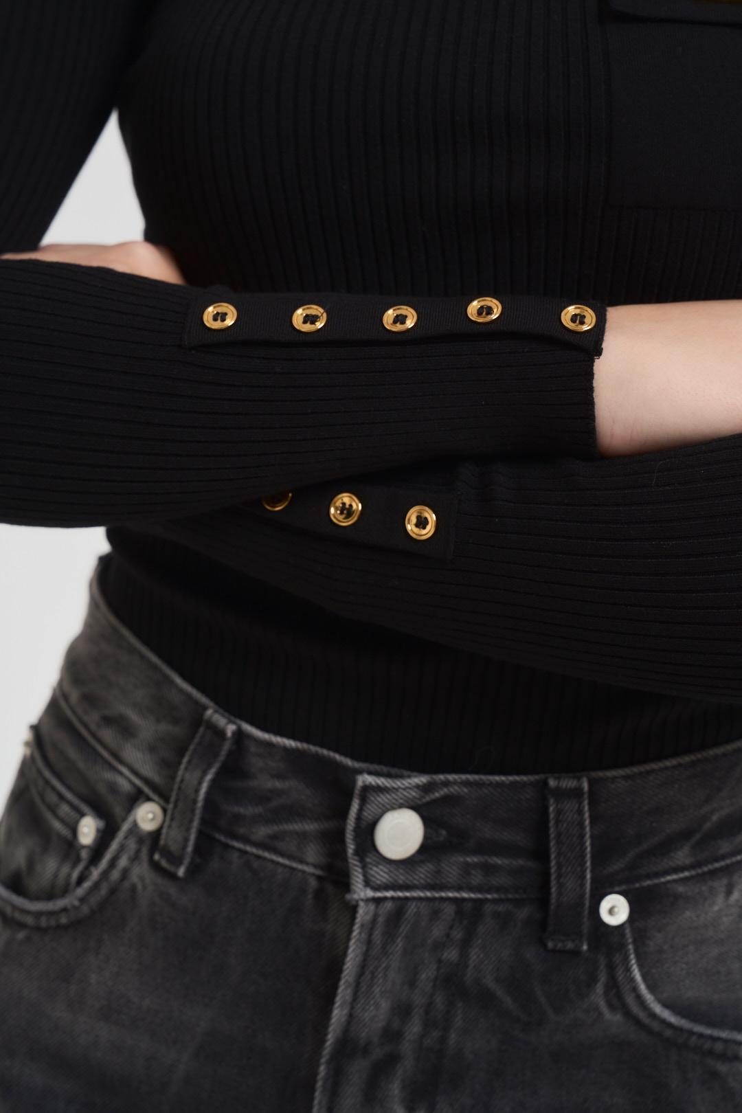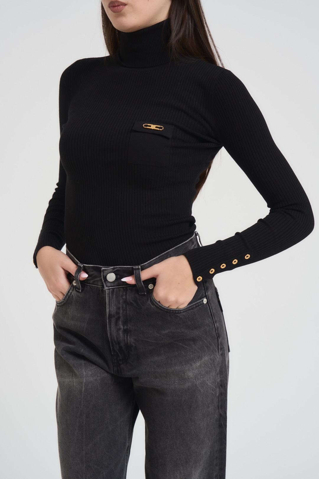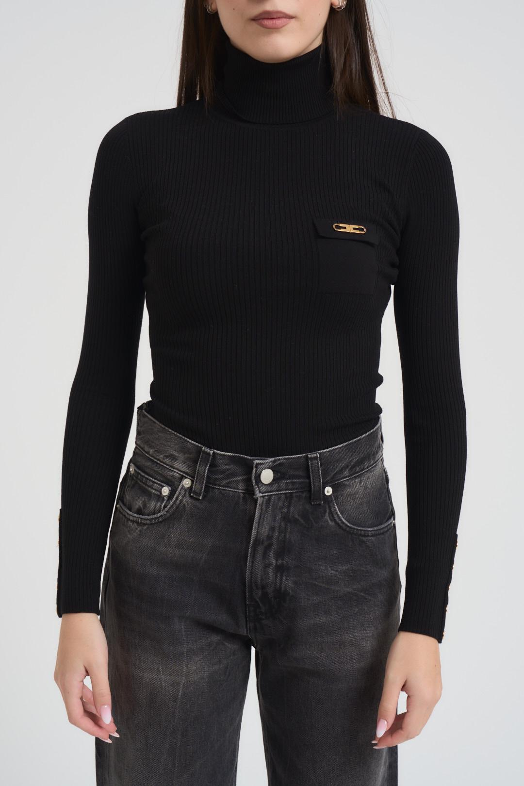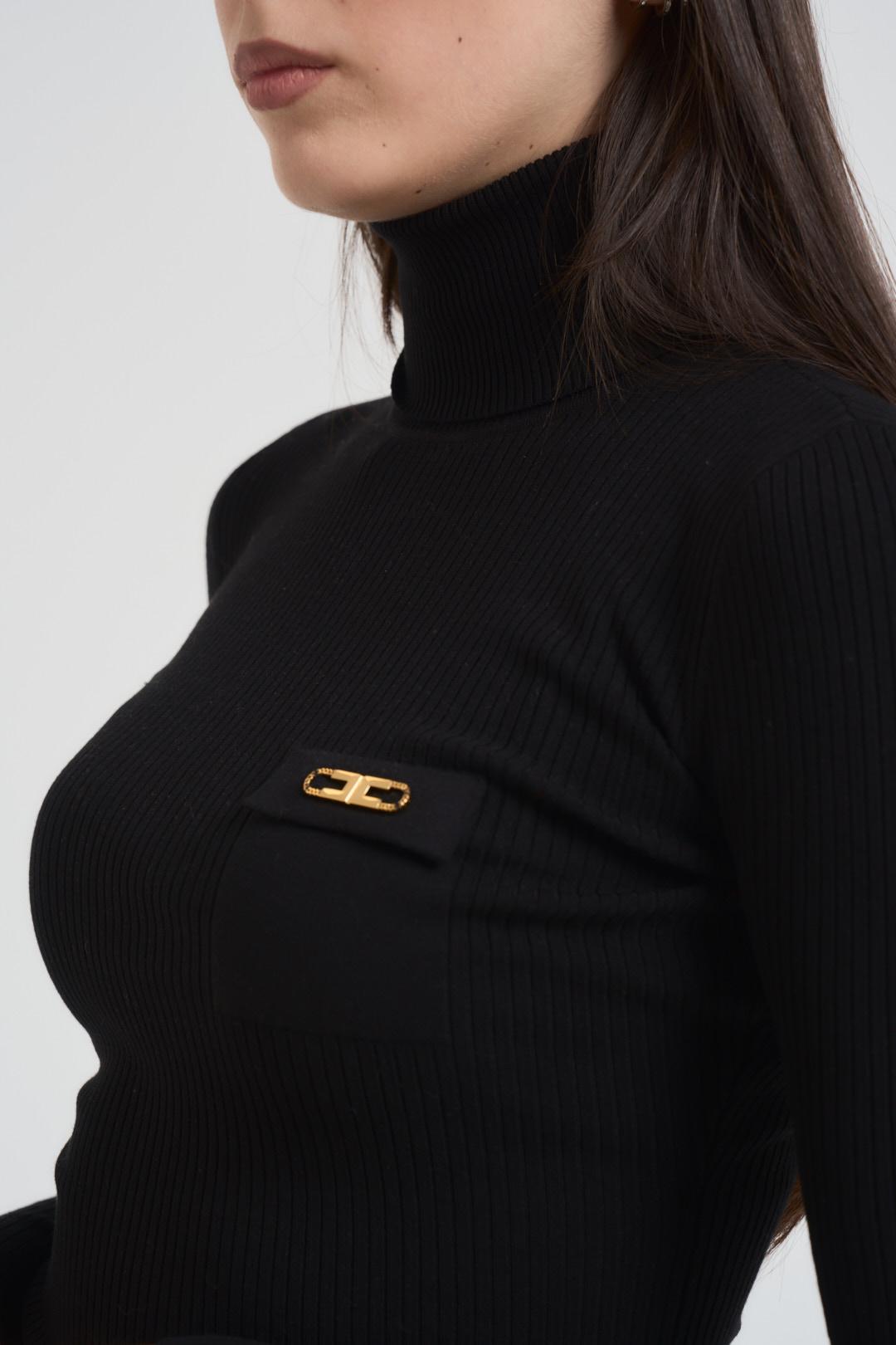ELISABETTA FRANCHI Dolcevita donna a costine nero. Modello a manica lunga con bottoncini dorati sui polsini. Dettaglio logo dorato sul petto a sinistra. Composizione: 64%lyocell 20%poliammide 16%seta. La modella è alta 172cm e indossa la taglia 40.