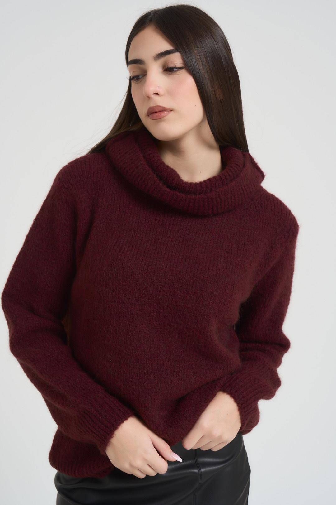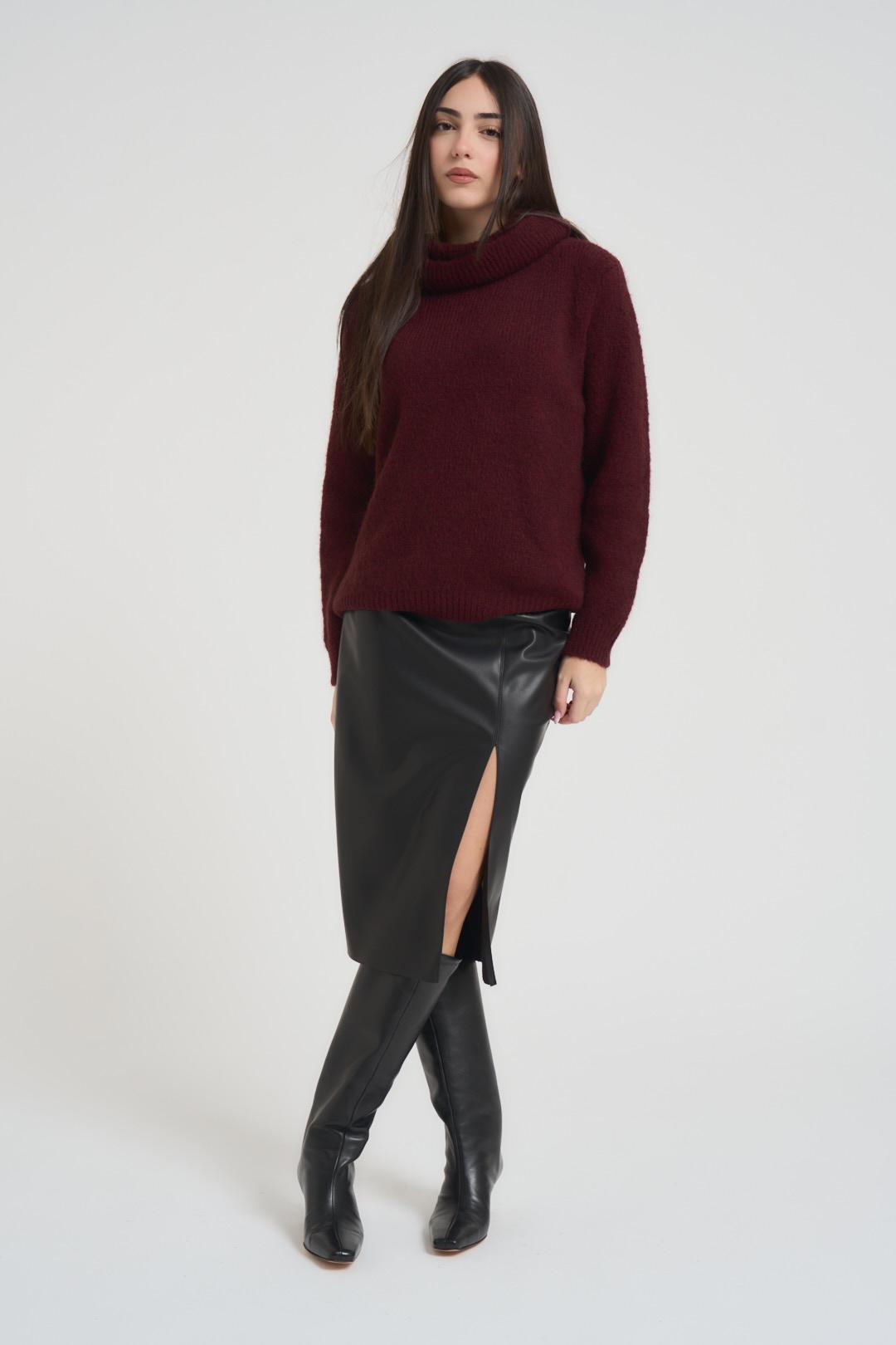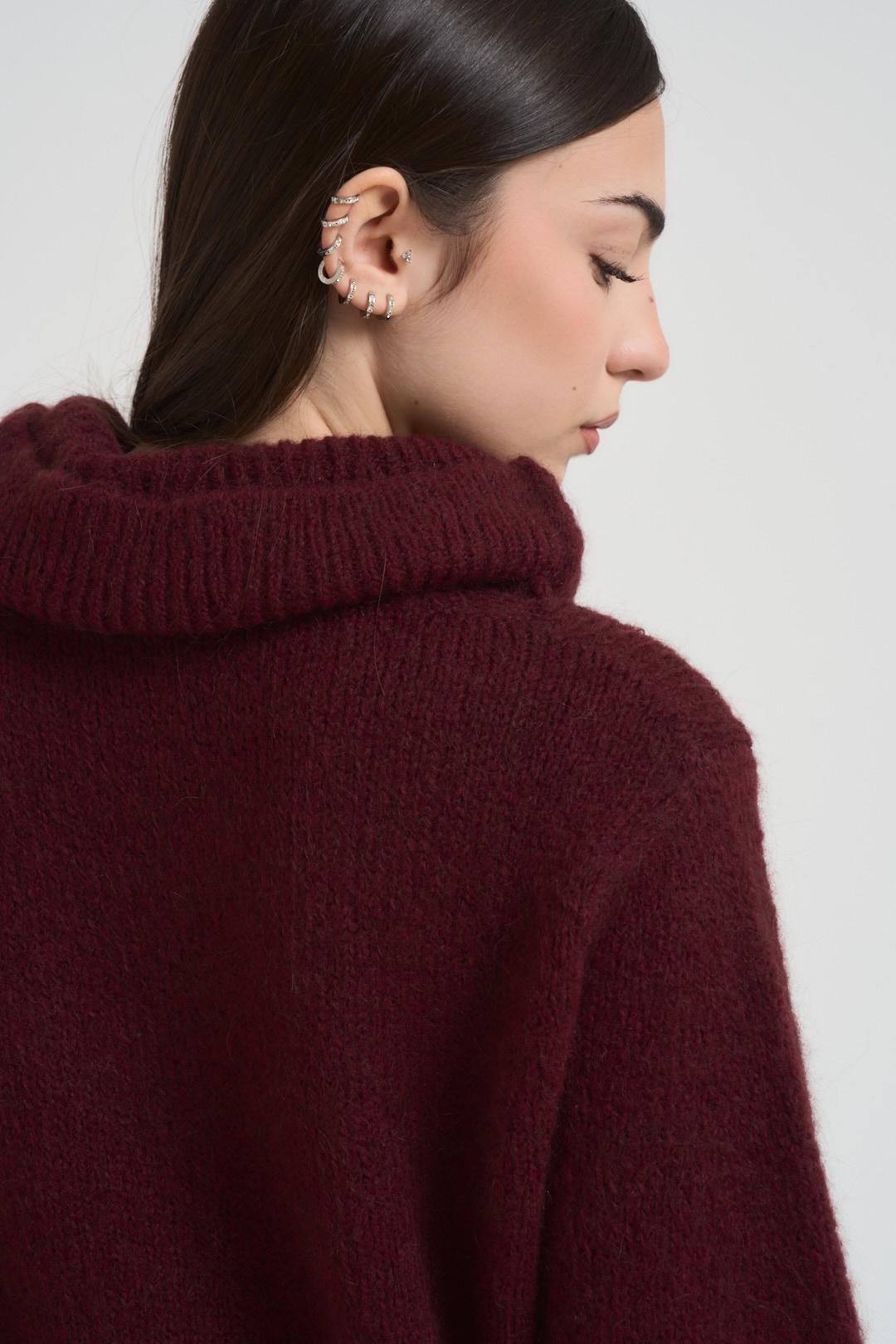 TENSIONE IN Dolcevita donna over bordeaux. Modello a collo alto, spalle scesa, maglia pesante e fit over. Composizione: 49% acrilica 17% poliammide 16% mohair 16% lana 2% elastan. La modella è alta 172 cm e indossa la taglia unica.