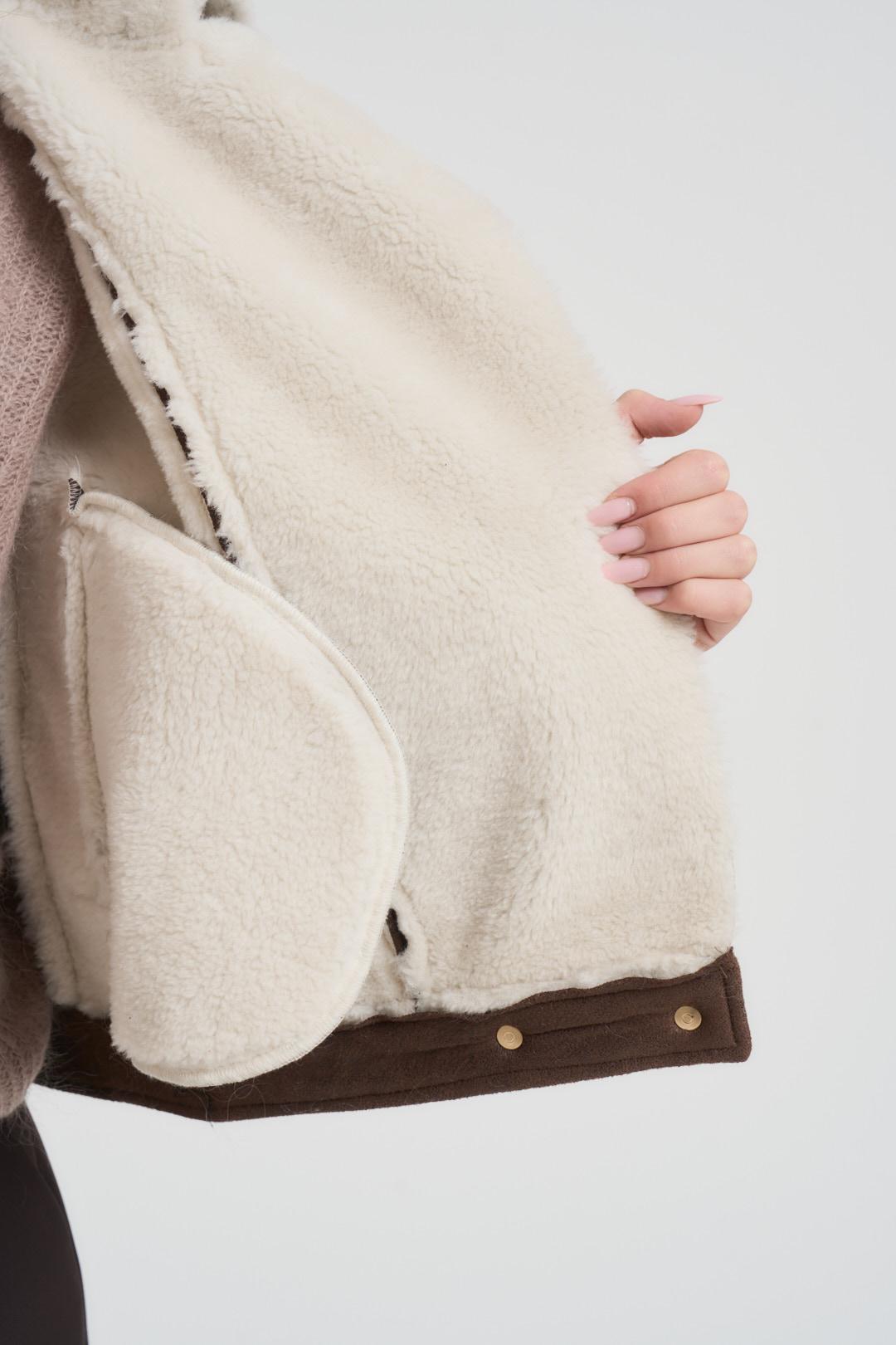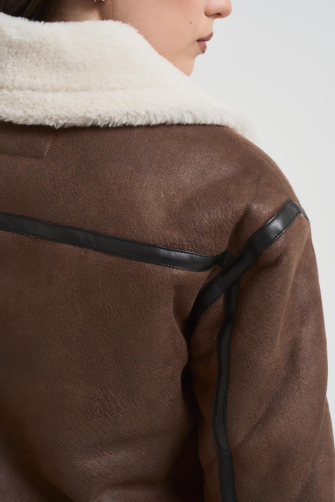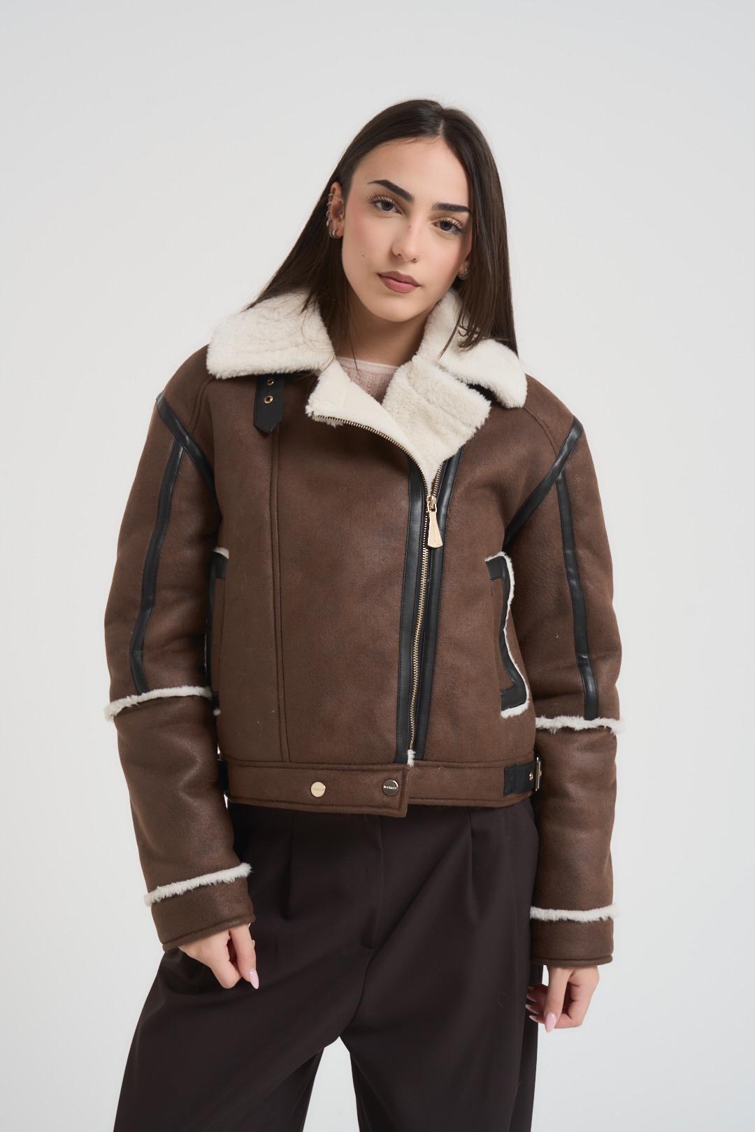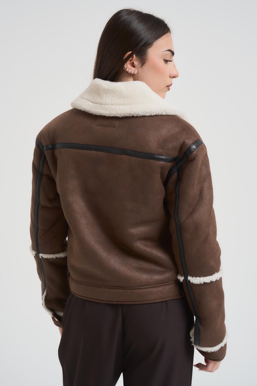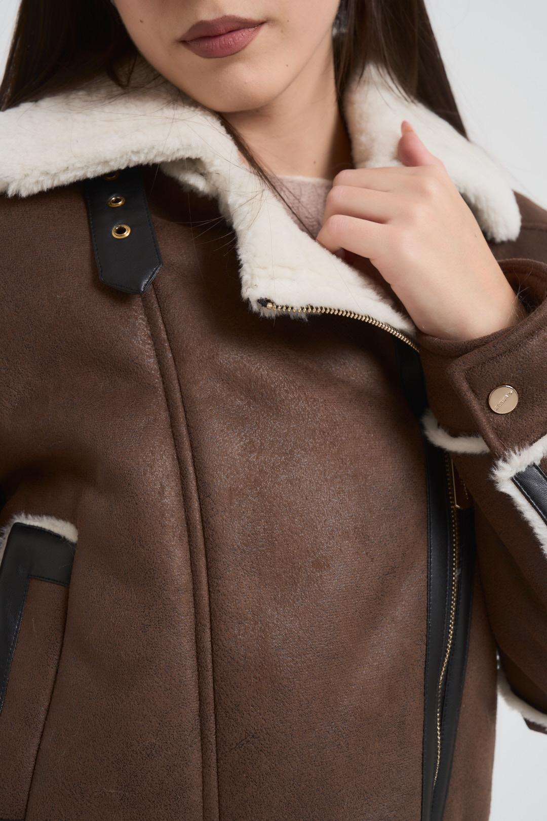 MARKUP Ecomontone donna corto marrone. Modello con interno in eco pelliccia ed esterno con inserti in ecopelle neri, chiusura con zip e bottoni e tasche a filetto. Composizione: 100% Poliestere. La modella è alta 172cm e indossa la taglia S.