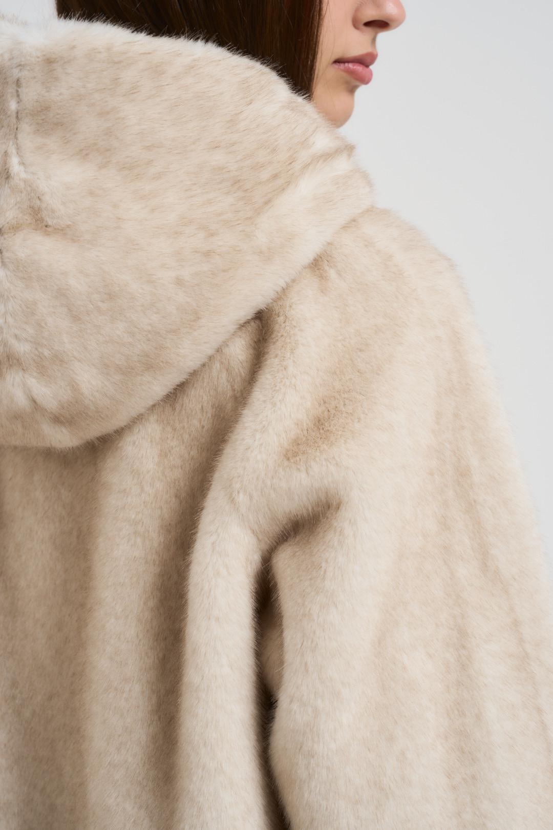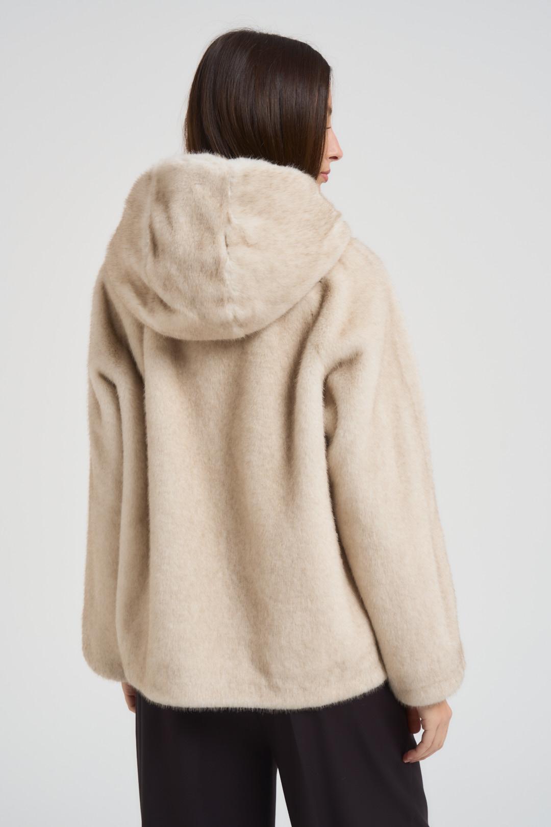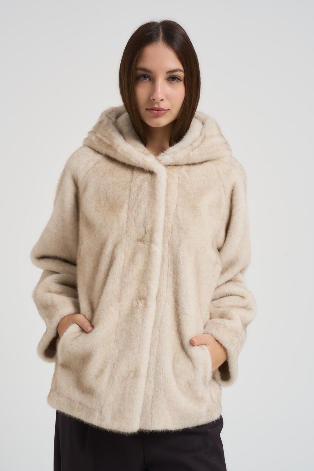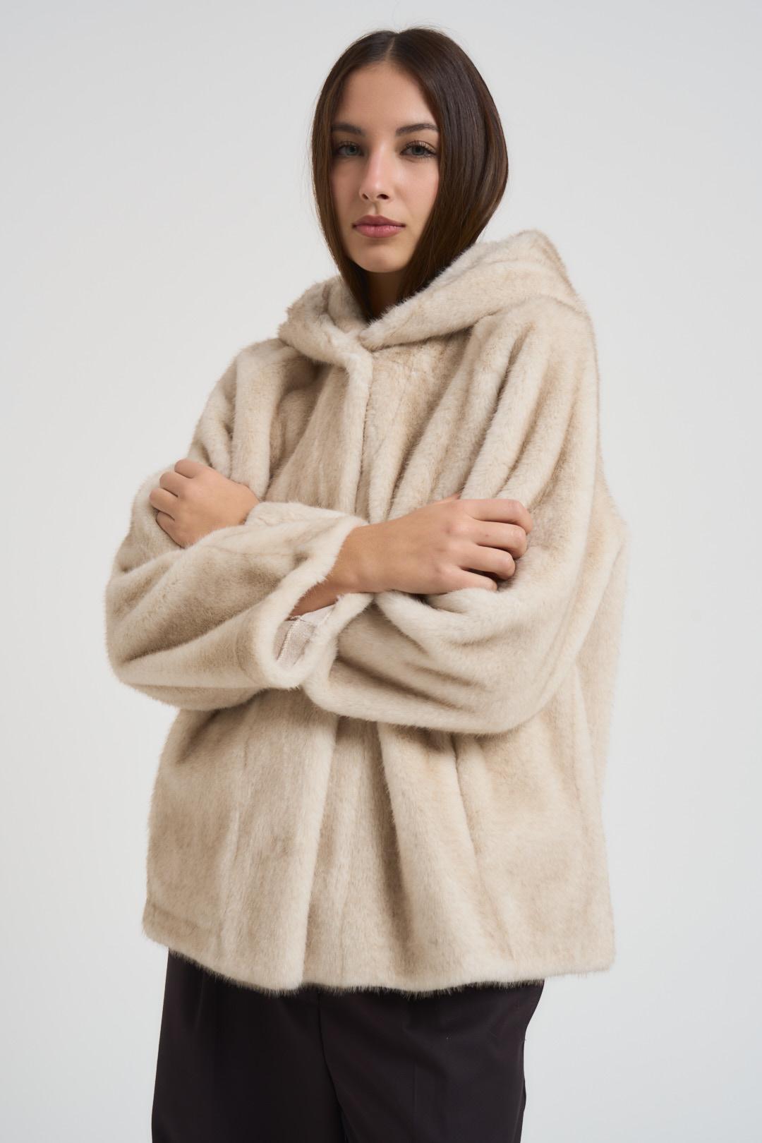 ADIMARI Ecopelliccia donna con cappuccio latte. Modello corto. Tessuto effetto pelliccia morbido. Chiusura frontale con bottoni. Due tasche frontali. Composizione: Poliestere. La modella è alta 176 cm e indossa la taglia S.