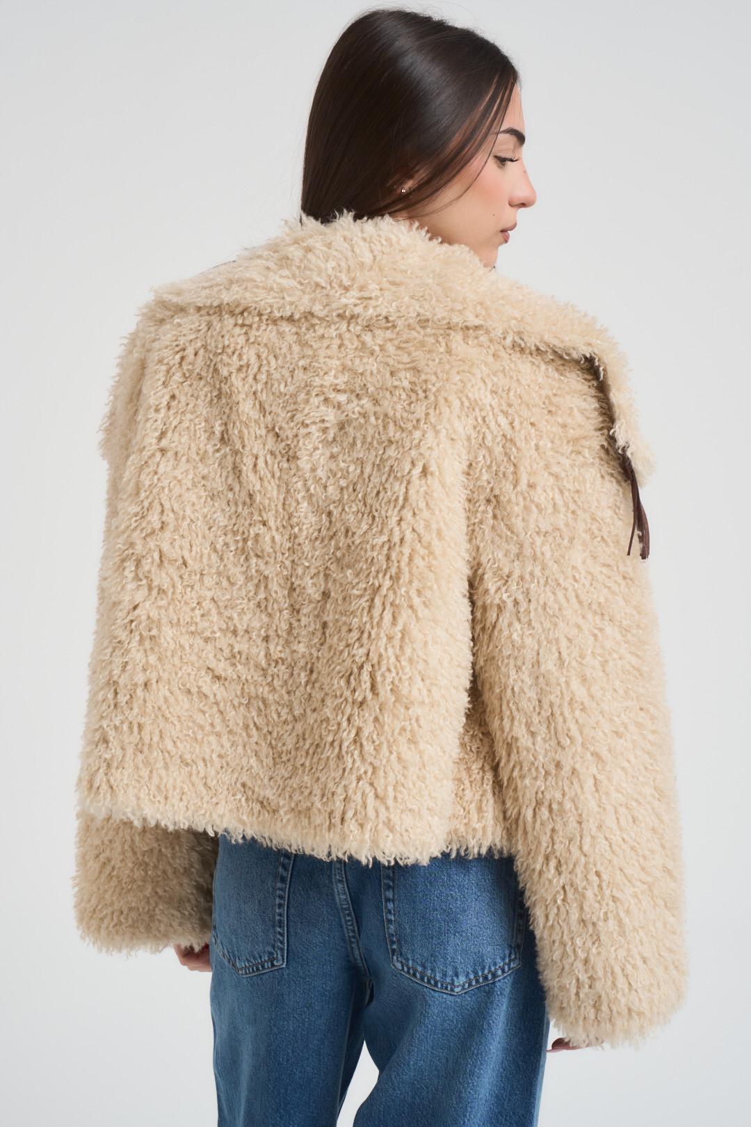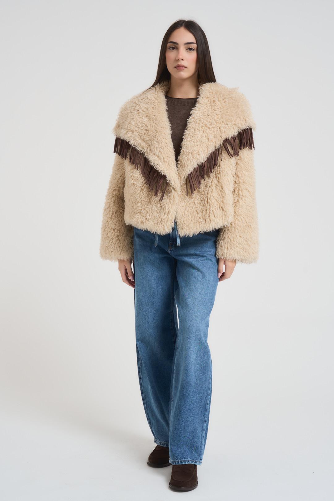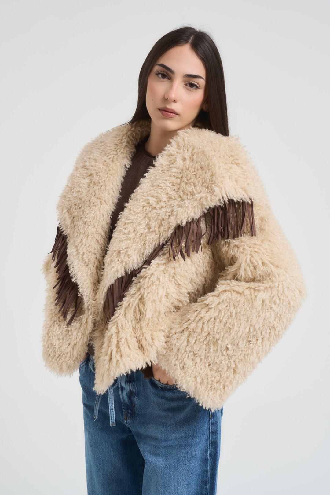 LE VOLIERE Ecopelliccia donna con frange beige. Modello corto con collo ampio. Chiusura frontale con gancetto. Maniche lunghe e frange rimovibili tramite zip. Composizione: 100% ecopelliccia. La modella è alta 172 cm e indossa la taglia XS/S.