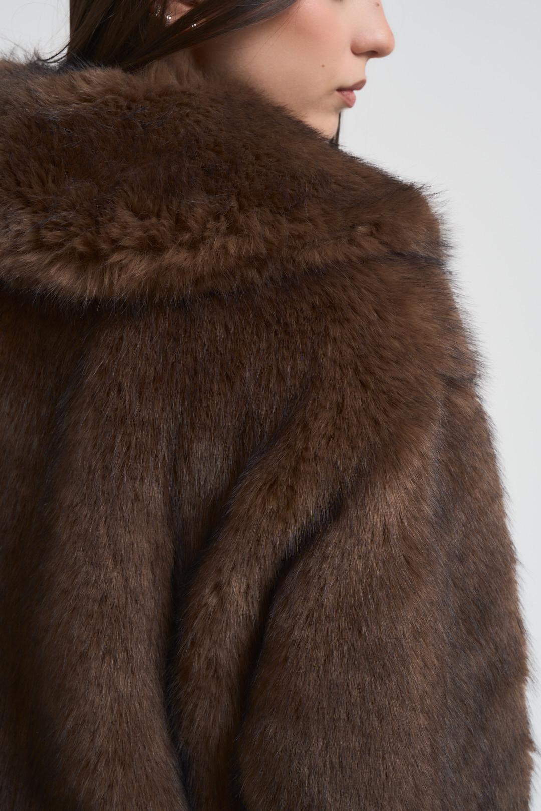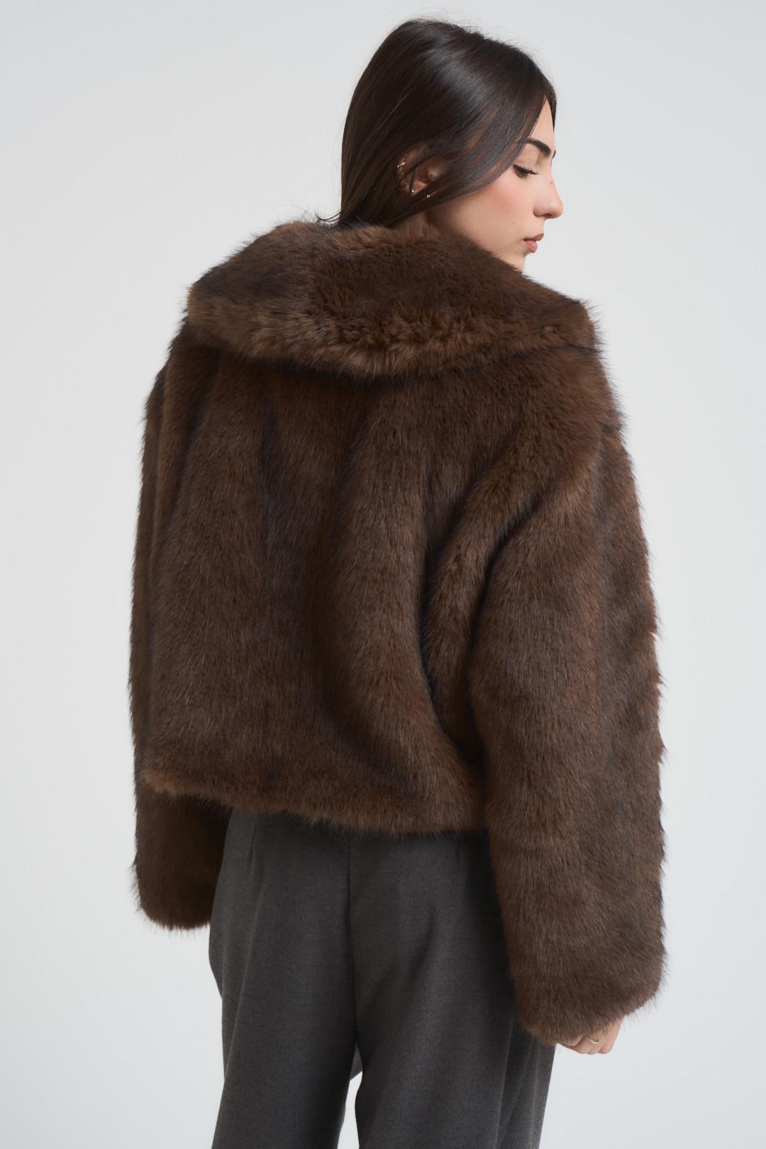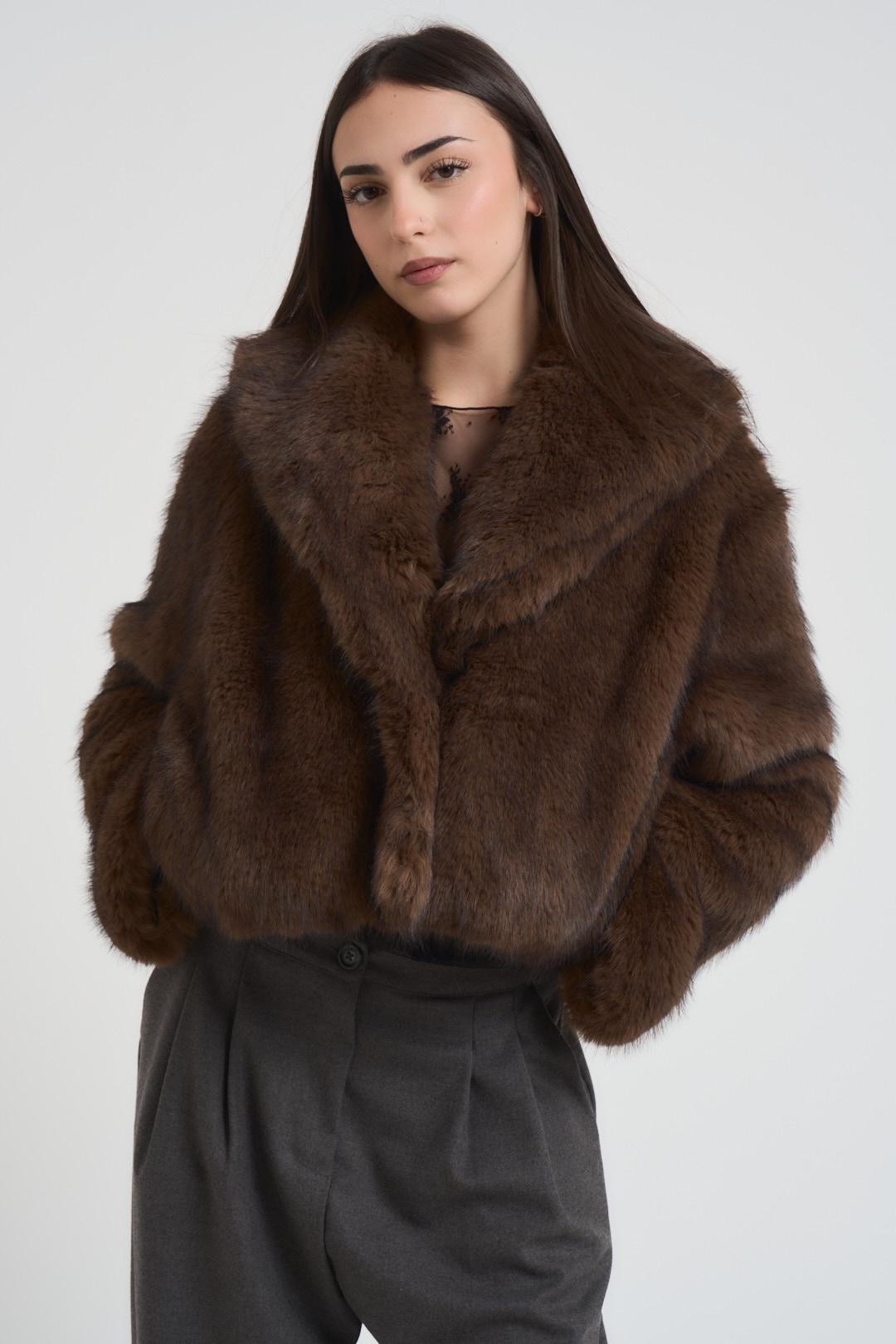 PHILIA Ecopelliccia donna corta moro. Modello cropped. Scollo con rever. Chiusura frontale. Tasche laterali. Maniche raglan e chiusura con bottoni automatici invisibili. Composizione: 100% poliestere. La modella è alta 172 cm e indossa la taglia S.