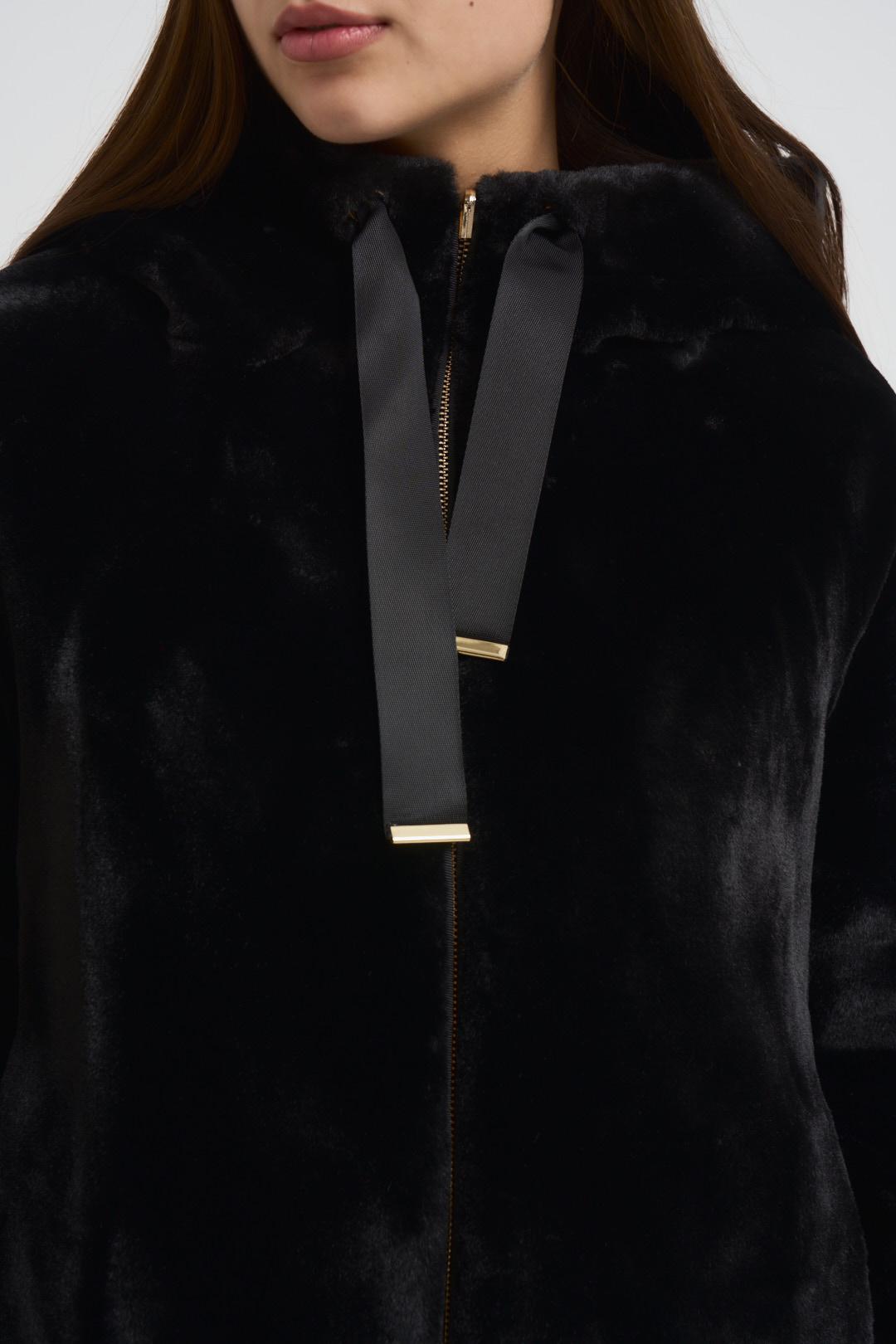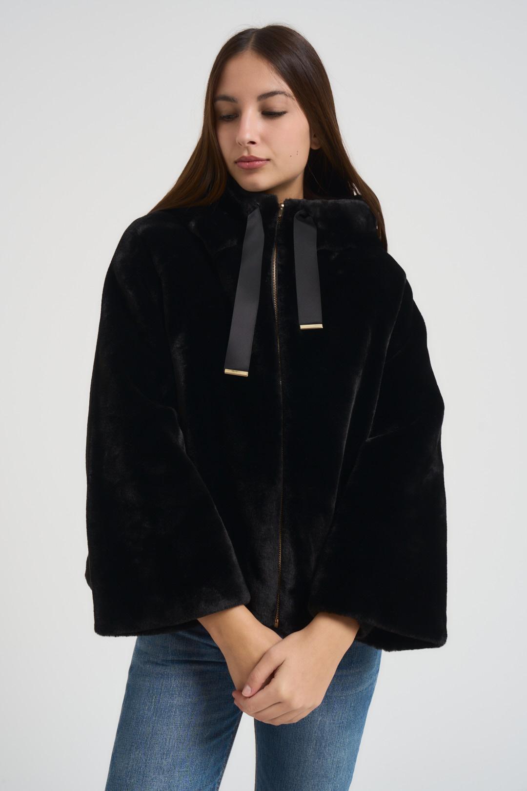 ADIMARI Ecopelliccia donna corta nera. Modello con cappuccio e coulisse regolabile, fit a cappa con camnica che si allarga sul fondo, chiusura con zip. Composizione: poliestere. La modella è alta 176cm e indossa la taglia S.