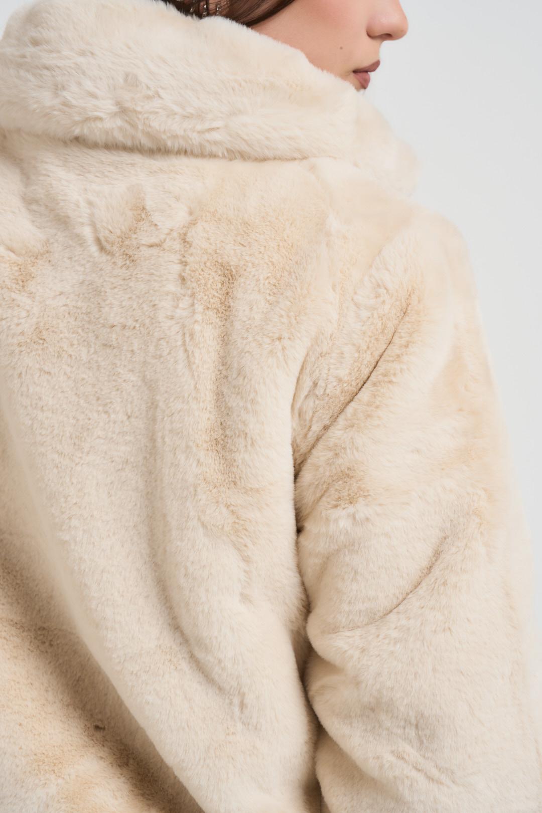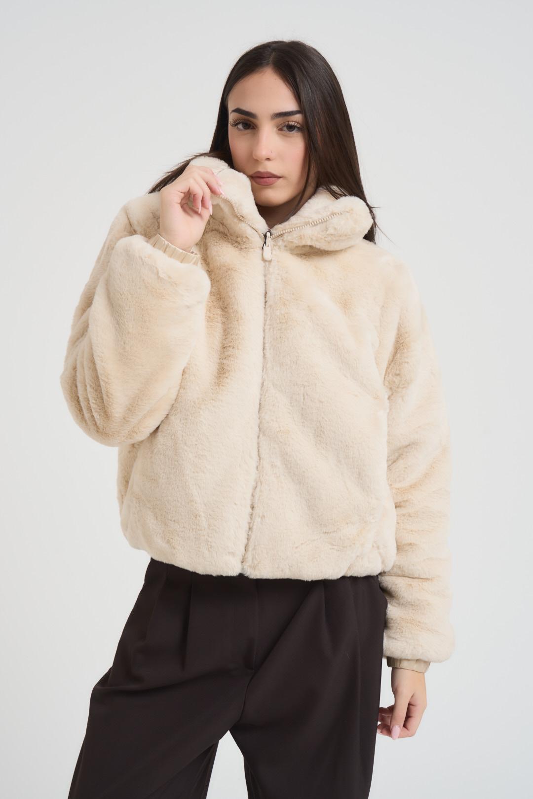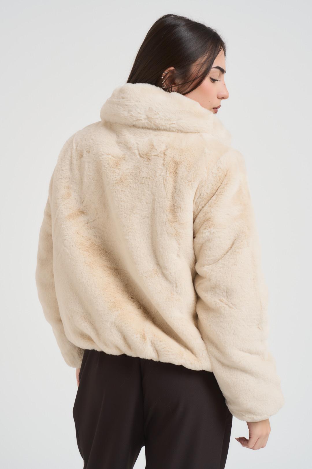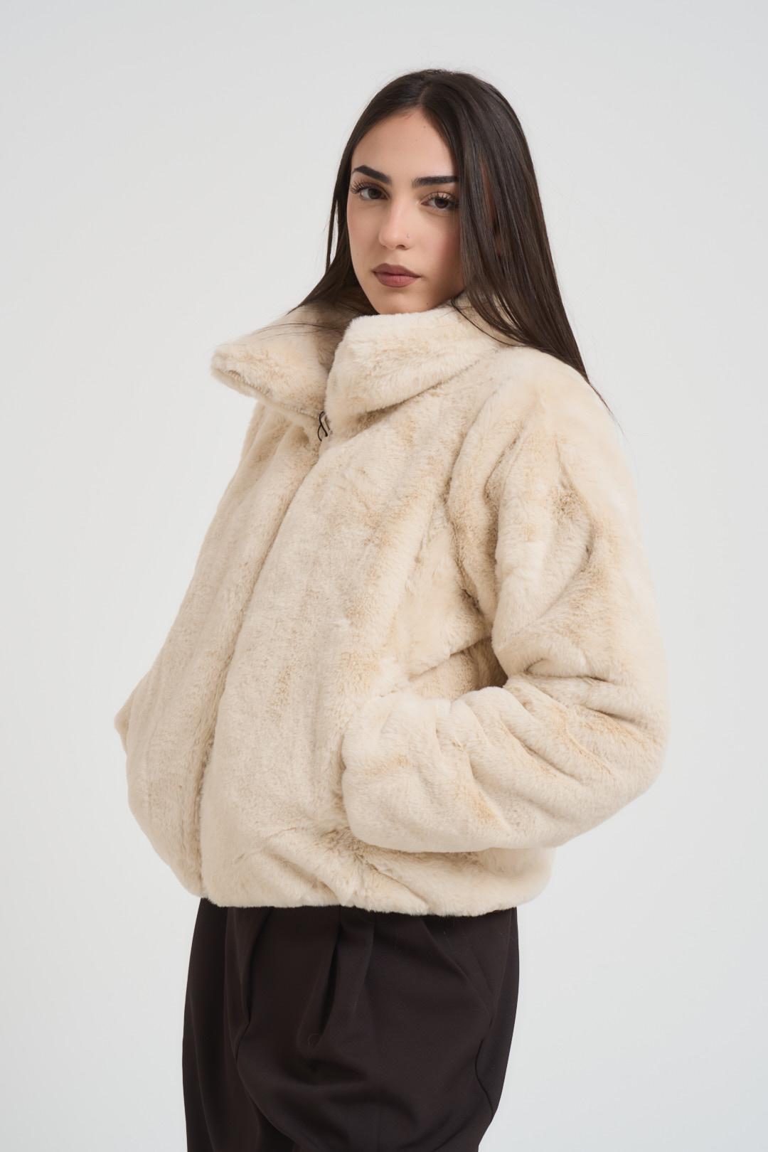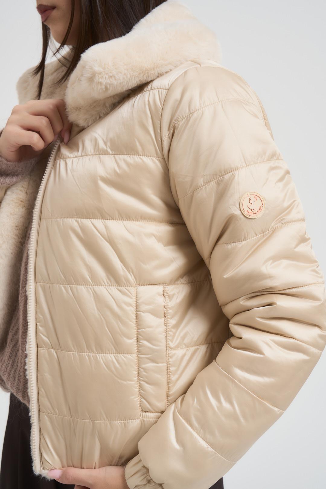 SAVE THE DUCK Ecopelliccia donna corta reversibile panna. Modello con collo alto, chiusura con zip centrale, due tasche a filetto laterali e polsini elasticizzati. Elastico inserito al fondo. Una parte trapuntato in nylon panna. Composizione: 100% poliestere. La modella è alta 172cm e indossa la taglia S.