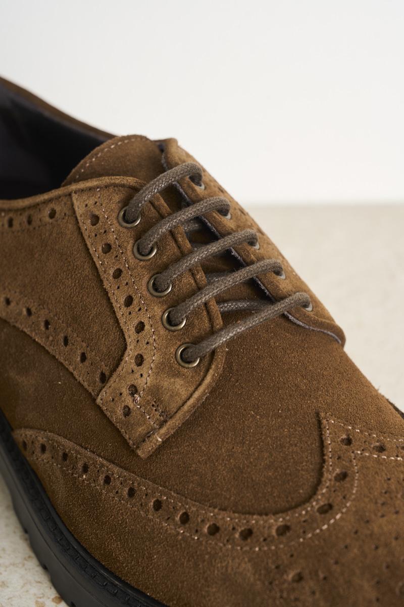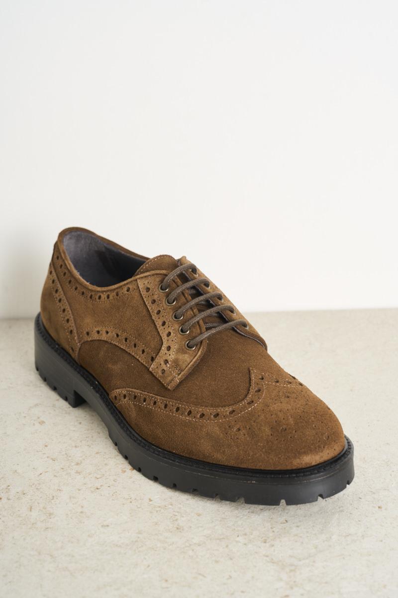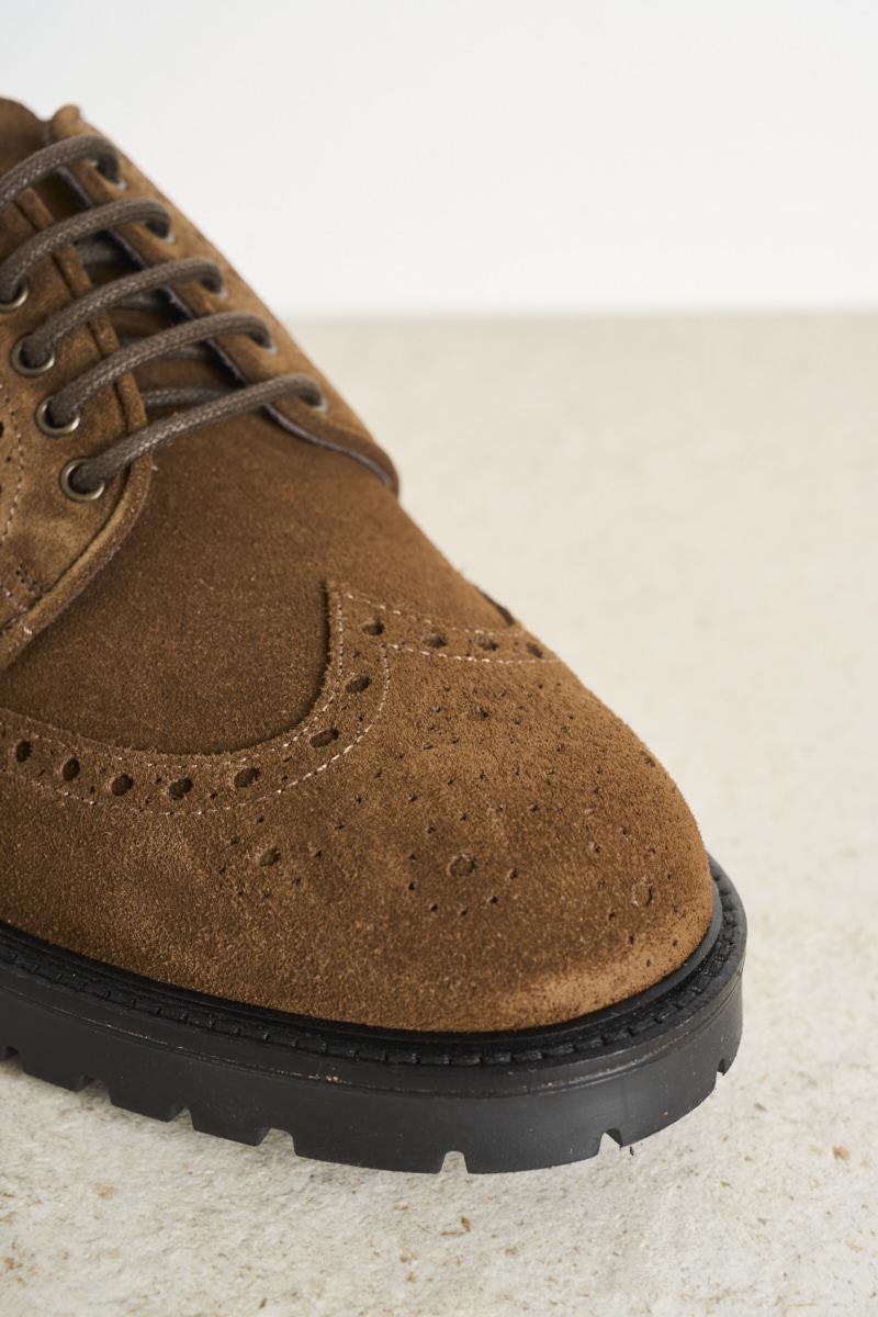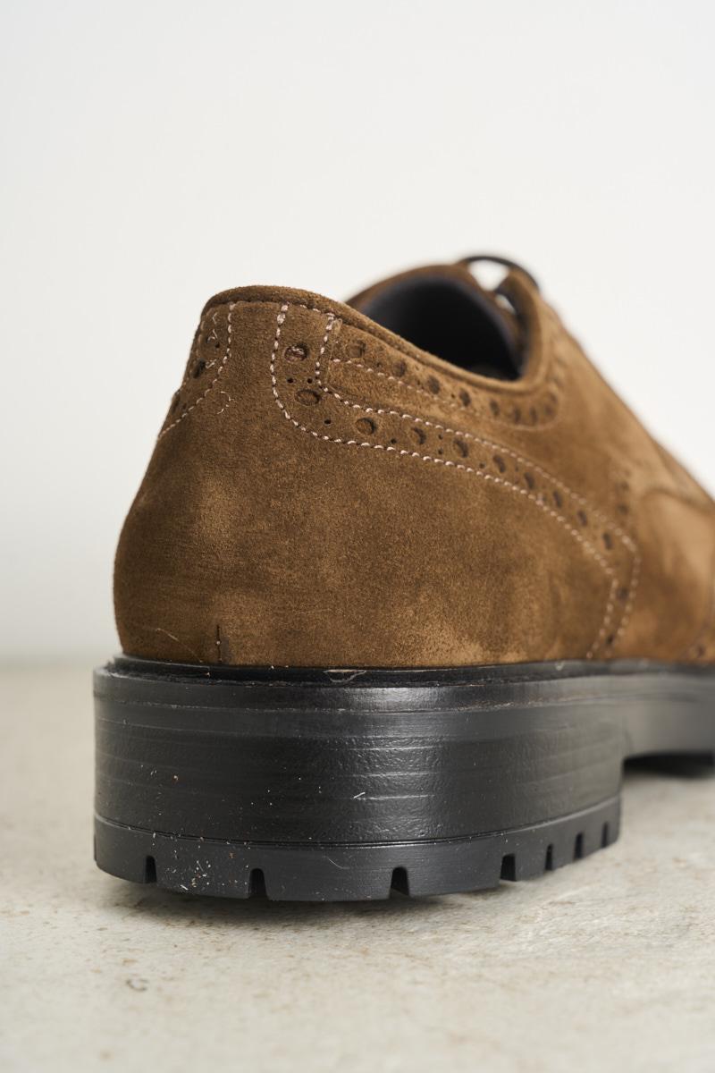 FEDENI Men's lace-up shoe in brown suede. Swallowtail. Tone-on-tone laces. Cararmato rubber sole. Heel: 3 cm. Composition: 100% leather.