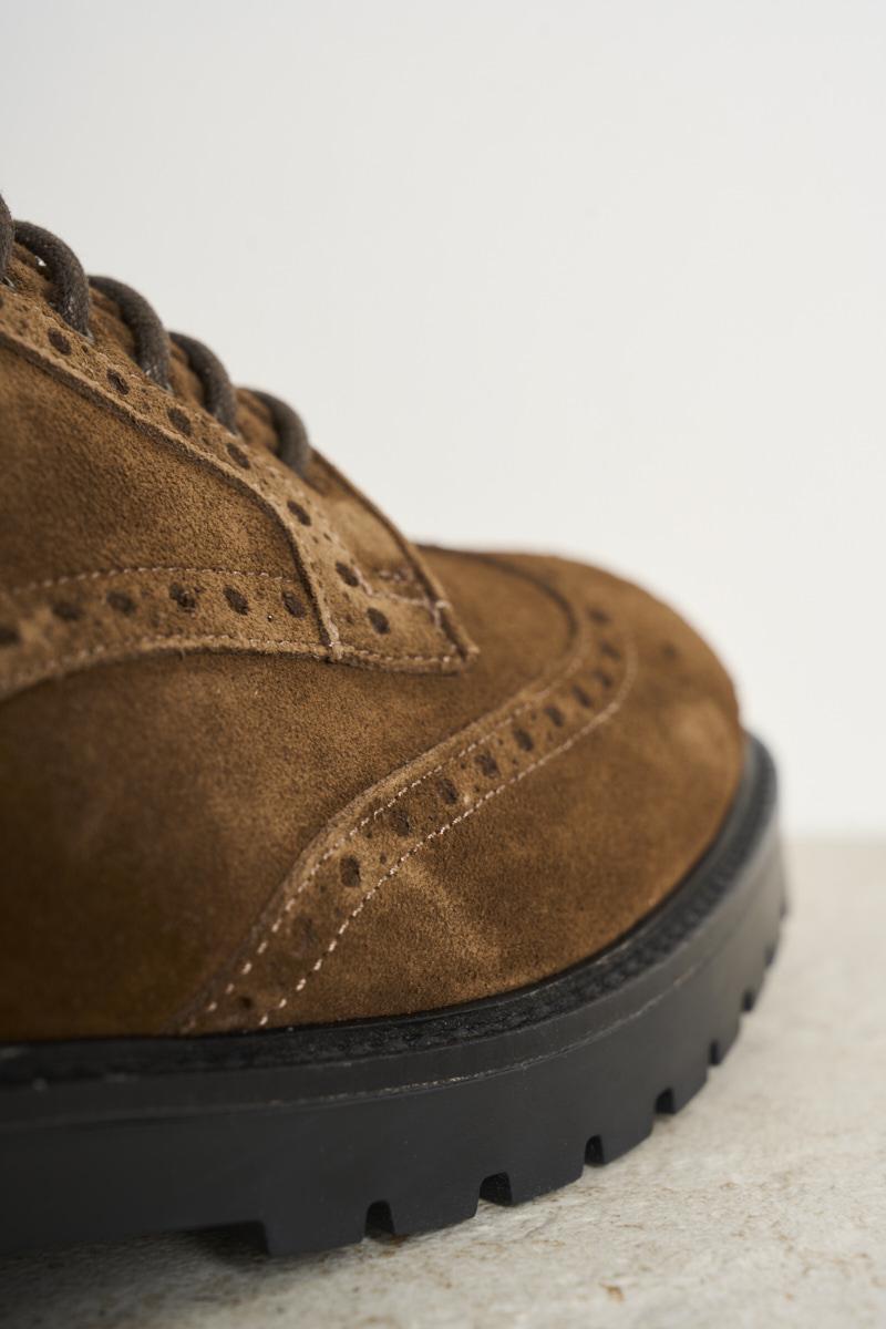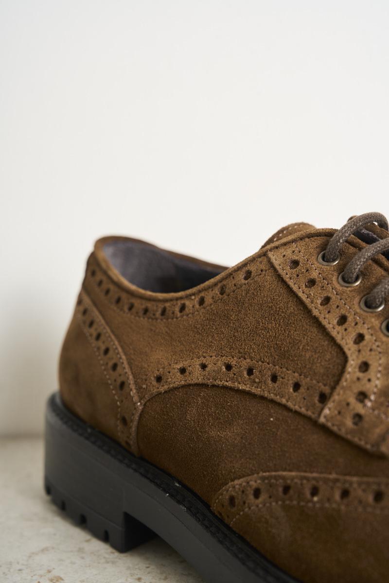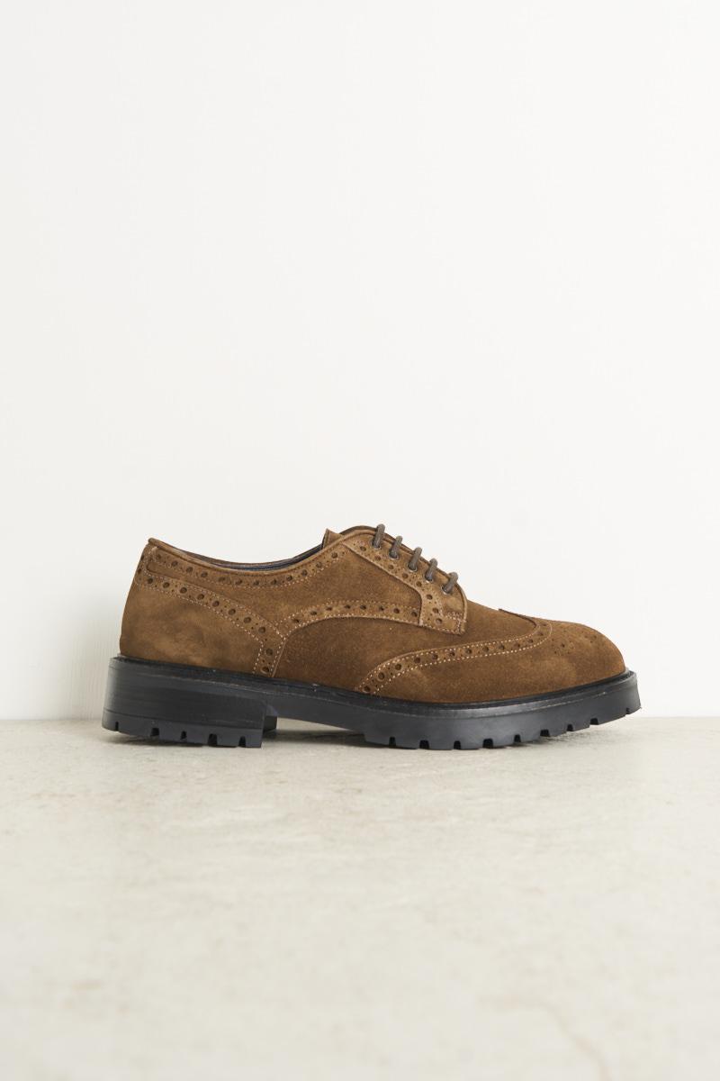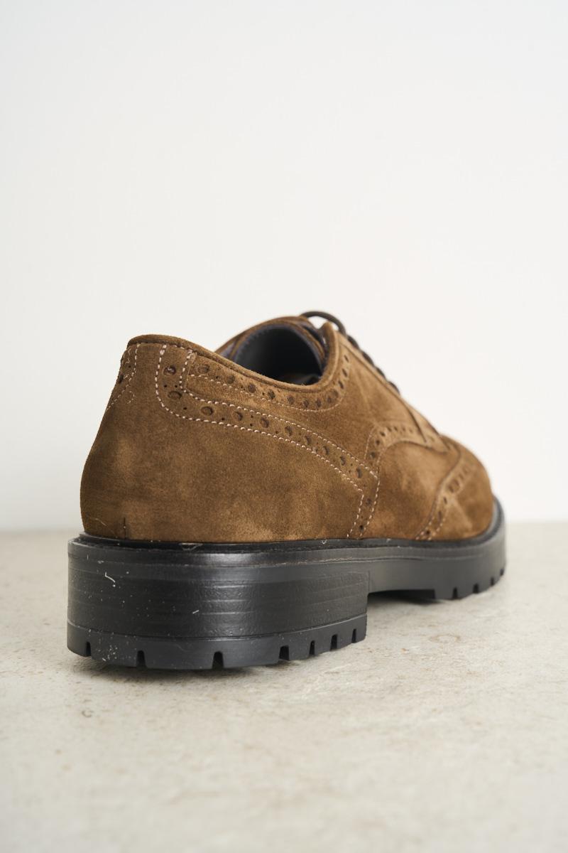 FEDENI Men's lace-up shoe in brown suede. Swallowtail. Tone-on-tone laces. Cararmato rubber sole. Heel: 3 cm. Composition: 100% leather.