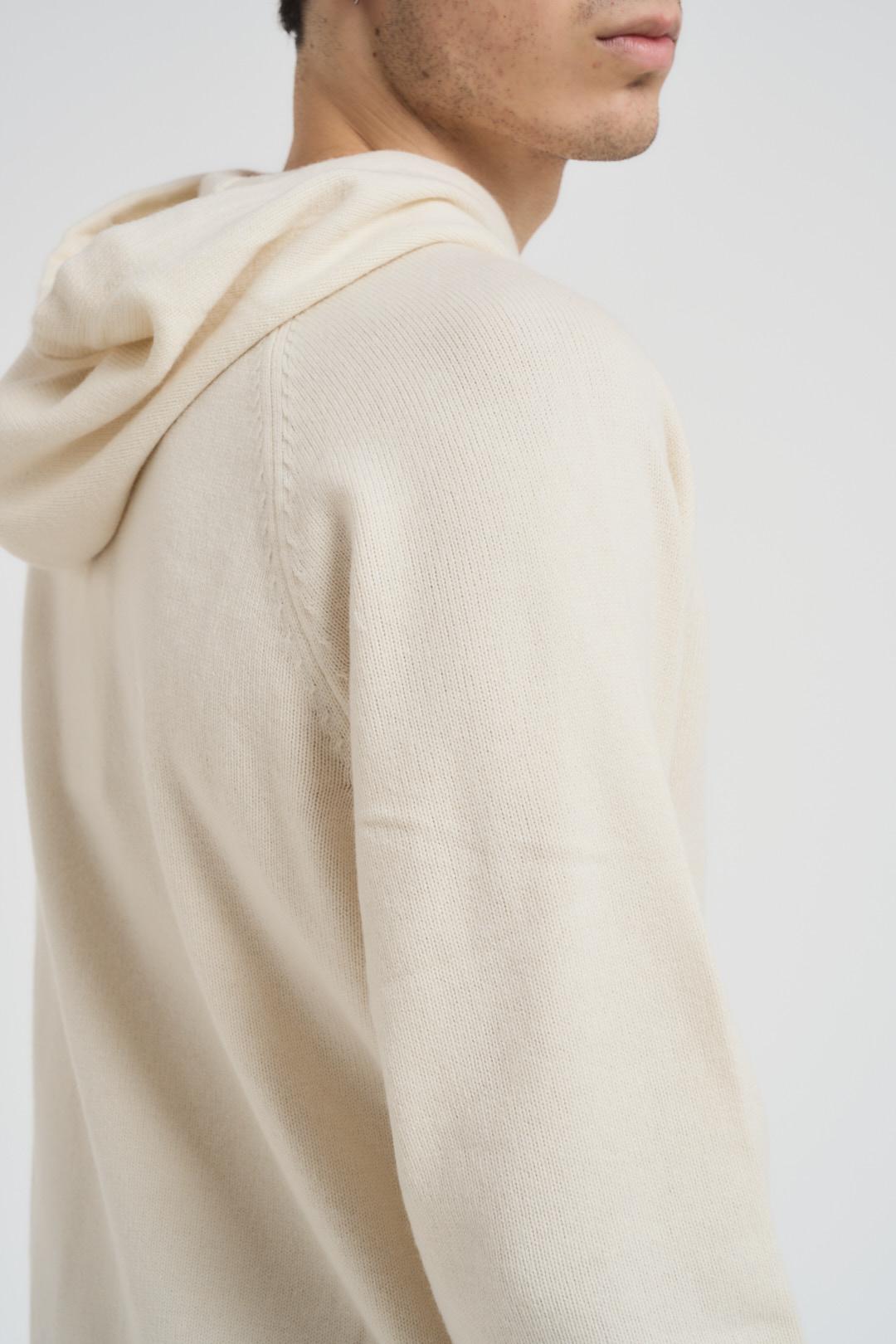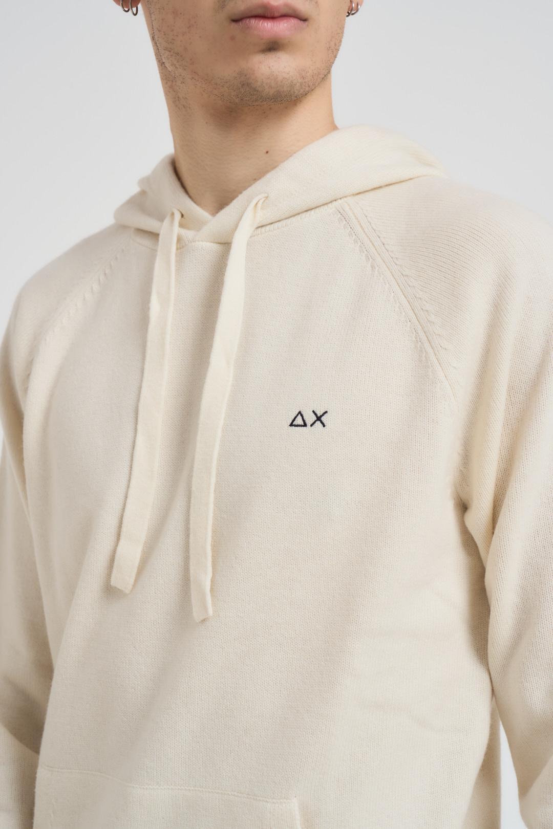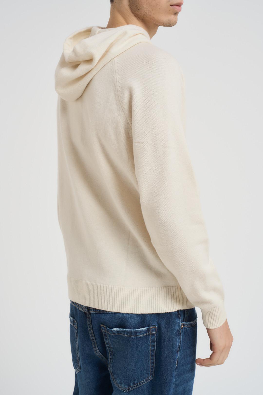 SUN68 Felpa in maglia con cappuccio panna. Modello in misto lana e cashmere, cappuccio con coulisse e maniche lunghe. Bordi a costine. Logo brand ricamato sul petto in nero. Composizione: 60% Lana, 35% Poliammidica, 5% Cashmere. Il modello è alto 190cm e indossa la taglia L.