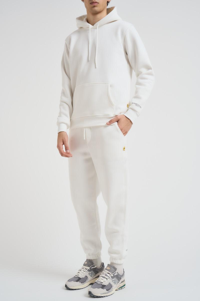 SUPERCULTURE Felpa uomo bianca con cappuccio. Laccio regolabile sul cappuccio. Polsini e fondo a costine. Regular fit. Composizione: 65% Cotone 35% Poliestere. Il modello è alto 185cm e indossa la taglia L.