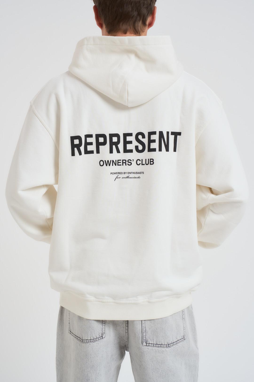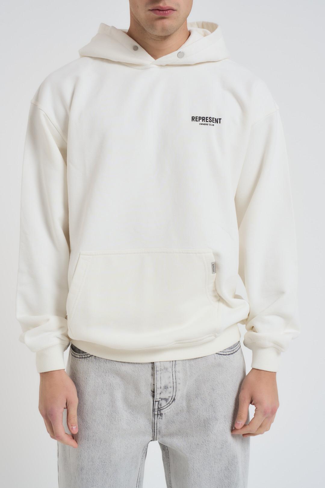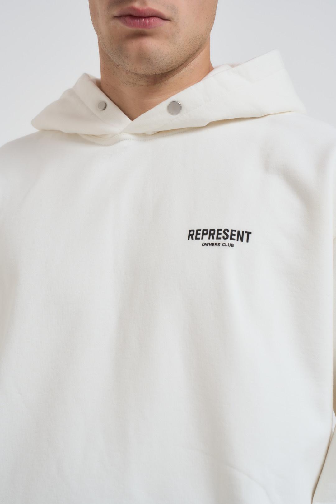 REPRESENT Felpa uomo con cappuccio bianca. Modello con scritta logo sul petto a sinistra. Stampa sul retro. Tasca a canguro. Manica lunga. Polsini e orlo a costine. Occhielli in metallo. Composizione: 95% Cotone, 5% Elastane. Il modello è alto 185 cm e indossa la taglia L.