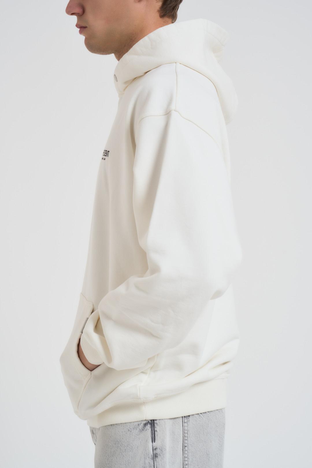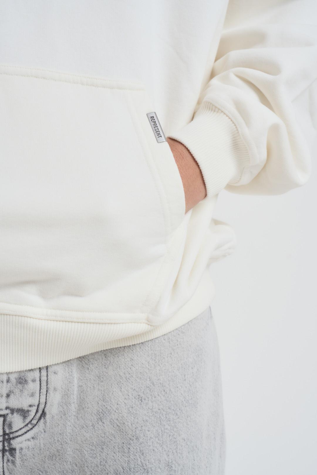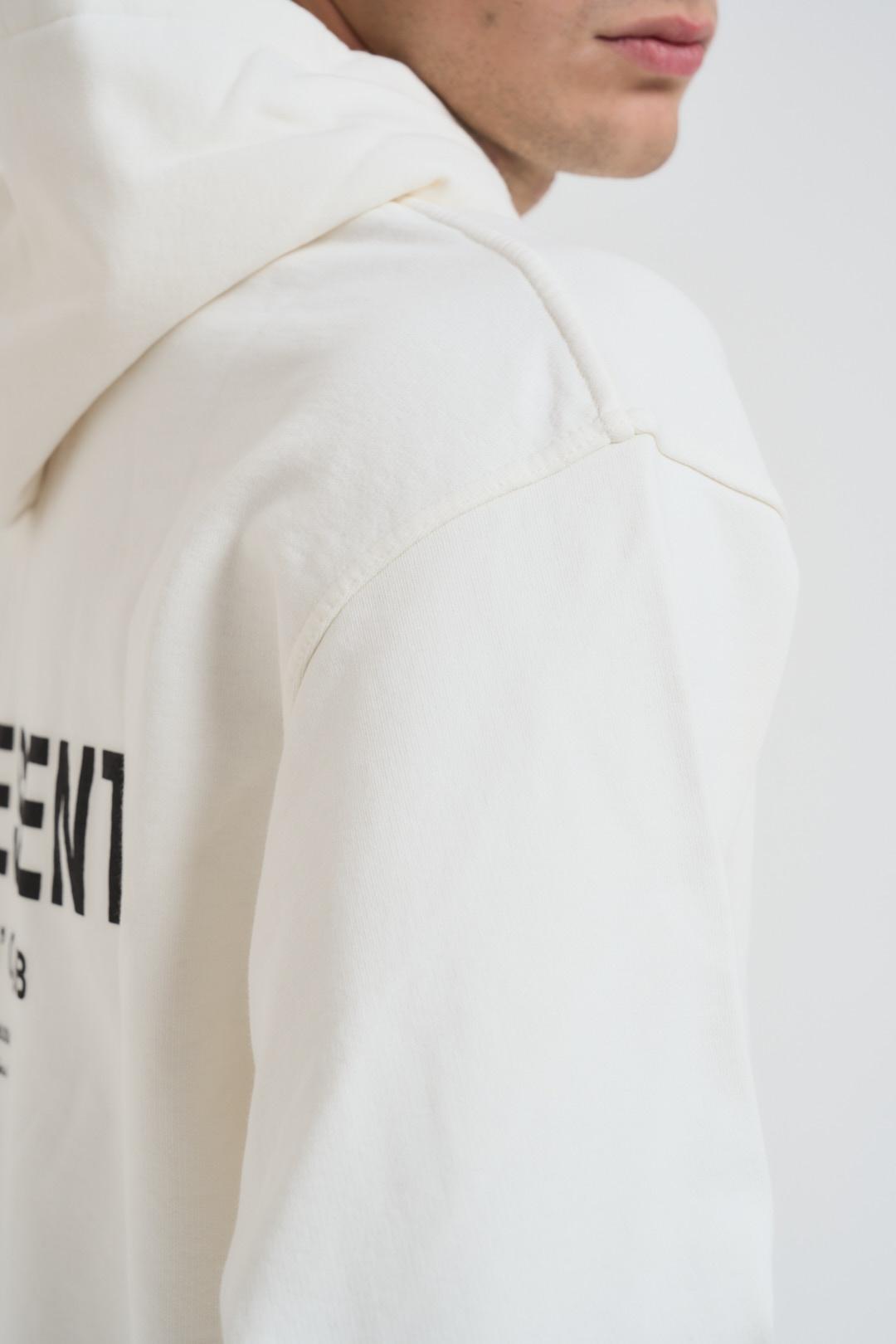 REPRESENT Felpa uomo con cappuccio bianca. Modello con scritta logo sul petto a sinistra. Stampa sul retro. Tasca a canguro. Manica lunga. Polsini e orlo a costine. Occhielli in metallo. Composizione: 95% Cotone, 5% Elastane. Il modello è alto 185 cm e indossa la taglia L.