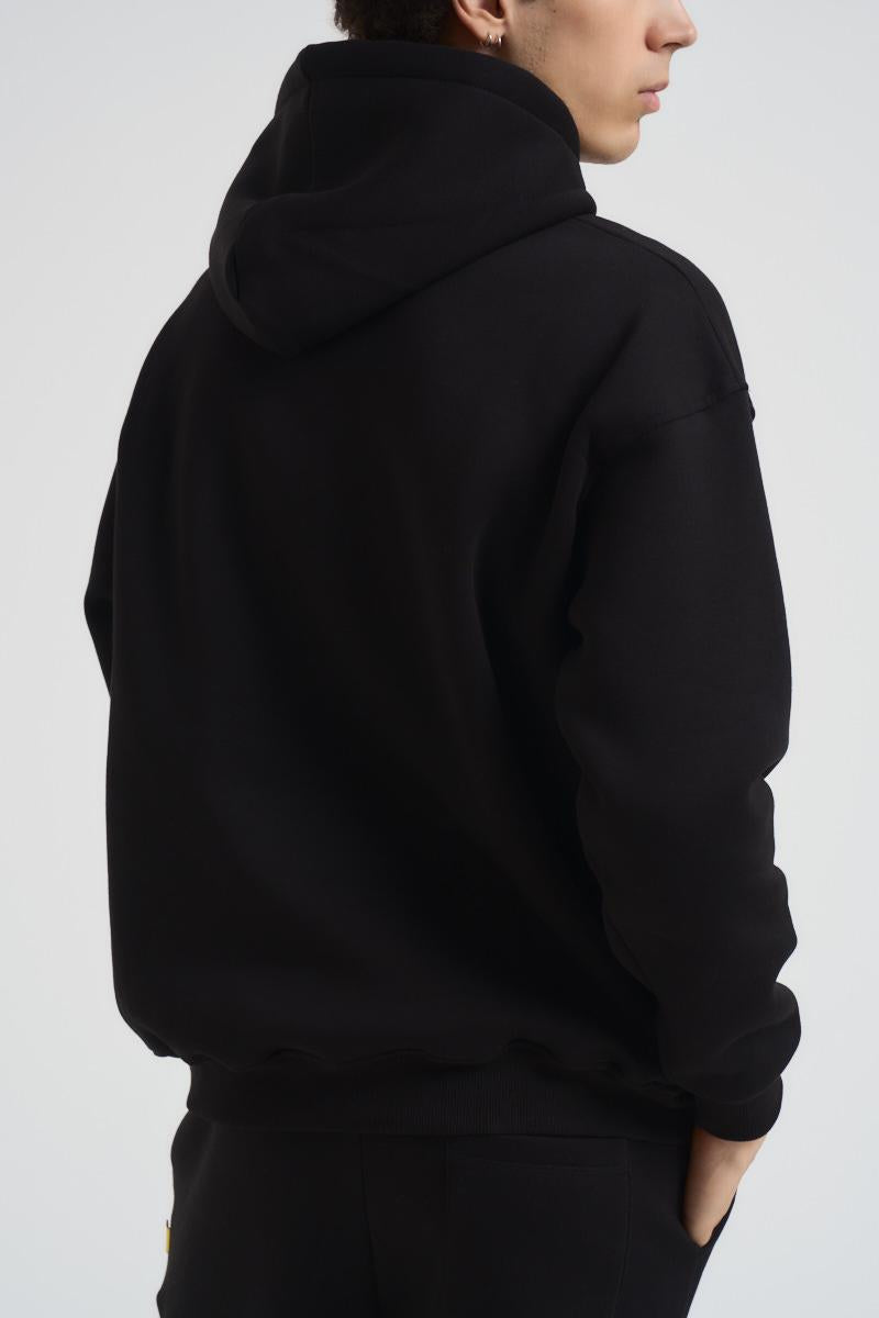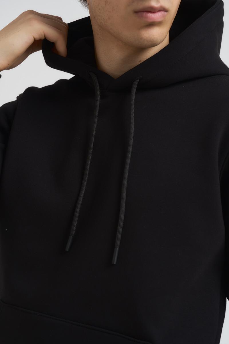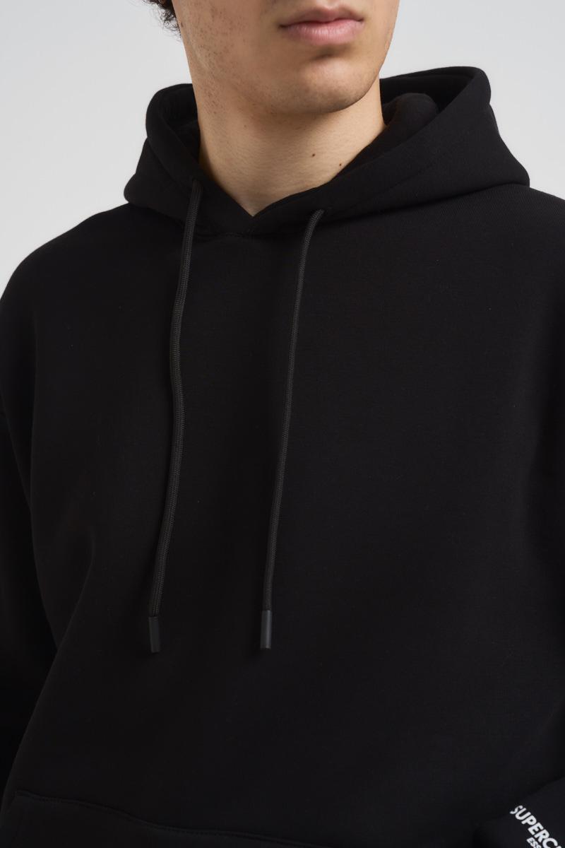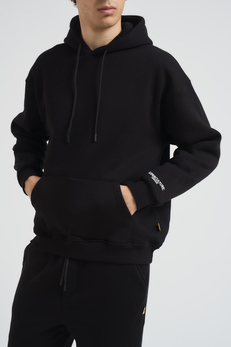 SUPERCULTURE Felpa uomo con cappuccio nera. Modello con tasca a marsupio sul davanti, cappuccio con coulisse, stampa brand in bianco sulla manica a sinistra. Boxy fit. Composizione: 65% cotone 35% poliestere. Il modello è alto 190 cm e indossa la taglia L.