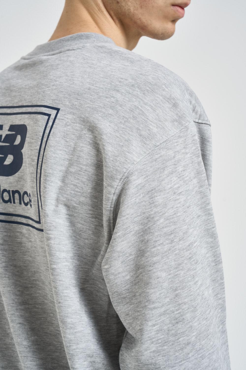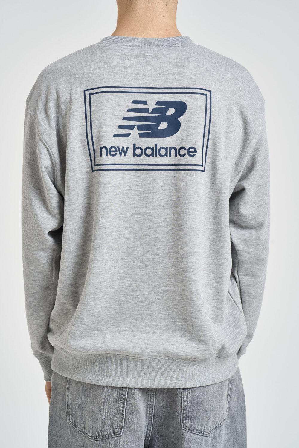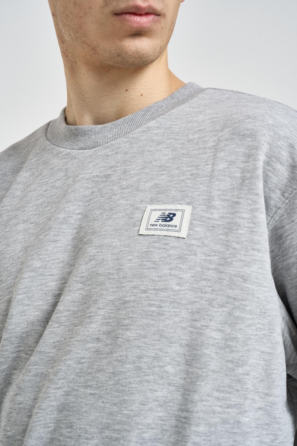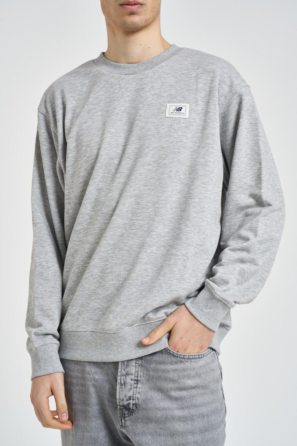 NEW BALANCE Felpa uomo girocollo grigia. Modello regular fit. Manica lunga. Sul petto è applicata una patch con logo New Balance a contrasto e stampa sul retro. Dettagli a costine. Composizione: 60% cotone, 40% poliestere. Il modello è alto 190cm e indossa la taglia L.