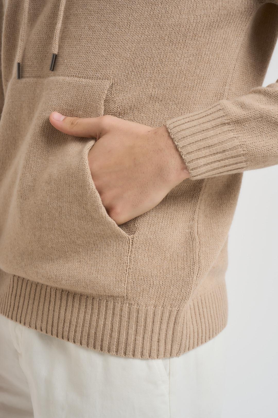OUTFIT Felpa uomo in maglia cammello. Modello a maniche lunghe con cappuccio regolabile da laccio, tasca unica centrale. Polsini e fondo a costine. Composizione: 80% 20% cashemere. Il modello è alto 190cm e indossa la taglia L.