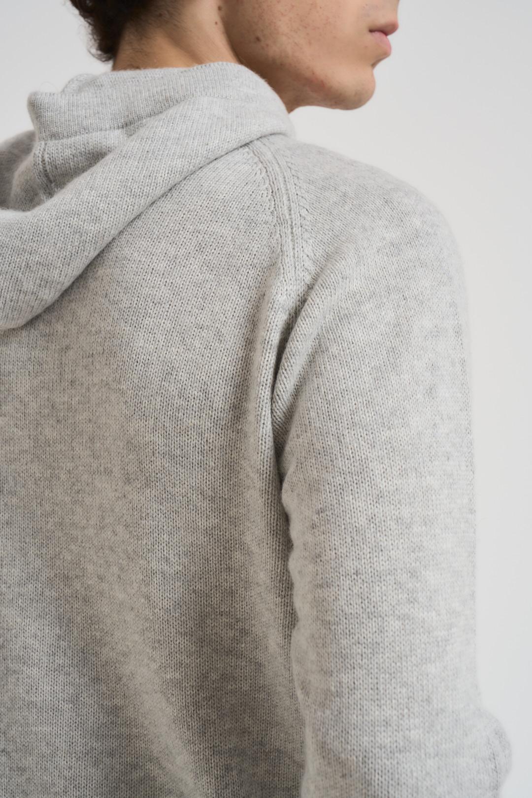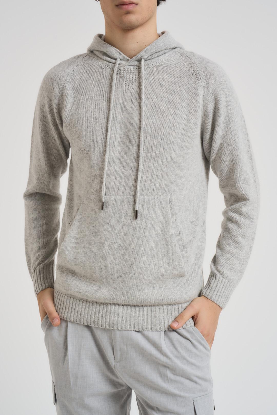 OUTFIT Felpa uomo in maglia grigio chiaro. Modello a maniche lunghe con cappuccio regolabile da laccio, tasca unica centrale. Polsini e fondo a costine. Composizione: 80% 20% cashemere. Il modello è alto 190cm e indossa la taglia L.