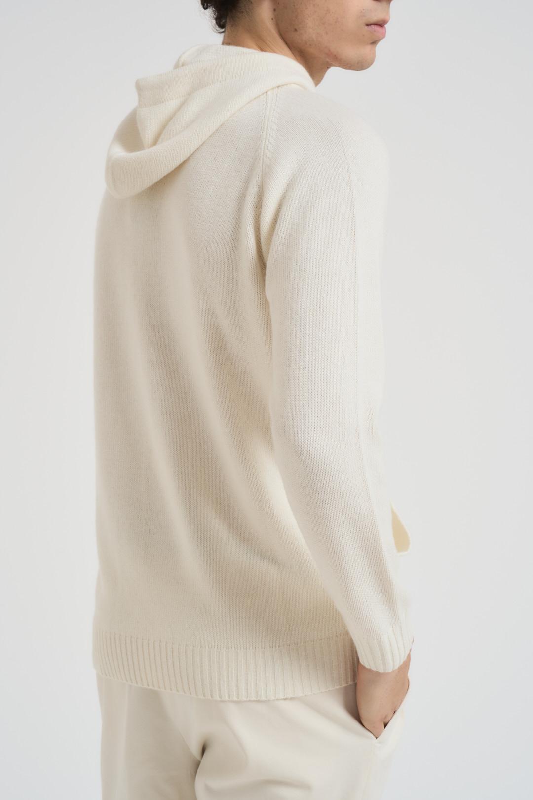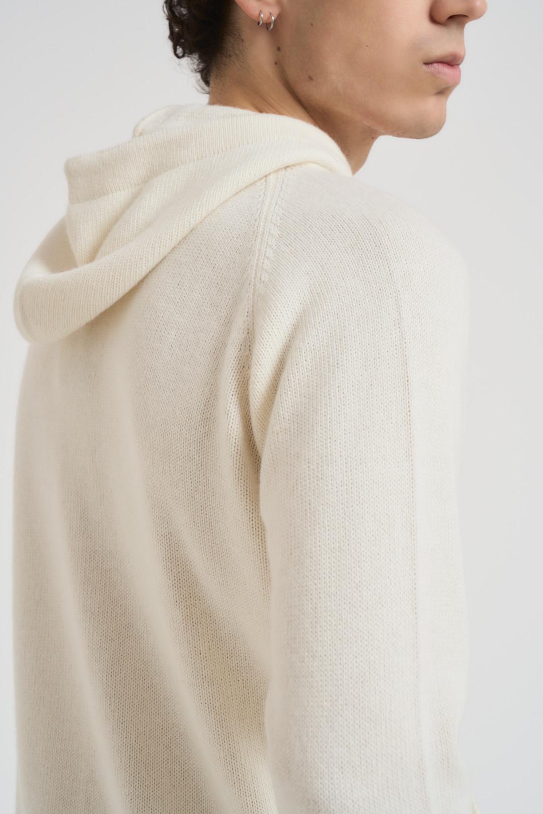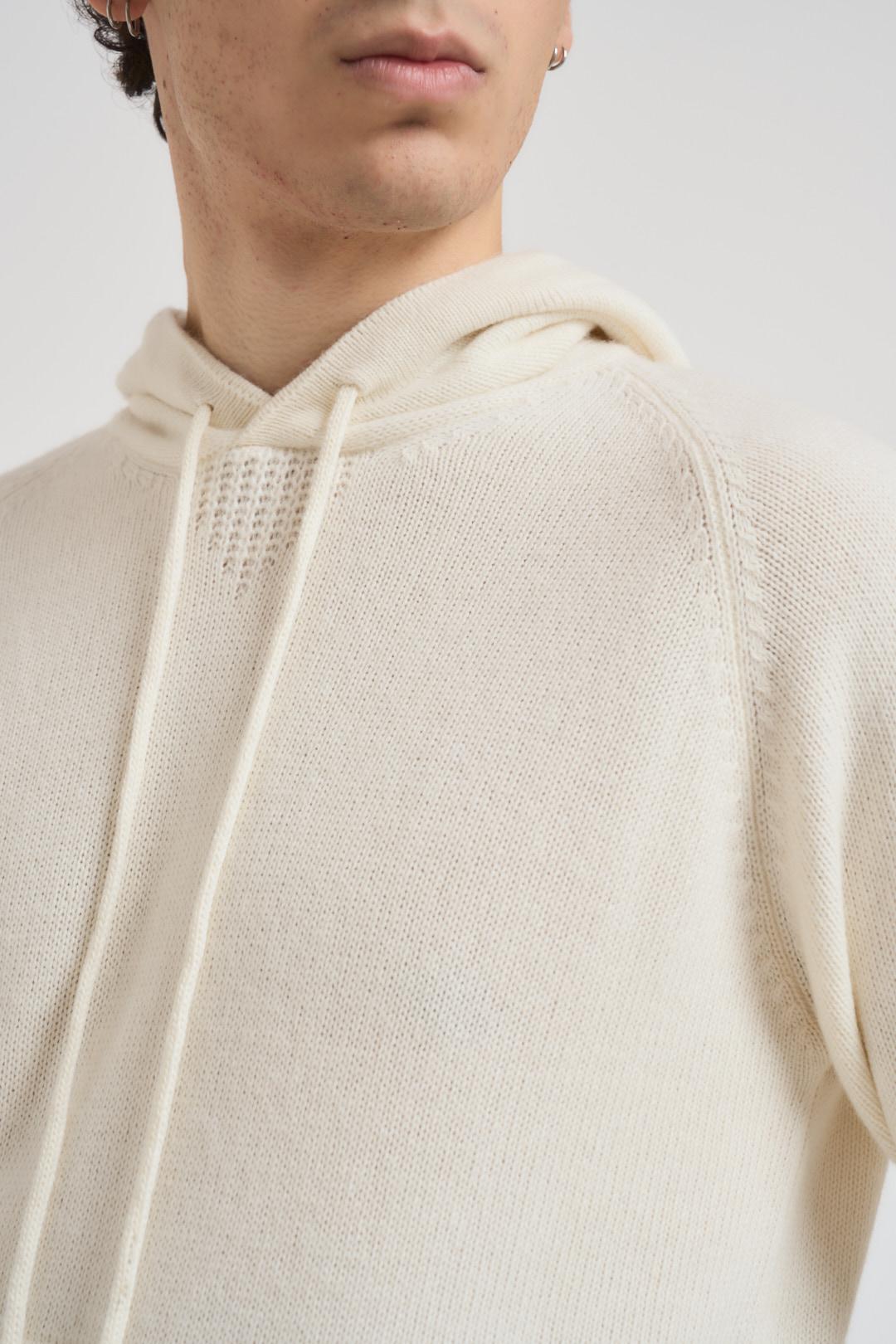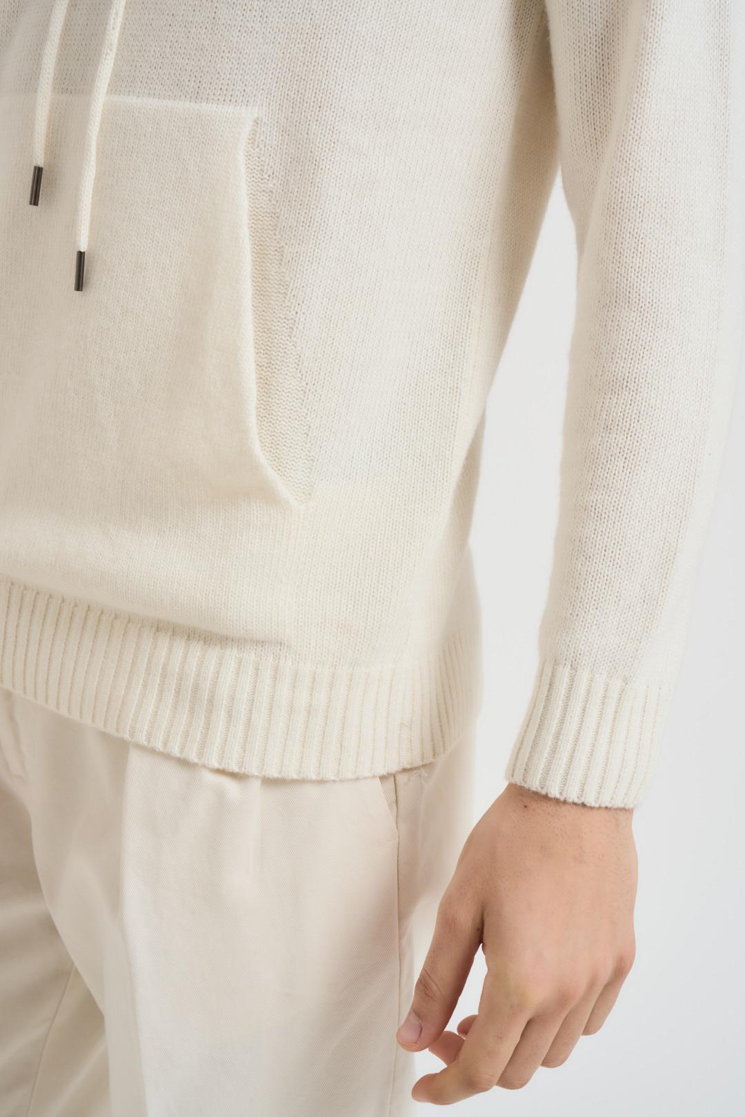 OUTFIT Felpa uomo in maglia panna. Modello a maniche lunghe con cappuccio regolabile da laccio, tasca unica centrale. Polsini e fondo a costine. Composizione: 80% 20% cashemere. Il modello è alto 190cm e indossa la taglia L.