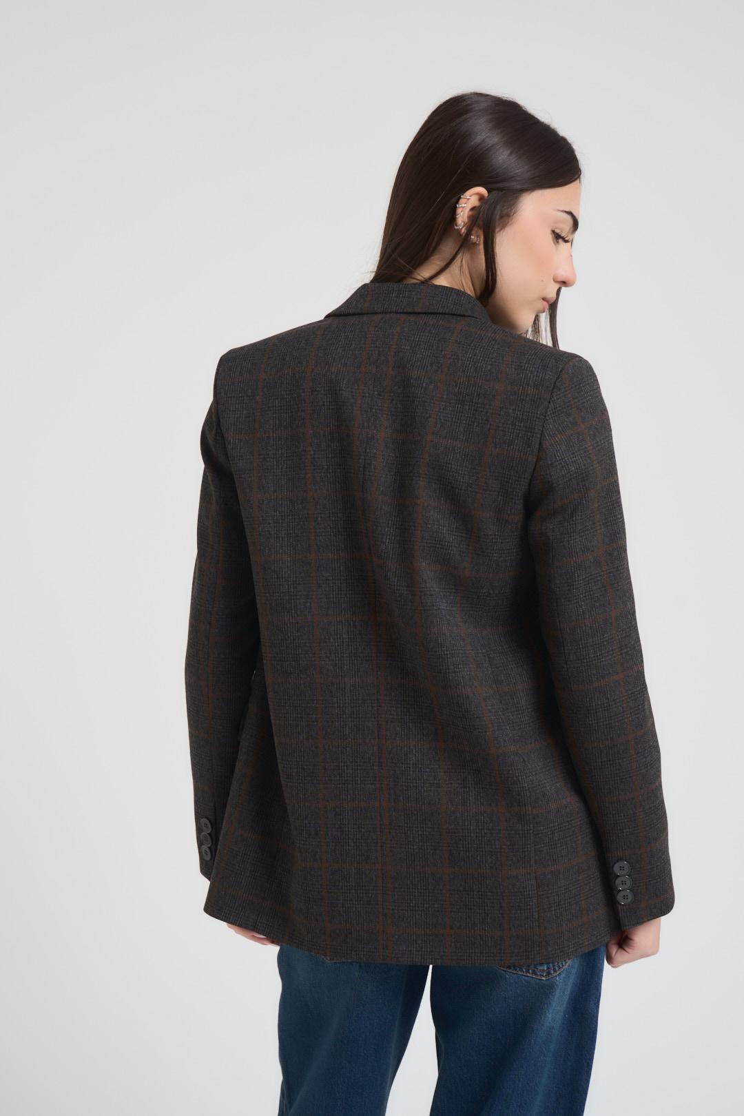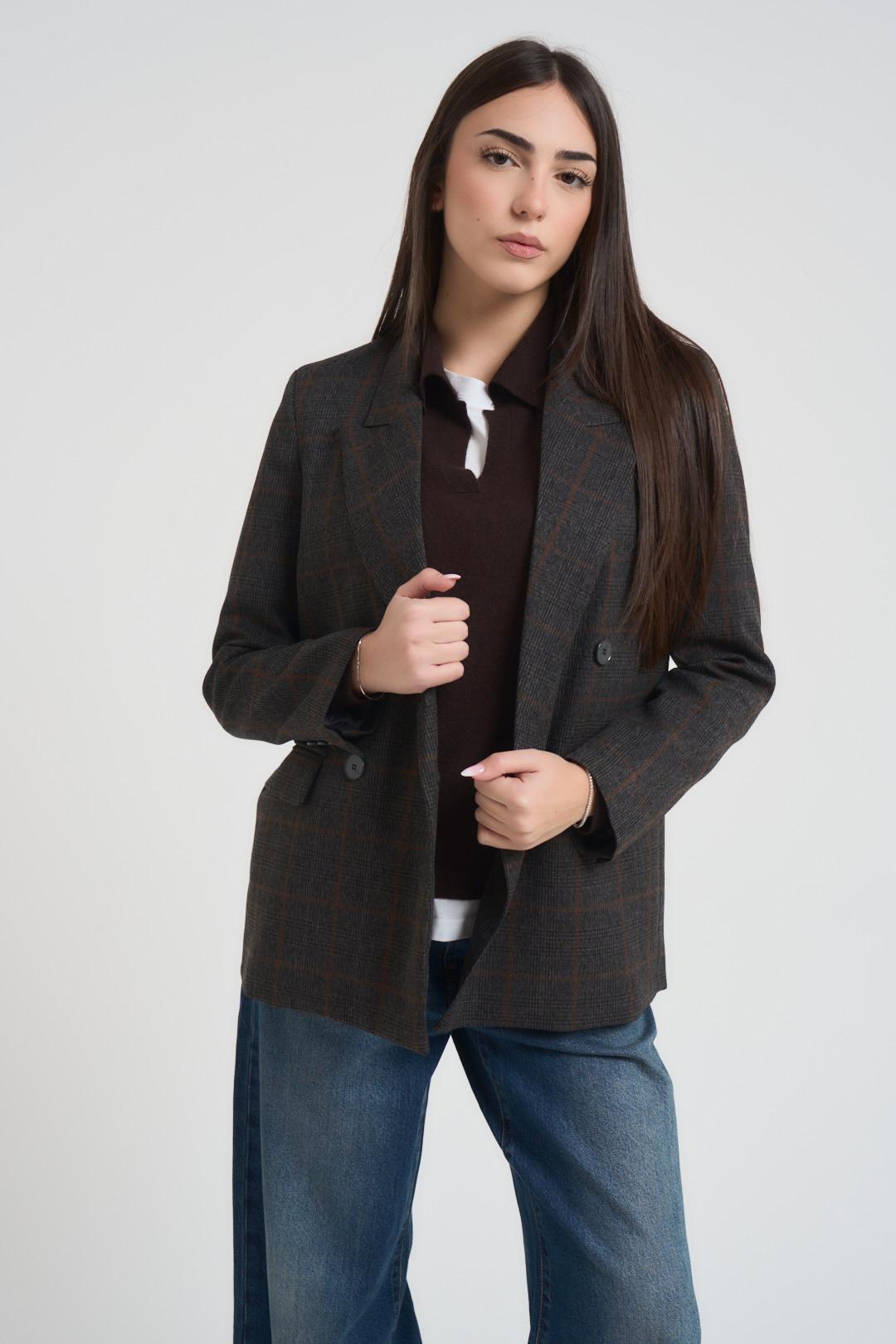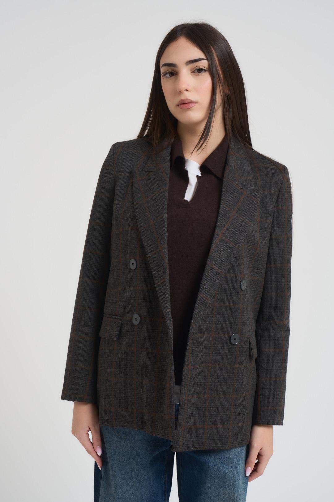 VICOLO Giacca donna doppiopetto a quadri grigia. Modello con fantasia a quadri grigia e rosso mattone, due tasche a patta laterali. Composizione: 65% poliestere 32% viscosa 3%elastane.La modella è alta 172 cm e indossa la taglia S.