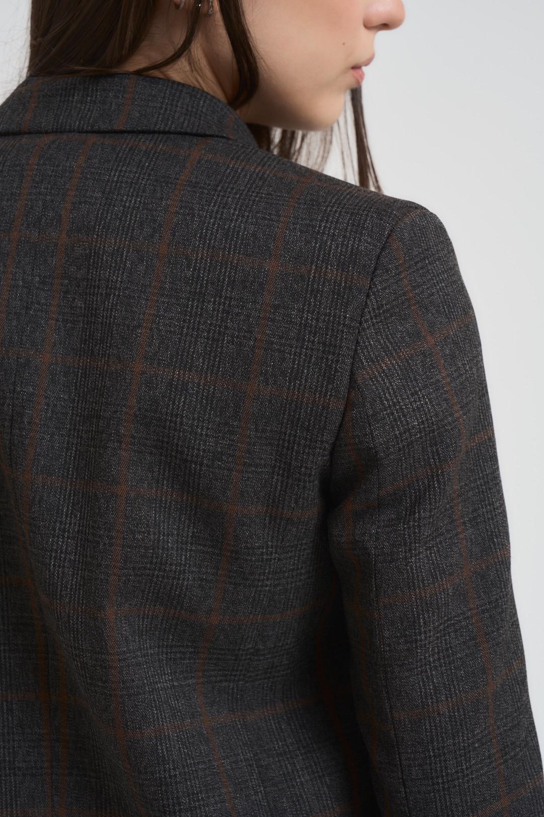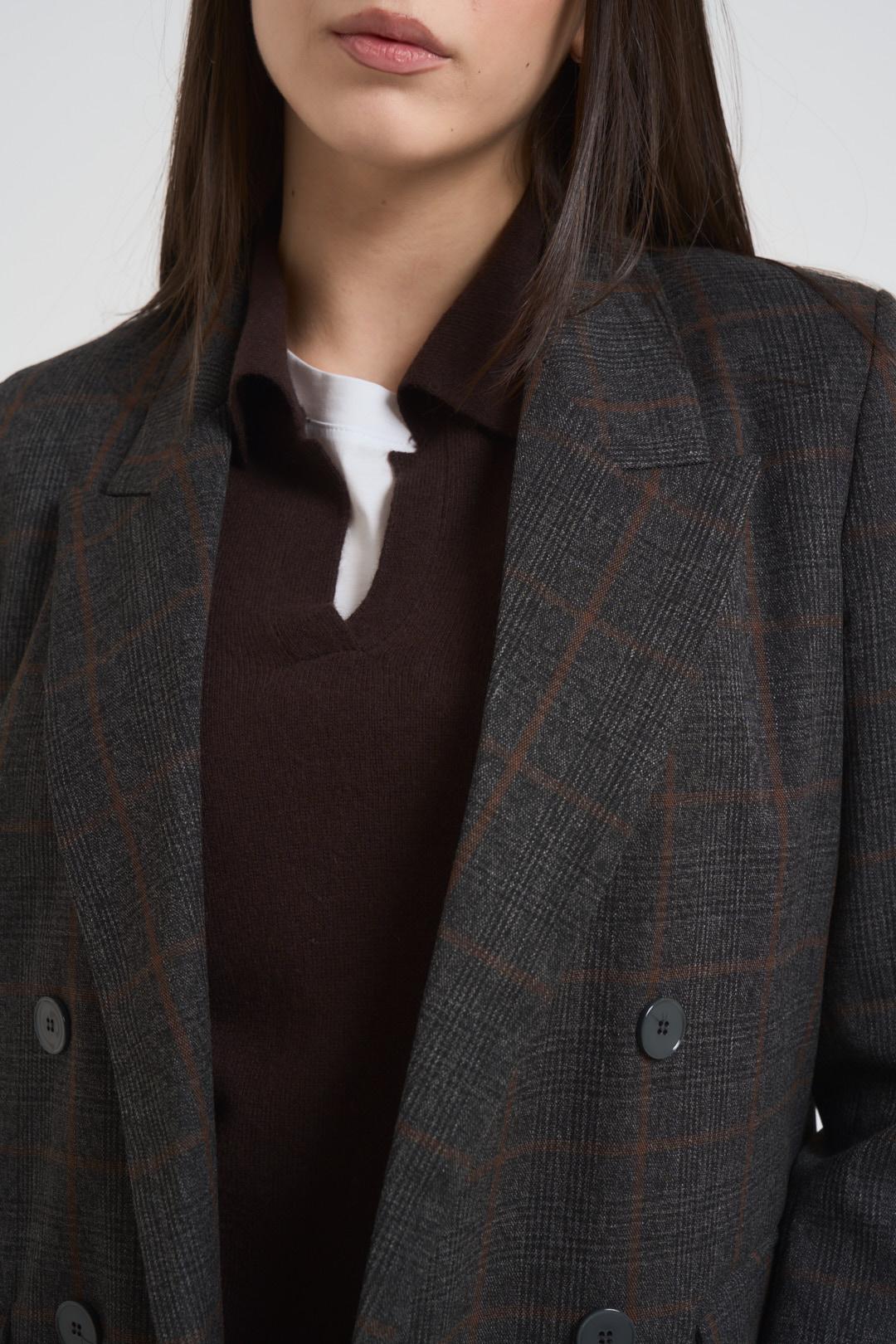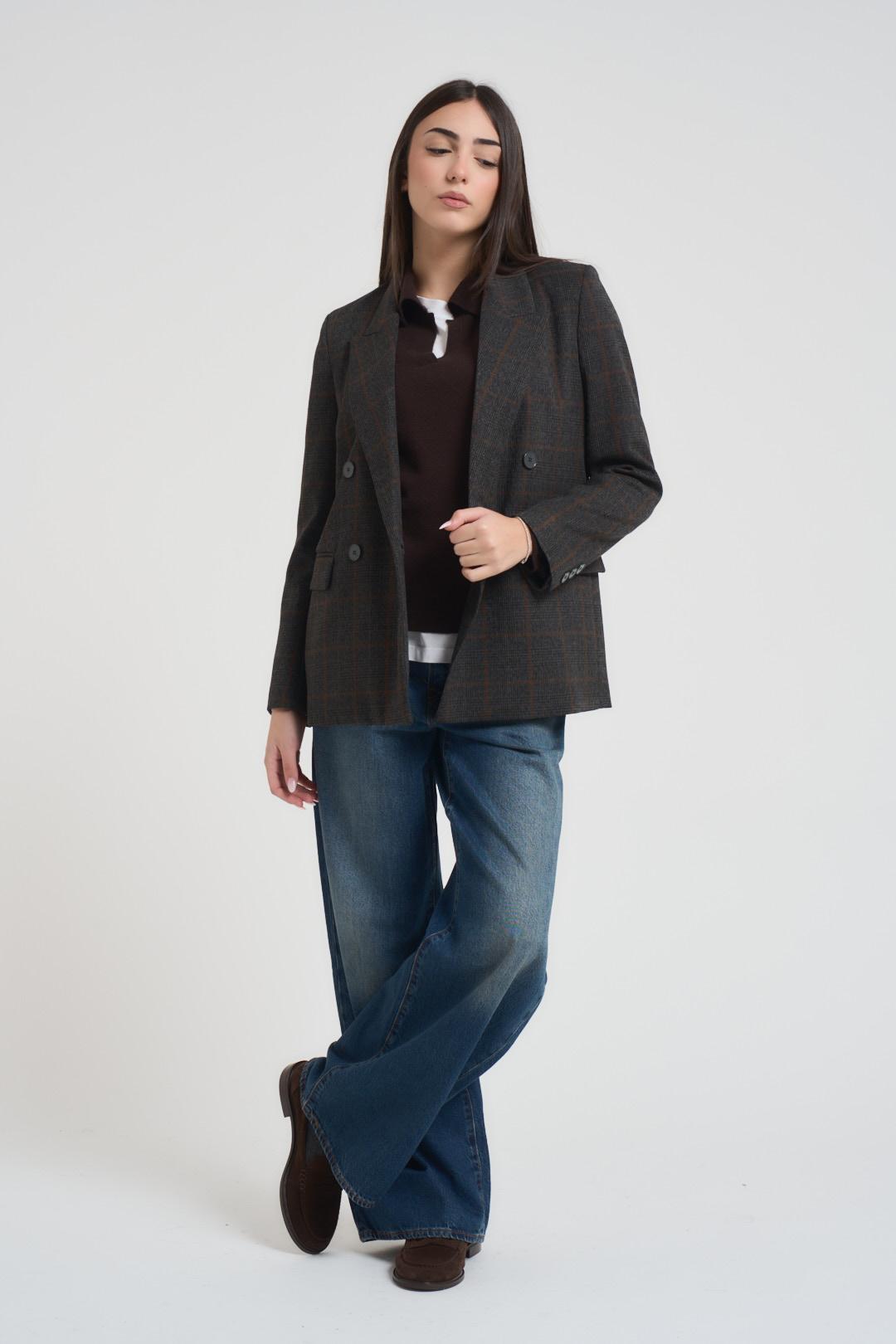VICOLO Giacca donna doppiopetto a quadri grigia. Modello con fantasia a quadri grigia e rosso mattone, due tasche a patta laterali. Composizione: 65% poliestere 32% viscosa 3%elastane.La modella è alta 172 cm e indossa la taglia S.