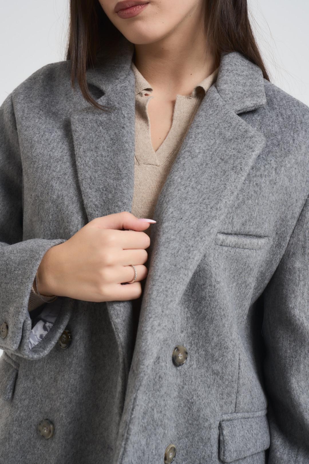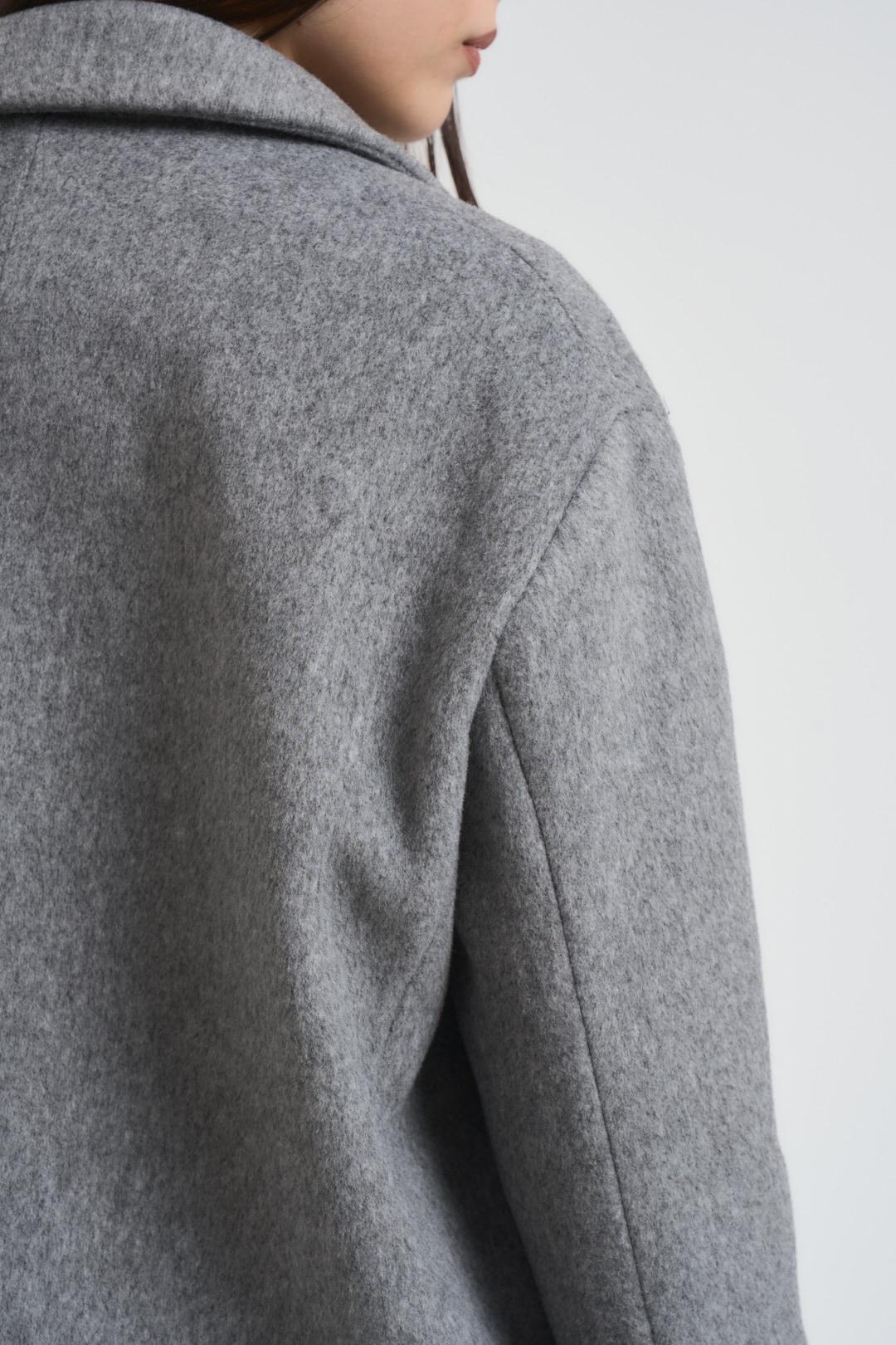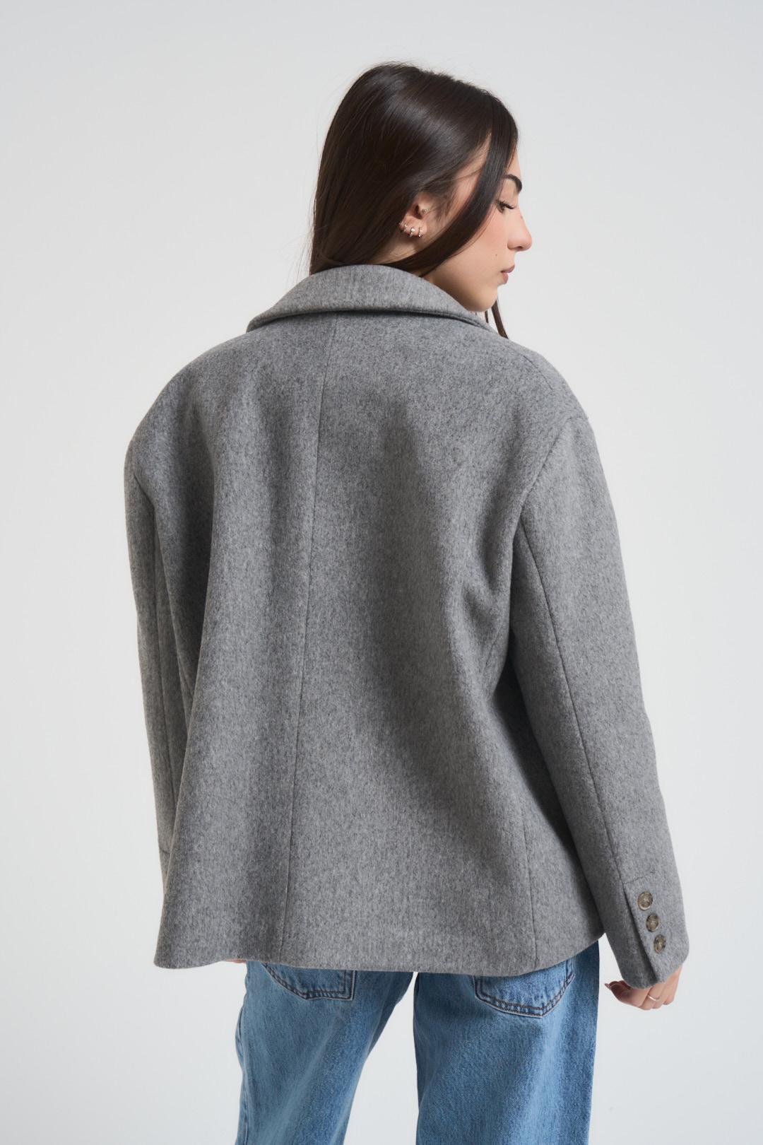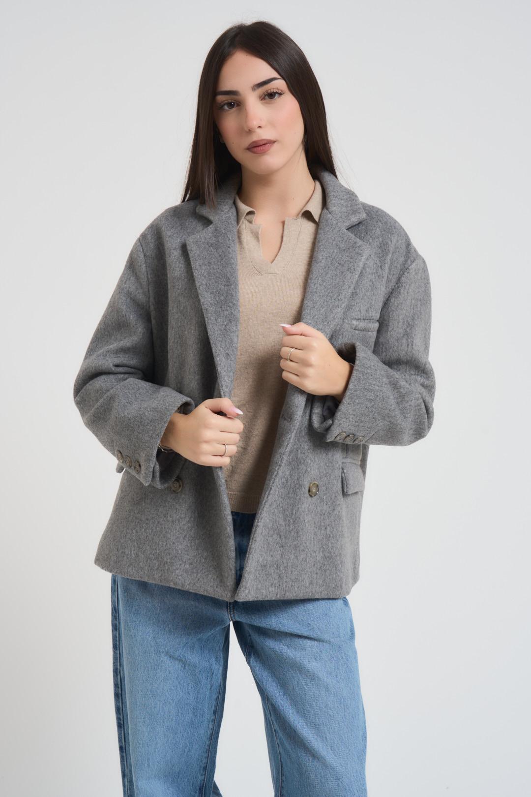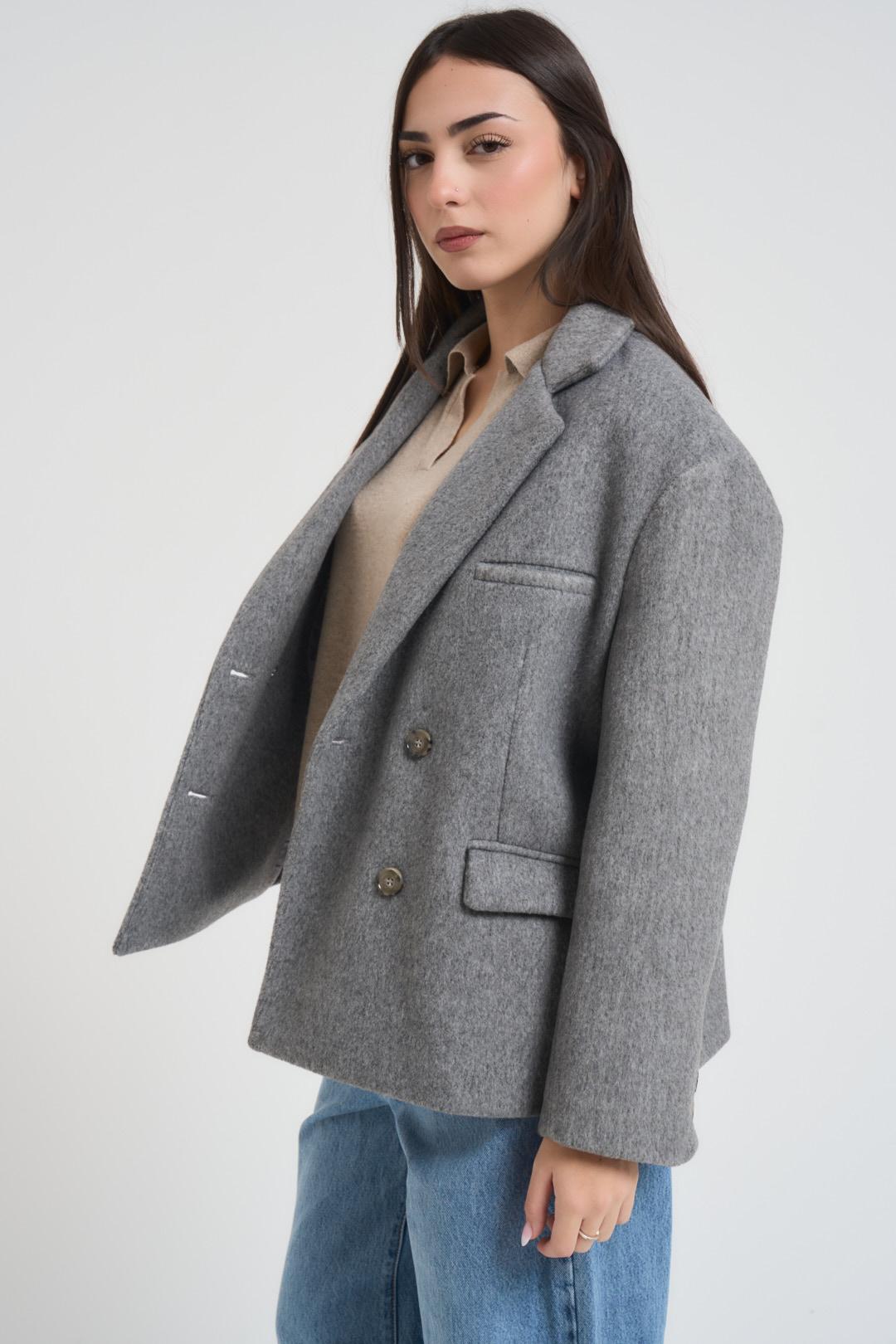 TENSIONE IN Giacca donna doppiopetto grigia. Modello corto. Chiusura con bottoni. Due tasche con patta. Tasca a filo sul petto. Manica lunga. Bottoni su fondo manica. Composizione: 90% poliestere, 10% elastane. La modella è alta 172 cm e indossa la taglia UNI.