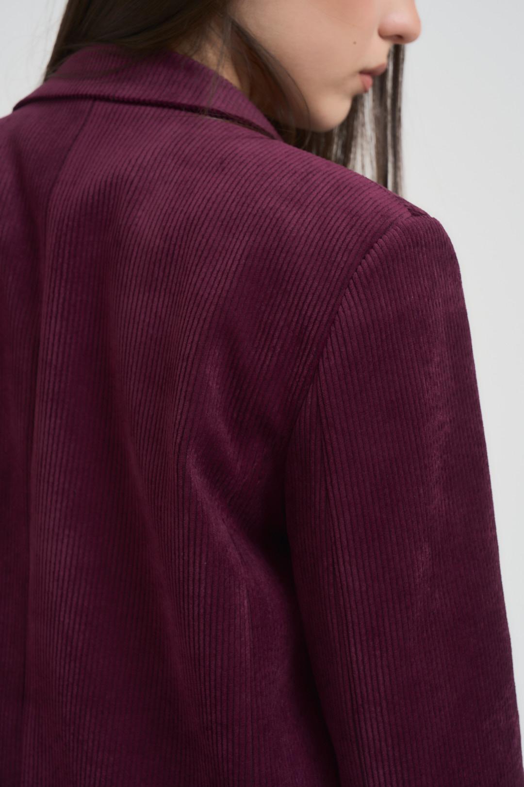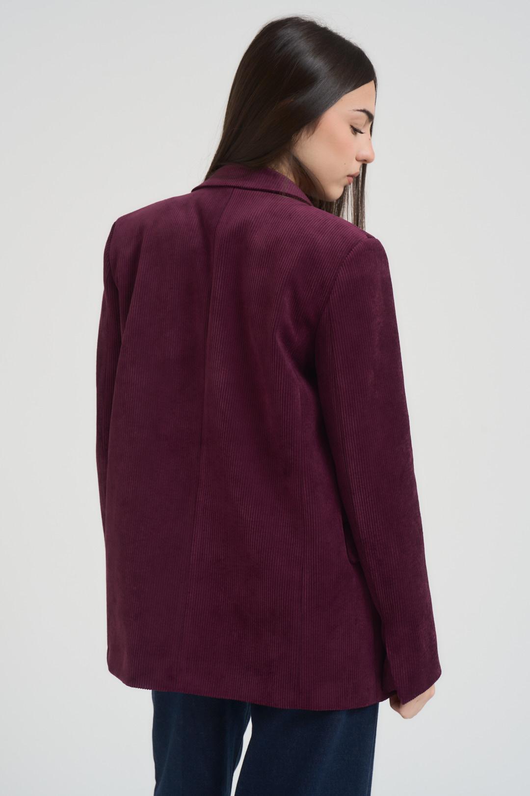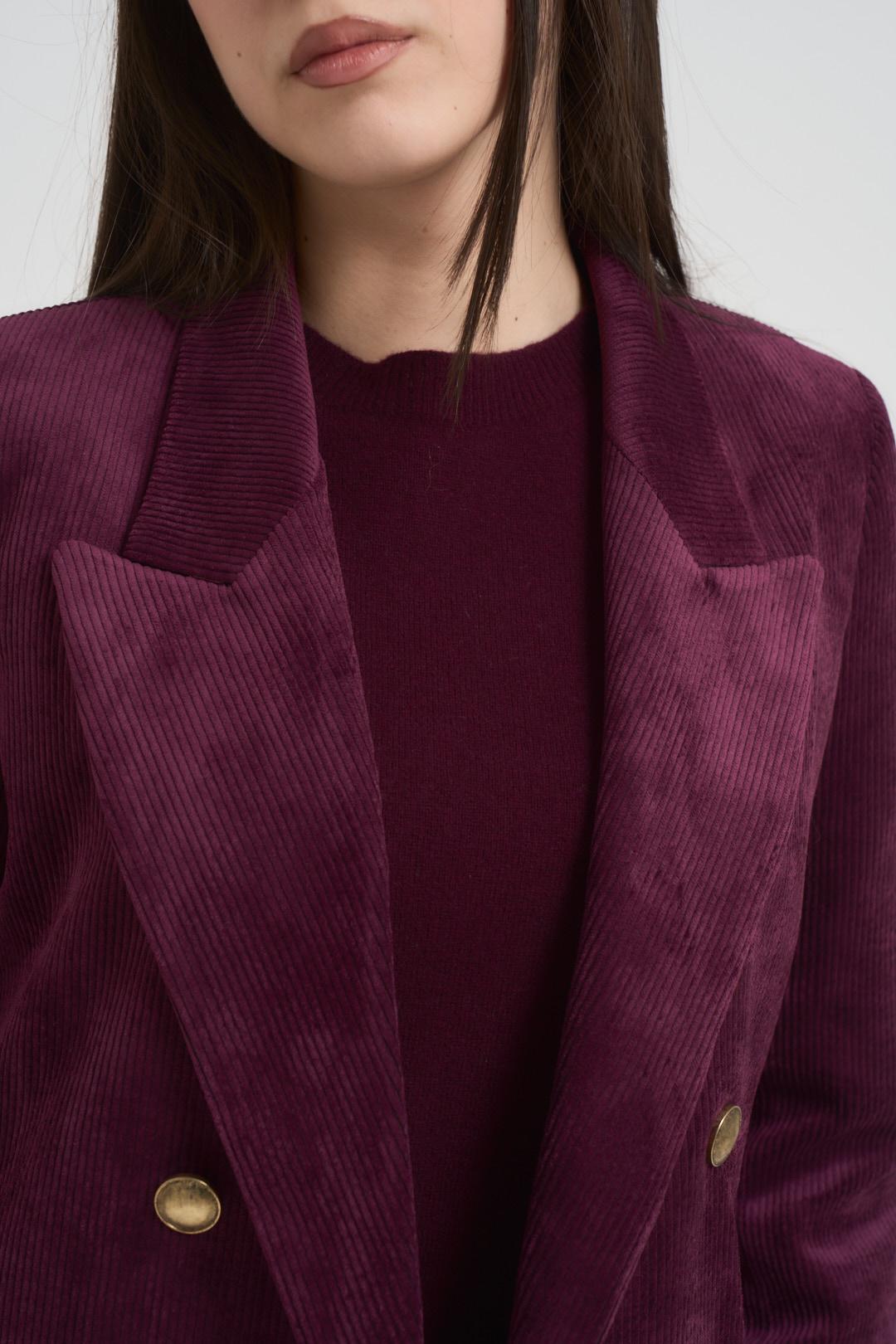 VICOLO Giacca donna doppiopetto in velluto bordeaux. Modello con chiusura a bottoni dorati, classico collo a rever e due tasche con pattina. Composizione: 86% poliestere 12%poliammide 2% elastane. La modella è alta 172 cm e indossa la taglia S.