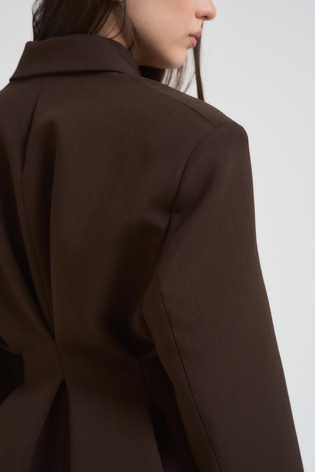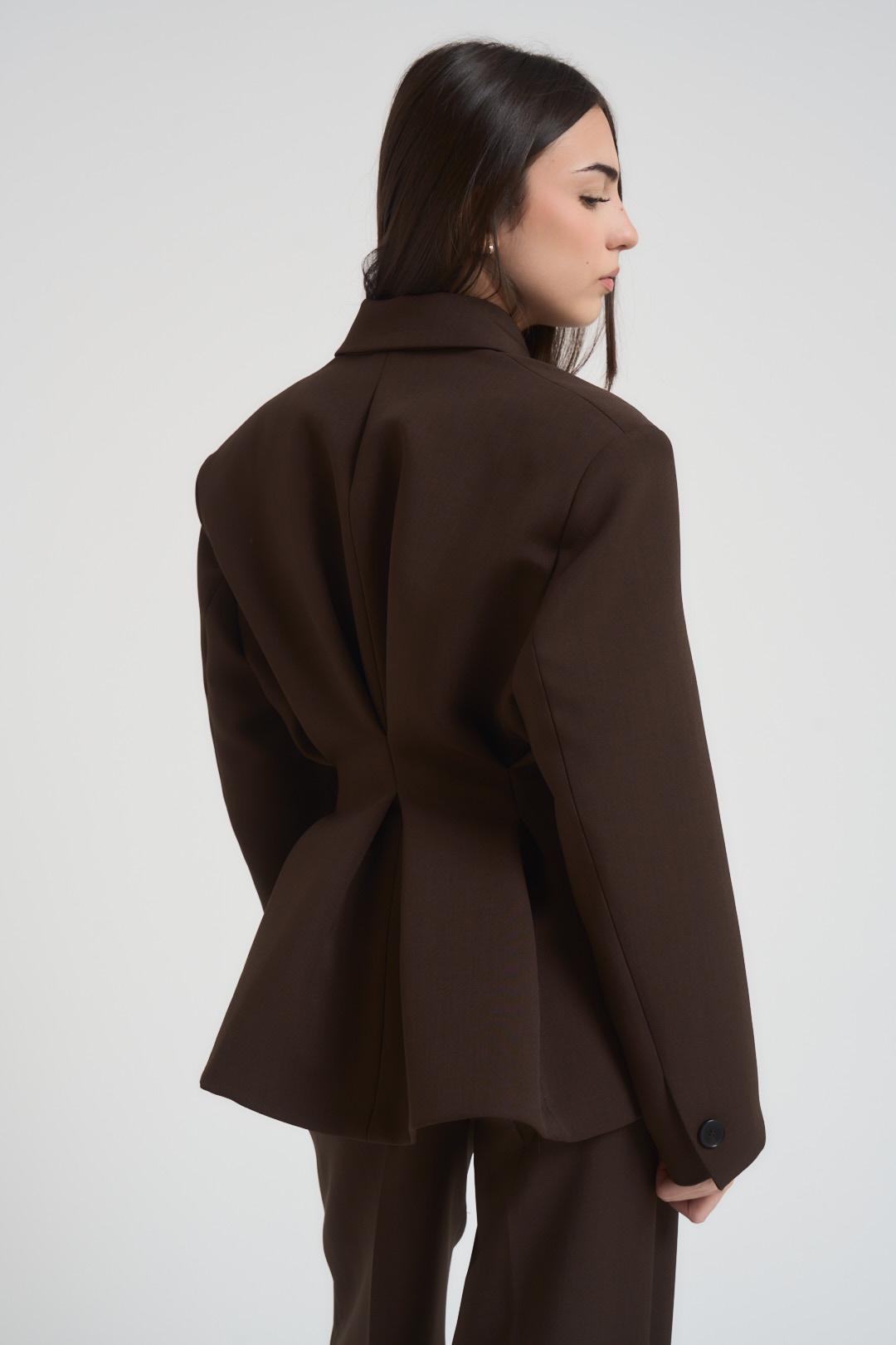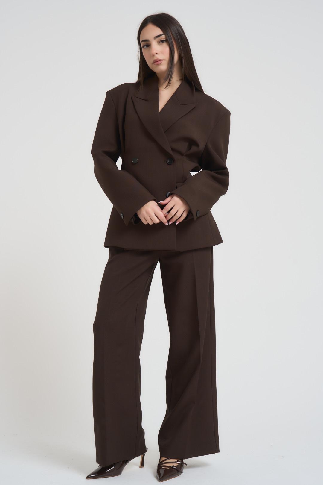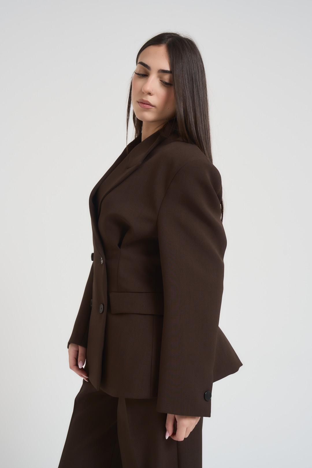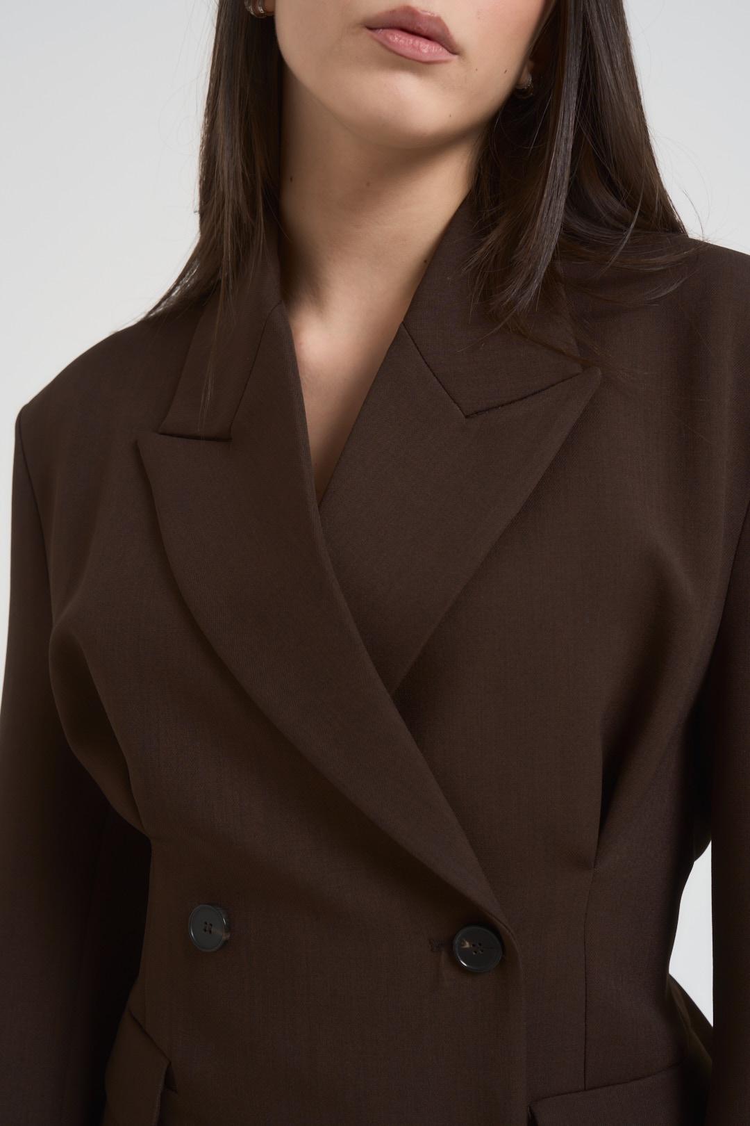 VICOLO Giacca donna doppiopetto marrone. Modello con chiusura a bottoni, fit stretto in vita e sfiancato sul fondo, spalle imbottite, classico collo a rever. Composizione: 62% acetato 38% viscosa. La modella è alta 172 cm e indossa la taglia S.
