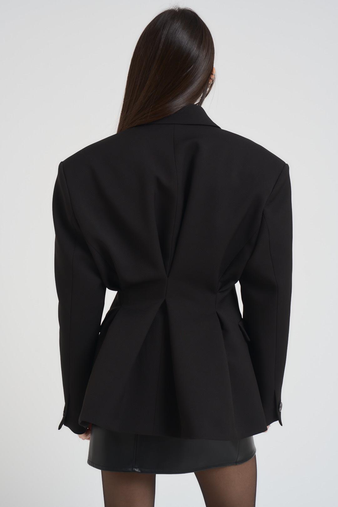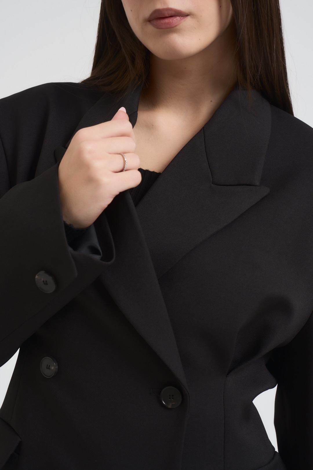 VICOLO Giacca donna doppiopetto nera. Modello con chiusura a bottoni, fit stretto in vita e sfiancato sul fondo, spalle imbottite, classico collo a rever. Composizione: 62% acetato 38% viscosa. La modella è alta 172 cm e indossa la taglia S.