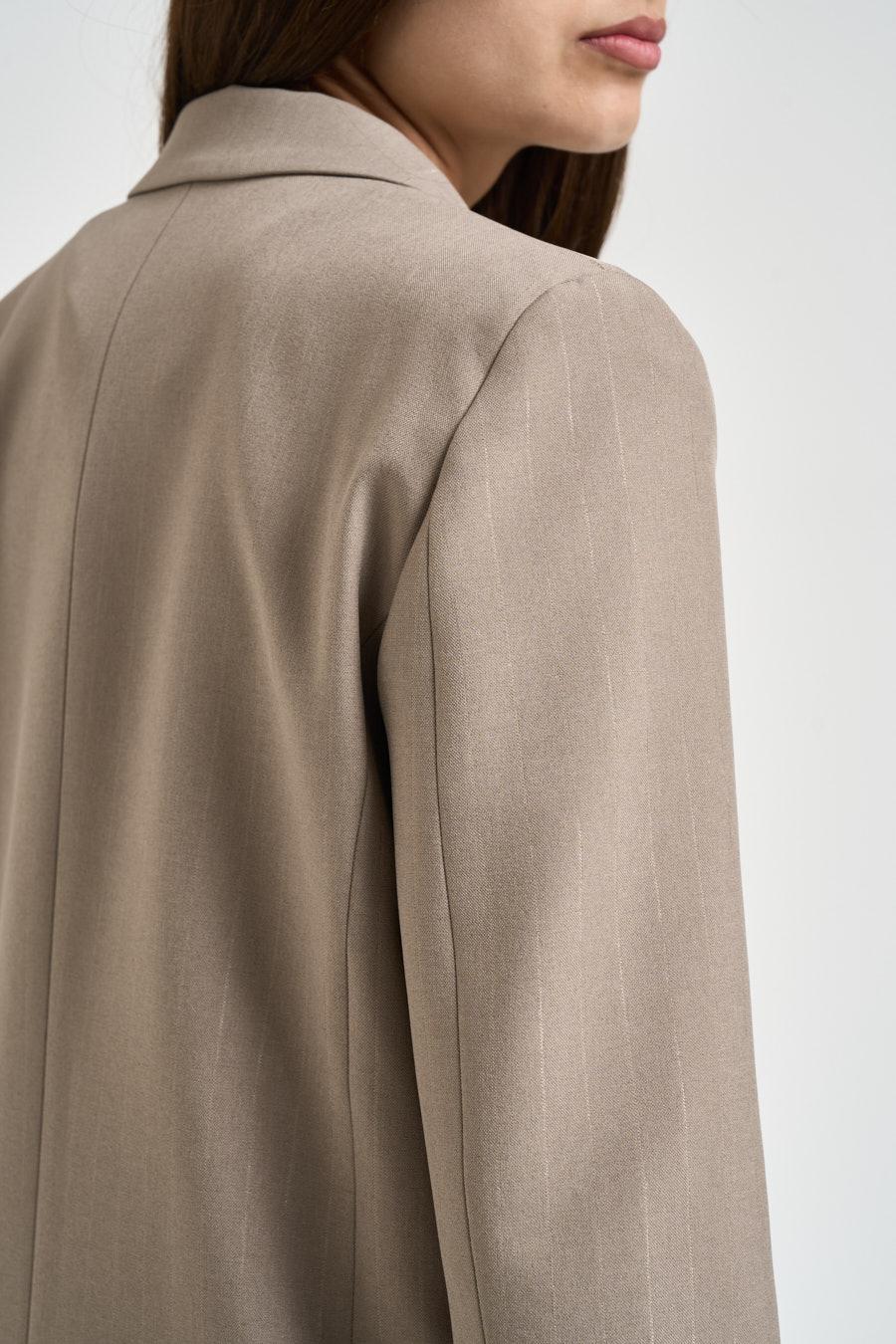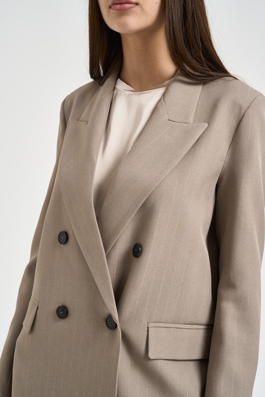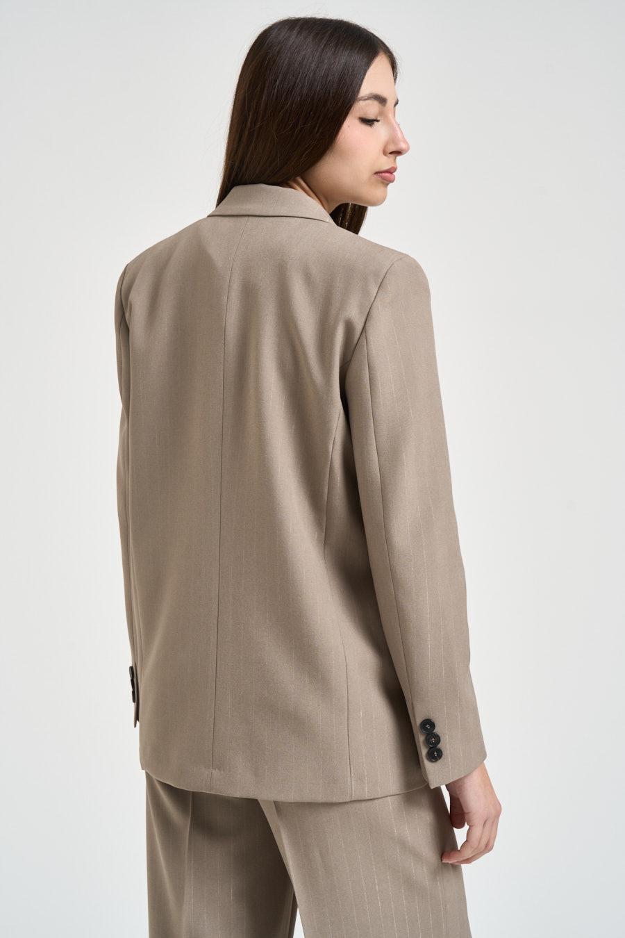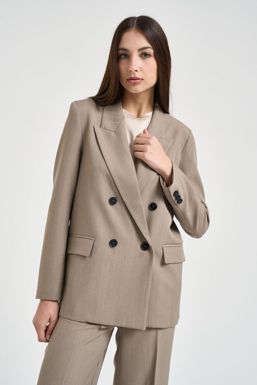 VICOLO Giacca donna gessata tortora. Modello doppiopetto. Chiusura frontale con bottoni. Rever classico. Patte davanti. Manica lunga. Bottoni su fondo manica. Composizione: 100% poliestere. La modella è alta 176 cm e indossa la taglia S.