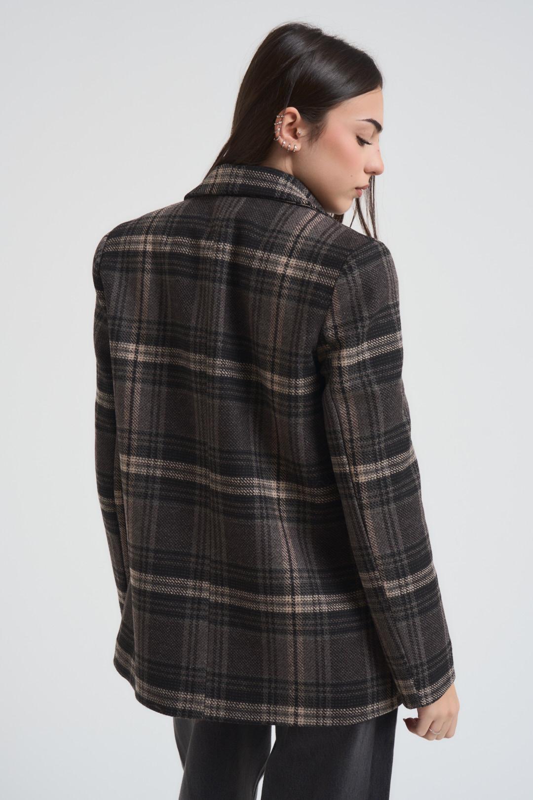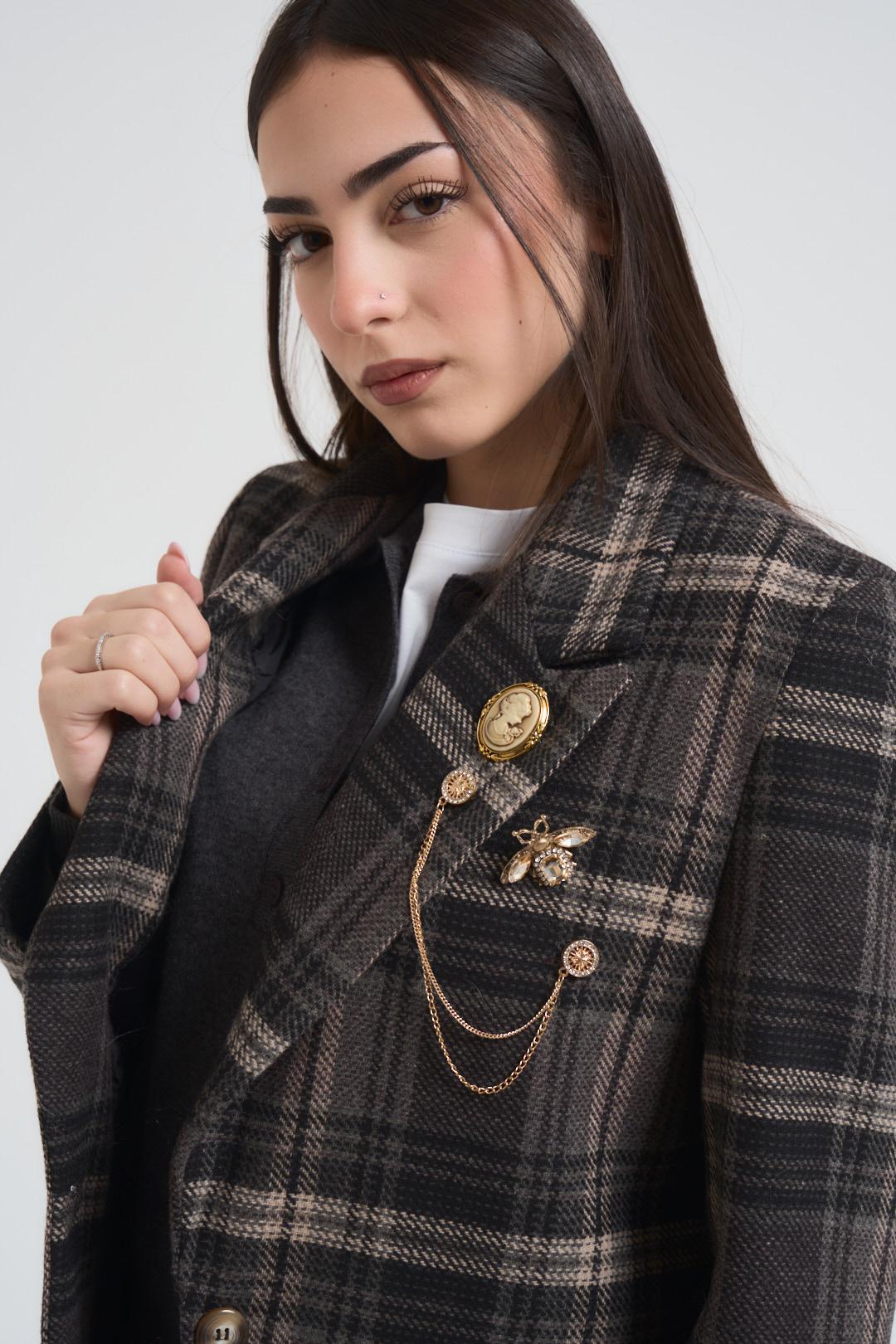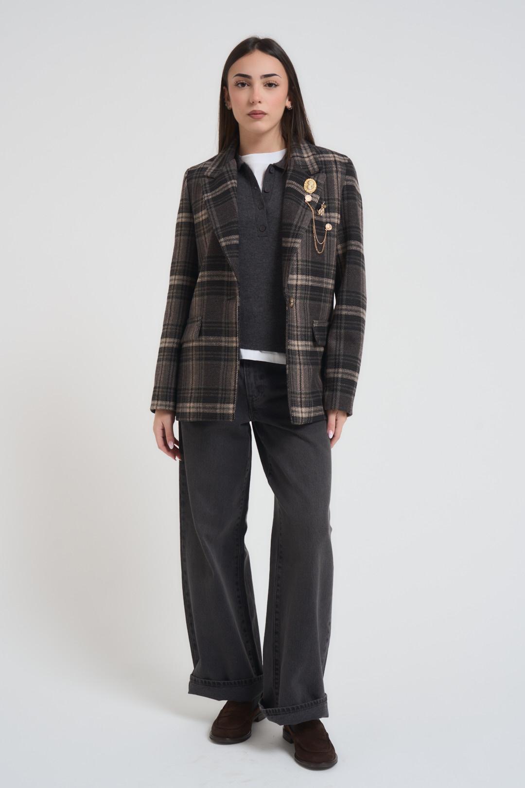 VICOLO Giacca donna in check grigio. Modello monopetto. Chiusura con bottone. Rever classico. Tasche con patta. Manica lunga. Decorazione con spille. Composizione: 70% poliestere, 16% lana, 15% viscosa. La modella è alta 172 cm e indossa la taglia S.