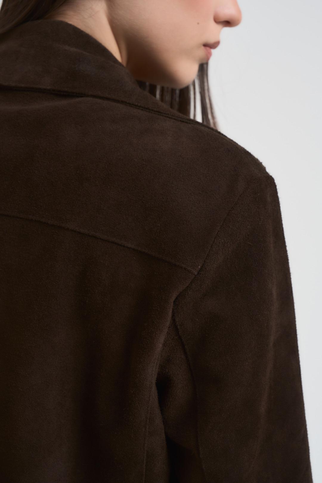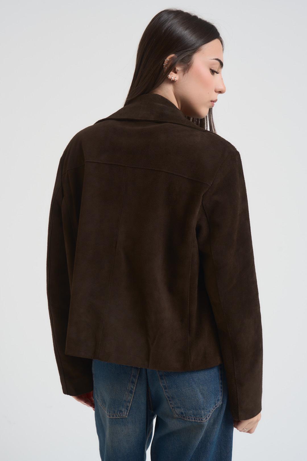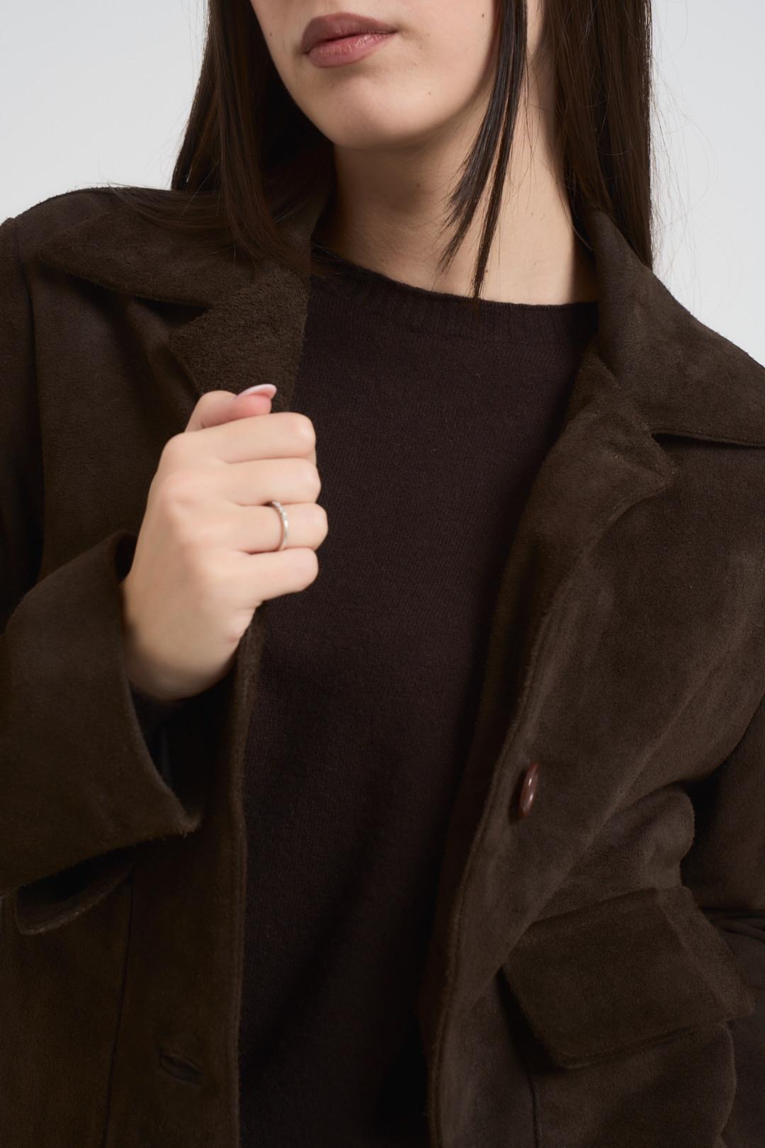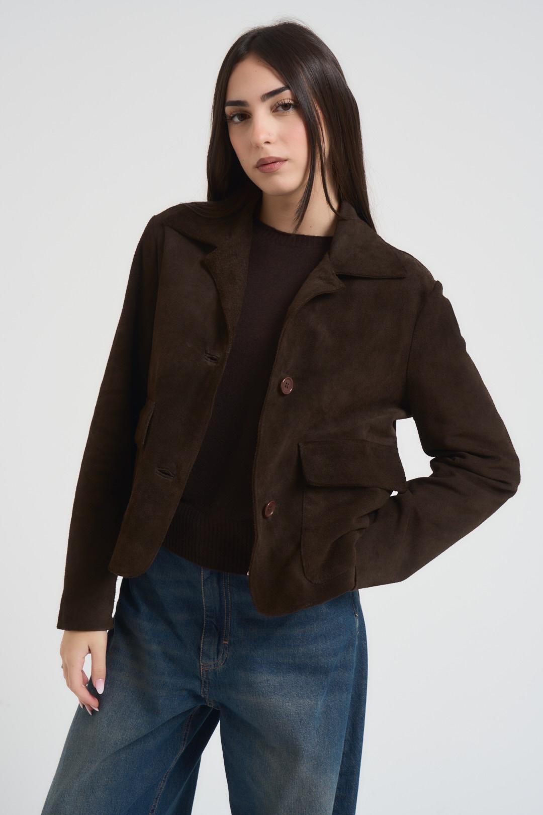 VITTO Giacca donna scamosciata moro. Modello corto. Chiusura frontale con bottoni. Colletto classico. Due tasche frontali con patta. Manica lunga. Composizione: 100% vera pelle. La modella è alta 172 cm e indossa la taglia S.