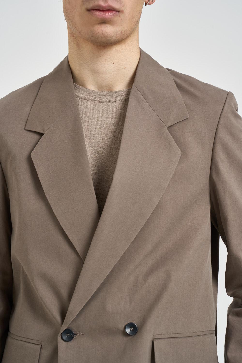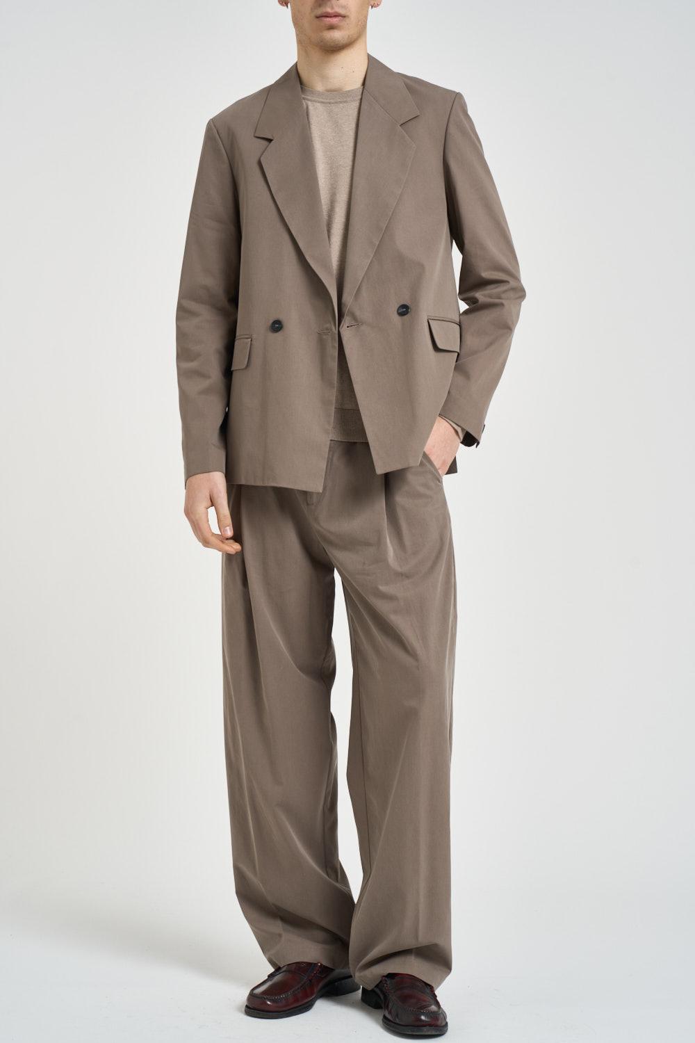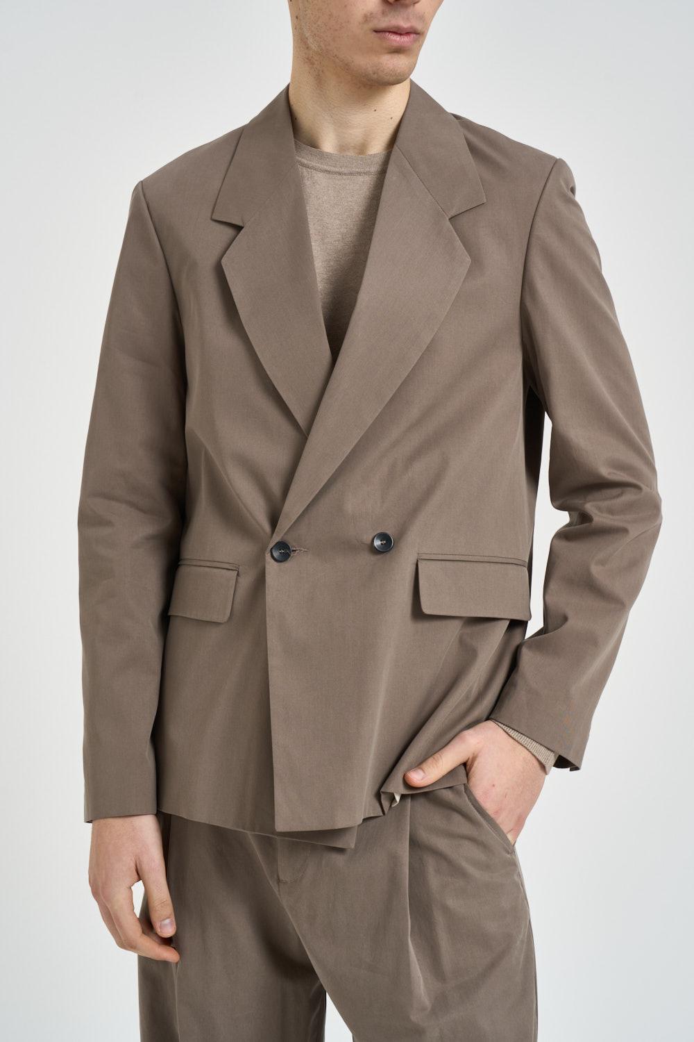 ALTA TENSIONE Giacca uomo doppiopetto fango. Modello dalla vestibilità morbida. Chiusura con bottone. Manica lunga. Bottone su fondo manica. Tasche con patta. Rever classico. Composizione: 50% Cotone, 50% Lyocell. Il modello è alto 190cm e indossa la taglia 50.
