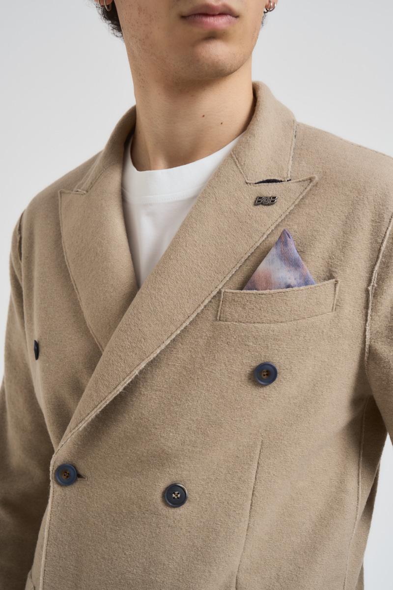 BOB Giacca uomo in maglia beige. Modello a doppiopetto con chiusura a bottoni, collo con rever, taschino sul petto e due tasche con patta, apertura sul retro. Composizione: 45% acrilico 32% poliestere 23% lana vergine. Il modello è alto 190 cm e indossa la taglia 50.