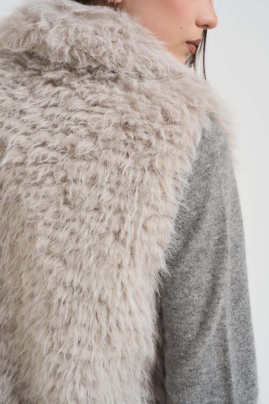 CENSURED Gilet donna ecopelliccia grigio chiaro. Modello con collo a camicia ampio, due tasche a filetto e chiusura con zip. Composizione: poliestere. La modella è alta 172cm e indossa la taglia S.