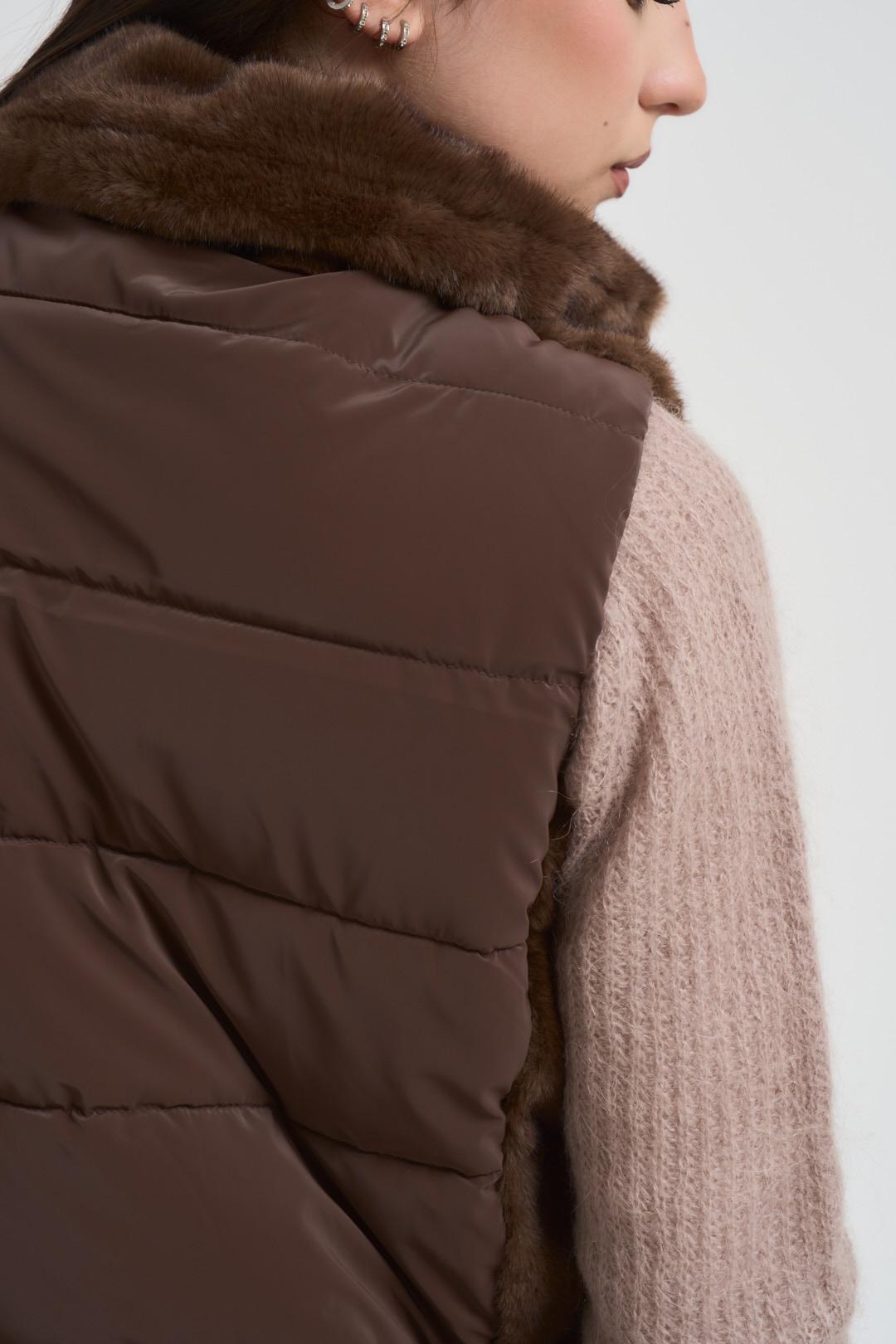 VITTO Gilet donna in ecopelliccia marrone. Modello trapuntato con collo alto e chiusura con zip, due tasche a filetto. Composizione: poliestere. La modella è alta 172cm e indossa la taglia S.