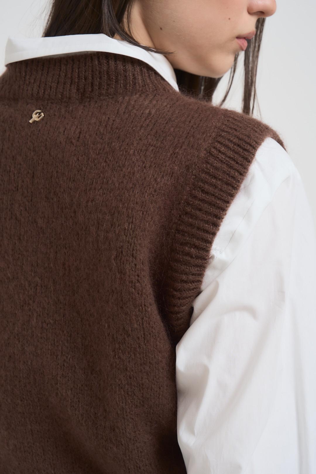 PHILIA Gilet donna in maglia marrone. Modello girocollo, regular fit. Dettagli a costine. Composizione: 44% acrilica, 26% polammide, 20% mohair, 10% lana. La modella è alta 172 cm e indossa la taglia unica.