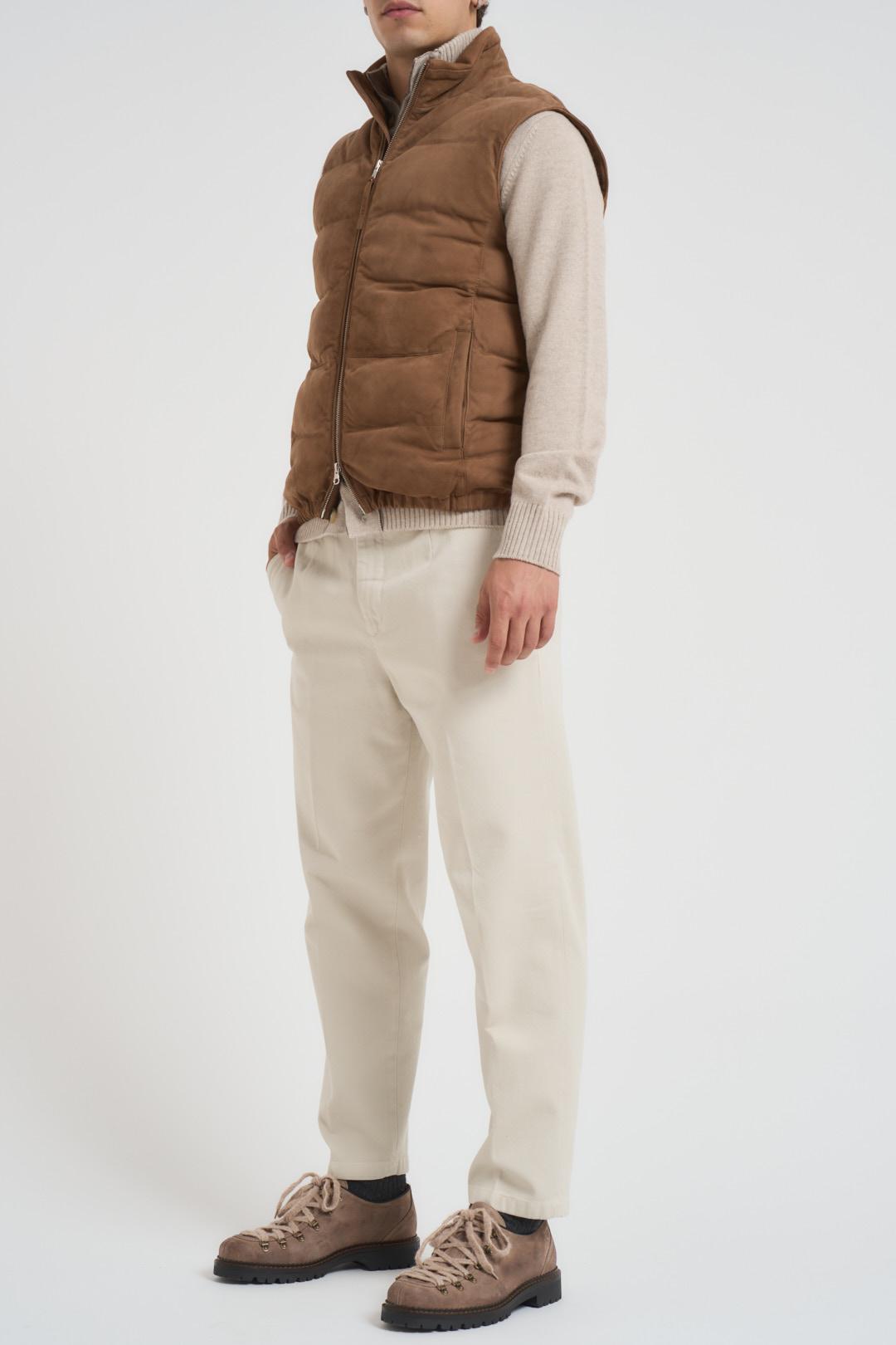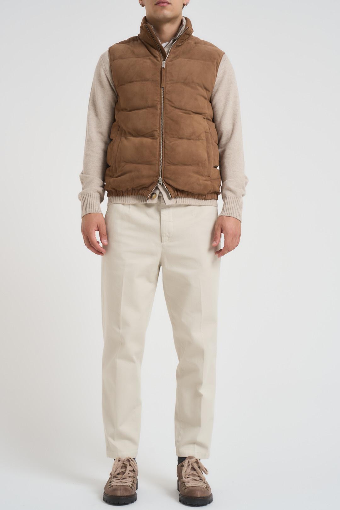 AT.P.CO Gilet uomo in camoscio cammello. Modello imbottito con trapuntatura orizzontale. Collo alto, chiusura con zip a doppio cursore logato e tasche a filetto sui fianchi. Composizione: 100% Lino. Il modello è alto 185 cm e indossa la taglia L.