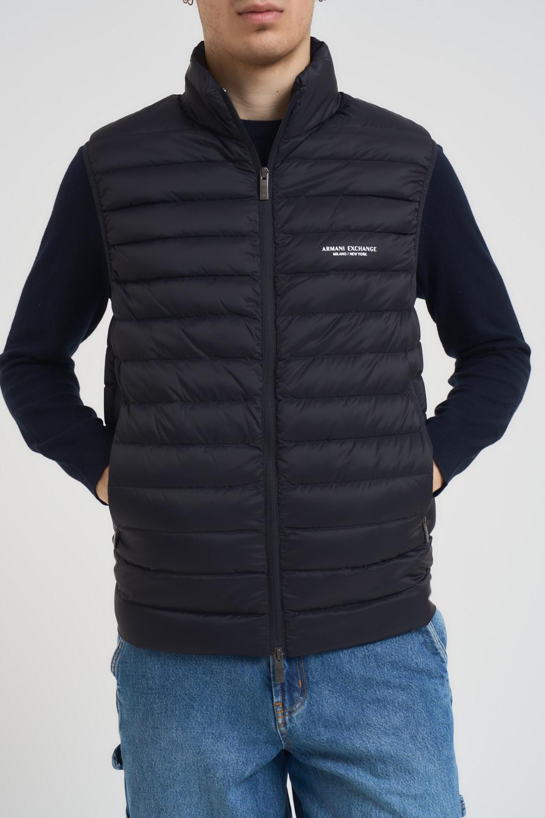 ARMANI EXCHANGE Gilet uomo trapuntato blu scuro. Modello smanicato con imbottitura. Trapunta orizzontale. Vestibilità regular fit. Collo alto. Chiusura frontale con zip e tasche laterali con zip. Dettaglio logo "Armani Exchange Milano / New York" stampato a contrasto sul petto. Composizione: 100% Poliammide. Il modello è alto 190 cm e indossa la taglia L.