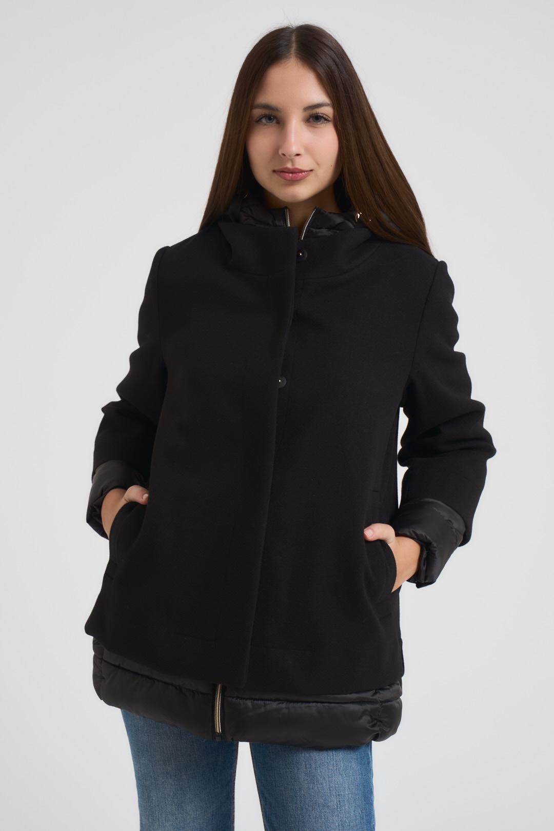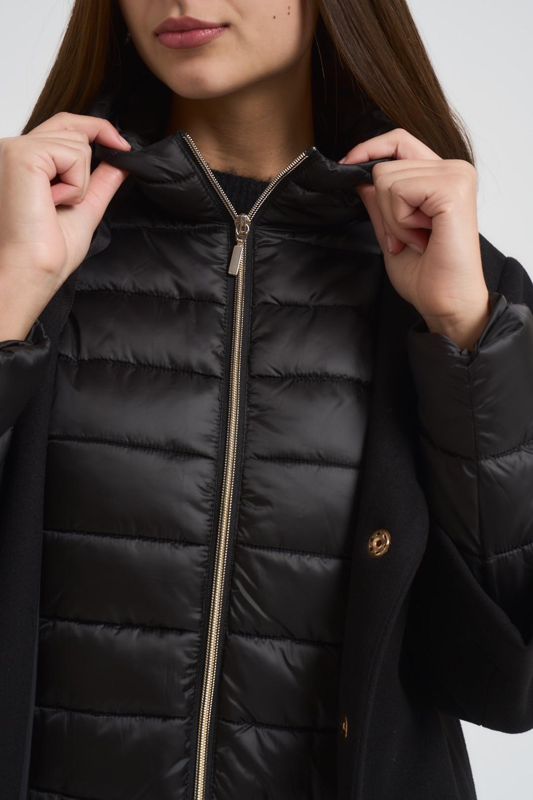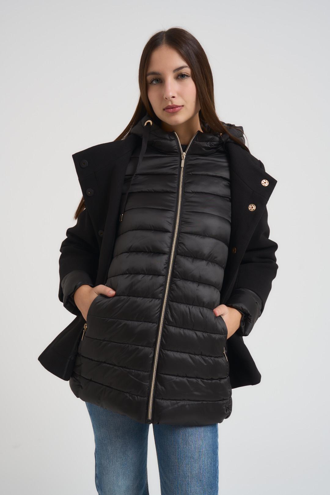 ADIMARI Giubbotto donna con pettorina rimovibile nero. Modello corto. Pettorina con chiusura frontale con bottoni a pressione e manica a tre quarti. Due tasche a filetto. Piumino sottostante con coulisse e cappuccio. Chiusura frontale con zip. Manica lunga. Due tasche con chiusura con zip. Composizione: nylon e poliestere. La modella è alta 176 cm e indossa la taglia S.