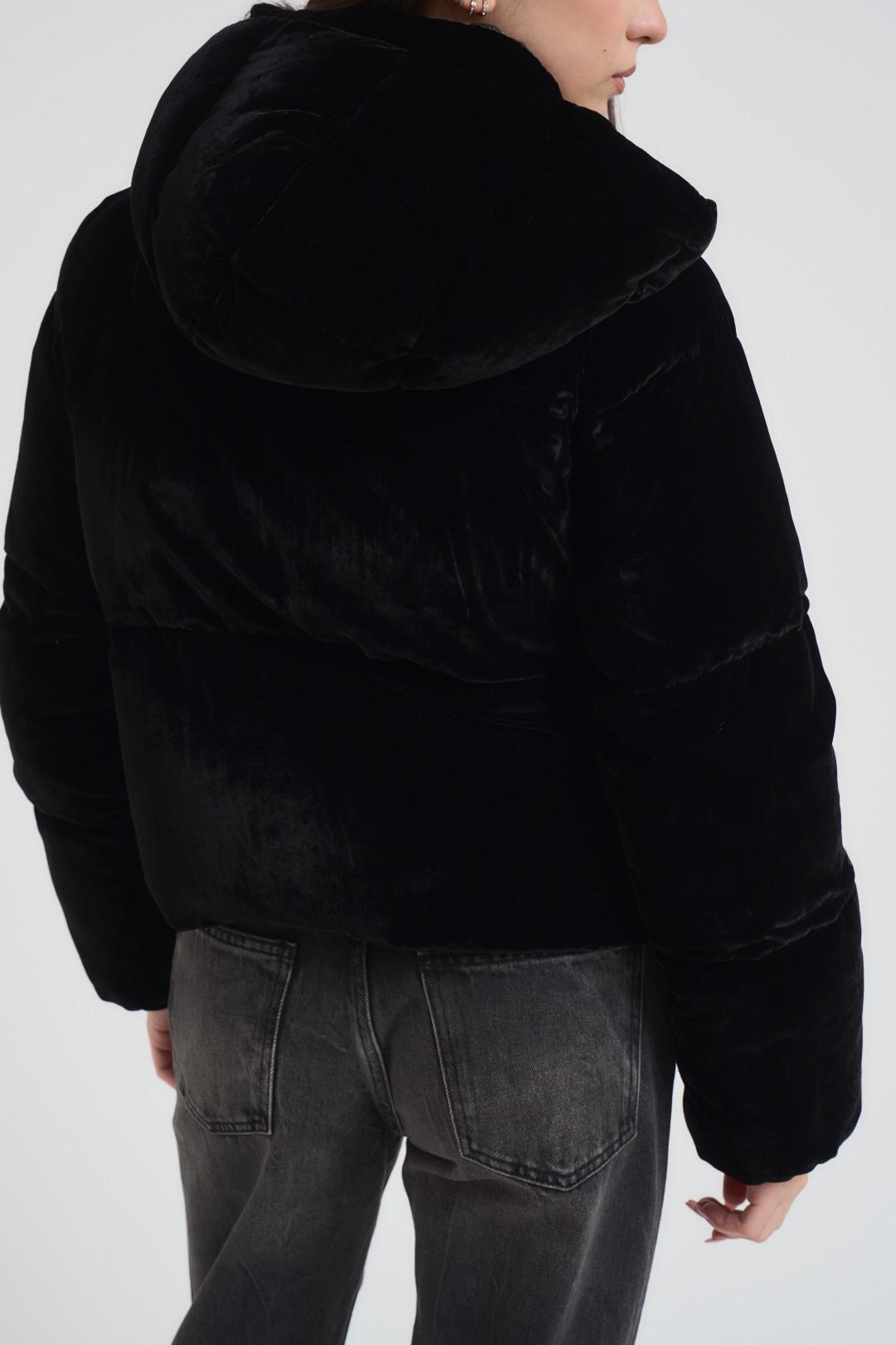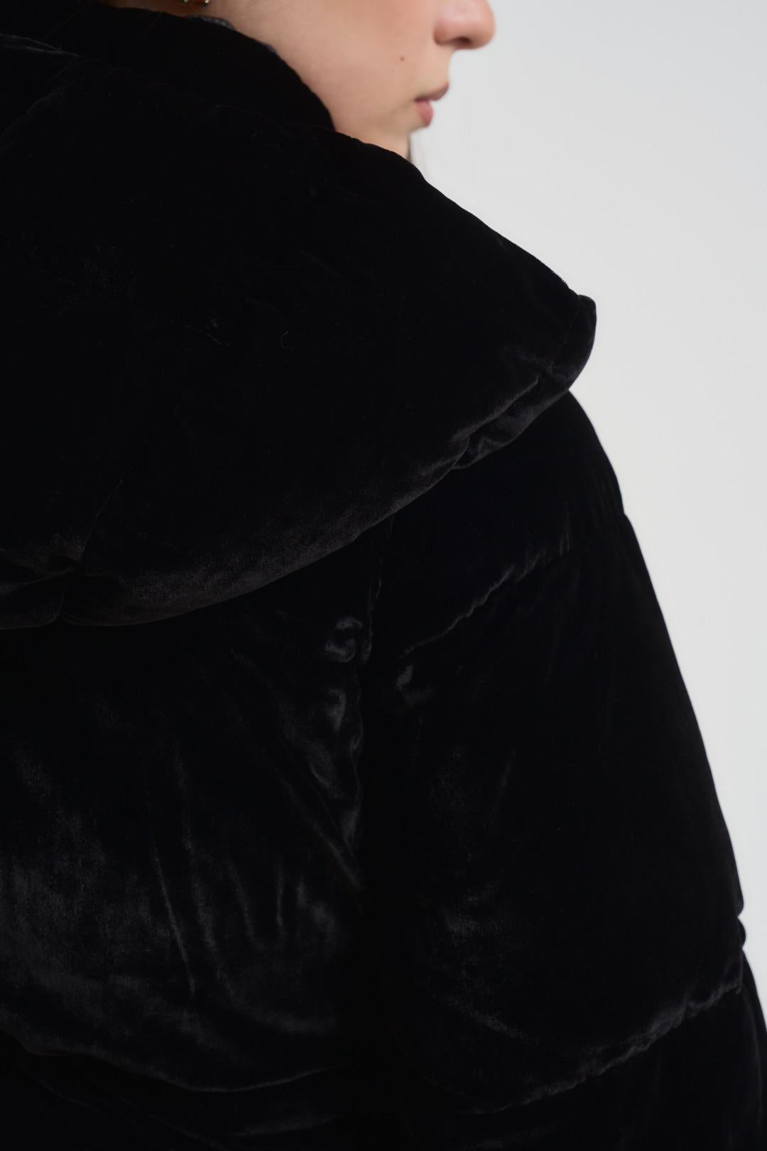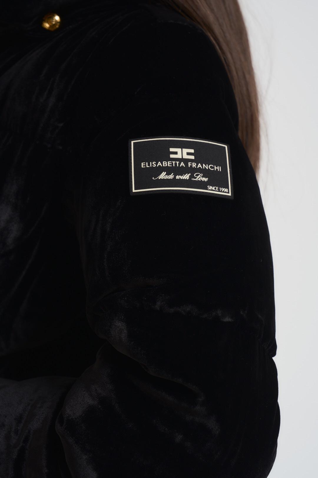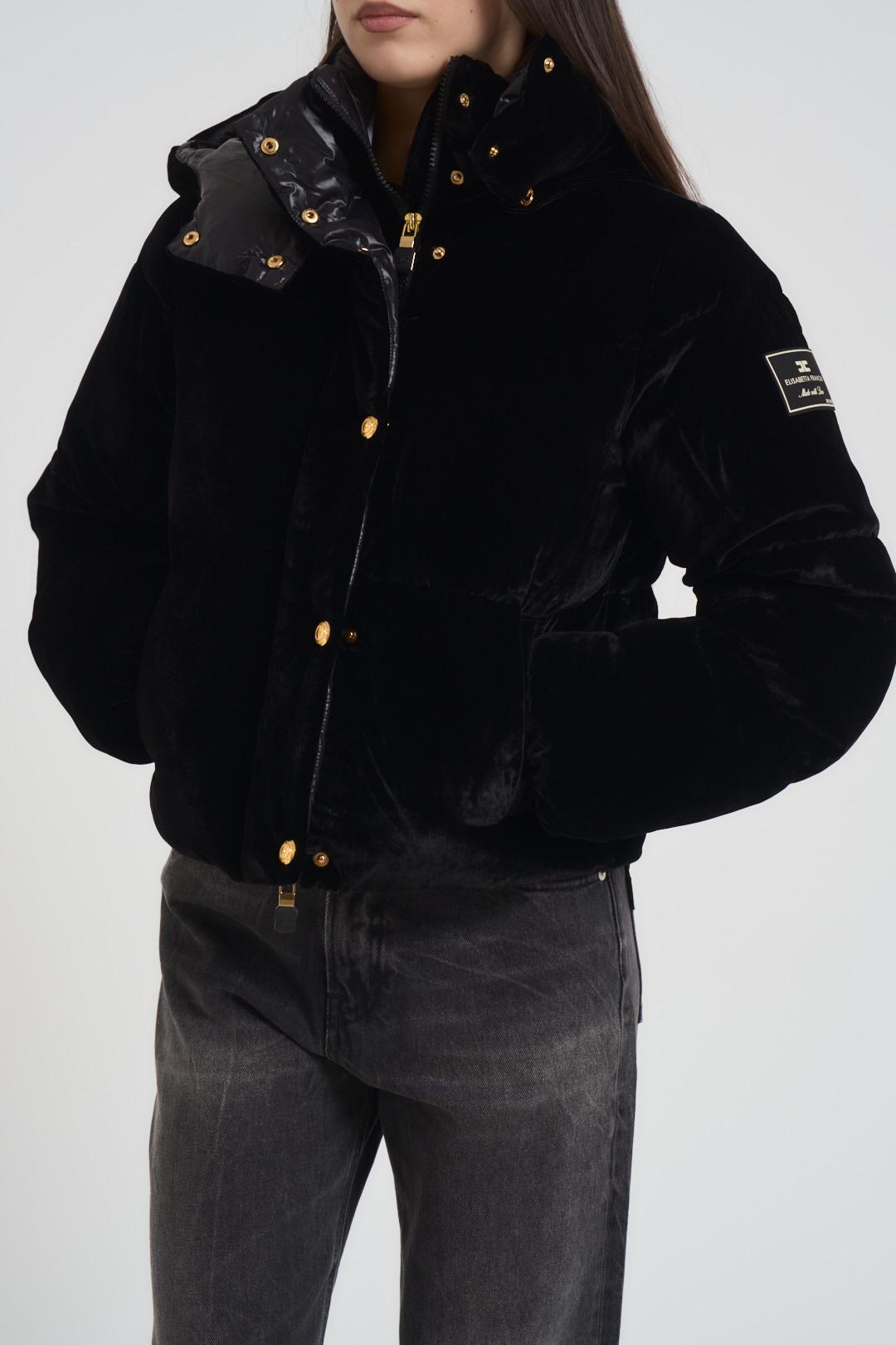 ELISABETTA FRANCHI Giubbotto donna corto in velluto nero. Modello con collo a cratere e cappuccio removibile da bottoni a pressione e zip centrale. Due tasche laterali a filetto. Composizione: poliammide e viscosa. La modella è alta 172cm e indossa la taglia 38.