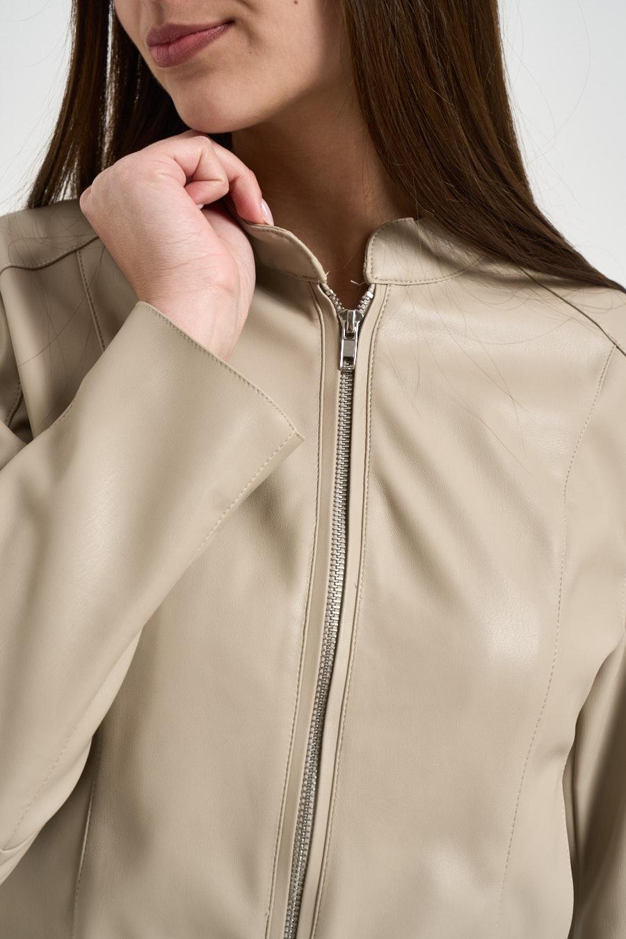 CENSURED Giubbotto donna in ecopelle beige. Modello corto. Chiusura frontale con cerniera. Manica lunga. Vestibilità regolare con linea aderente che valorizza la silhouette. Collo alla coreana. Cuciture strutturate che definiscono il design. Composizione: 100% poliestere. La modella è alta 176 cm e indossa la taglia S.