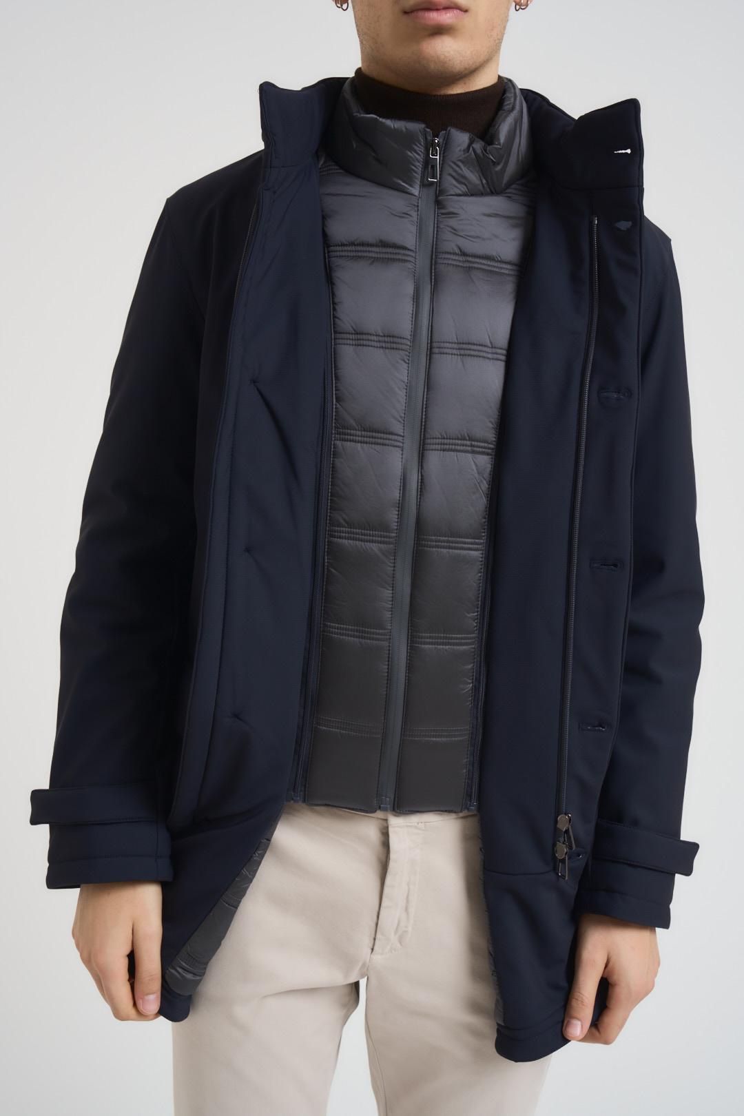 ADIMARI Giubbotto trench midi uomo blu notte. Modello collo alto con pettorina trapuntata removibile da zip, chiusura con bottoni e spacco centrale. Due tasche con pattina laterali e due a filetto sul petto laterali. Composizione: 100% poliestere. Il modello è alto 190cm e indossa la taglia L.