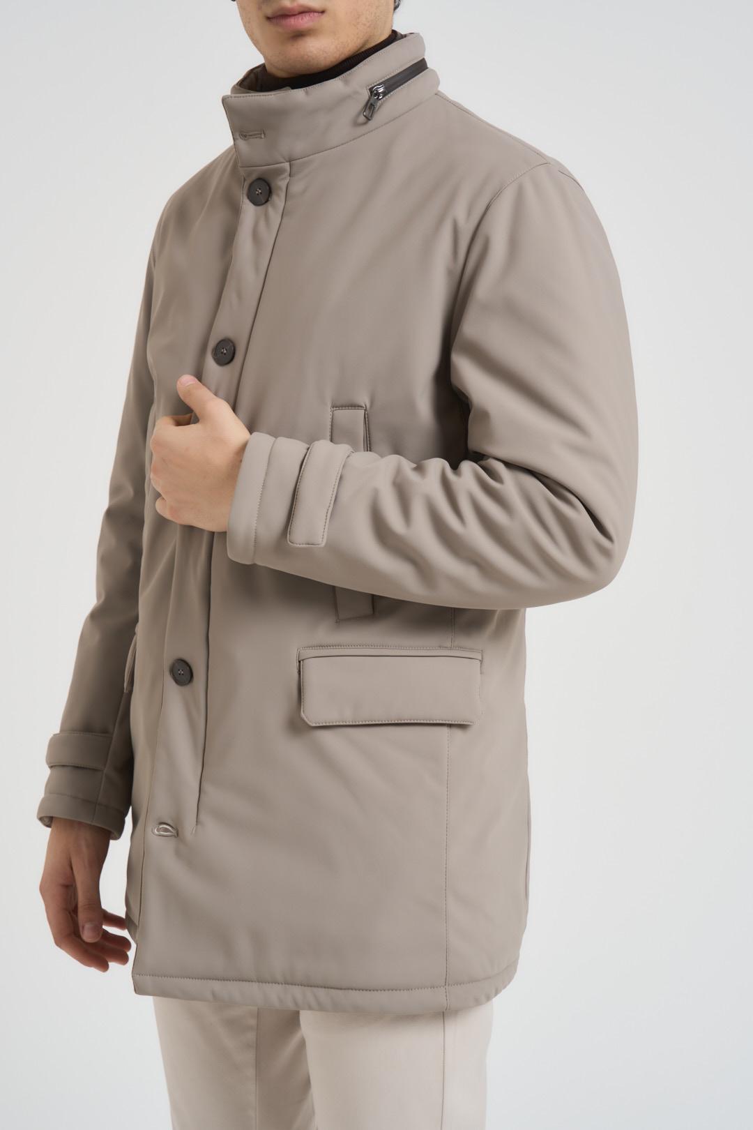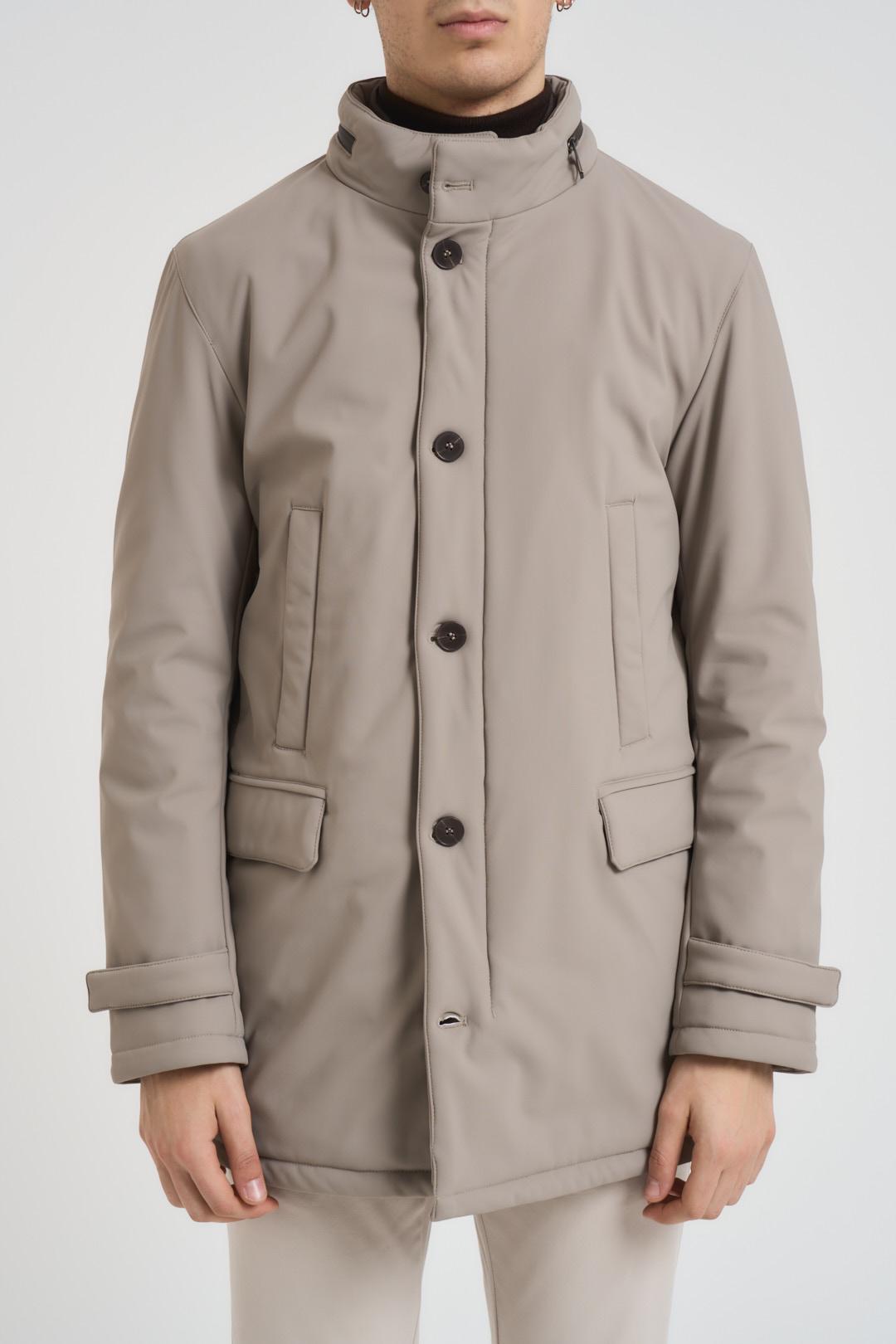ADIMARI Giubbotto trench midi uomo grigio chiaro. Modello collo alto con pettorina trapuntata removibile da zip, chiusura con bottoni e spacco centrale. Due tasche con pattina laterali e due a filetto sul petto laterali. Composizione: 100% poliestere. Il modello è alto 190cm e indossa la taglia L.